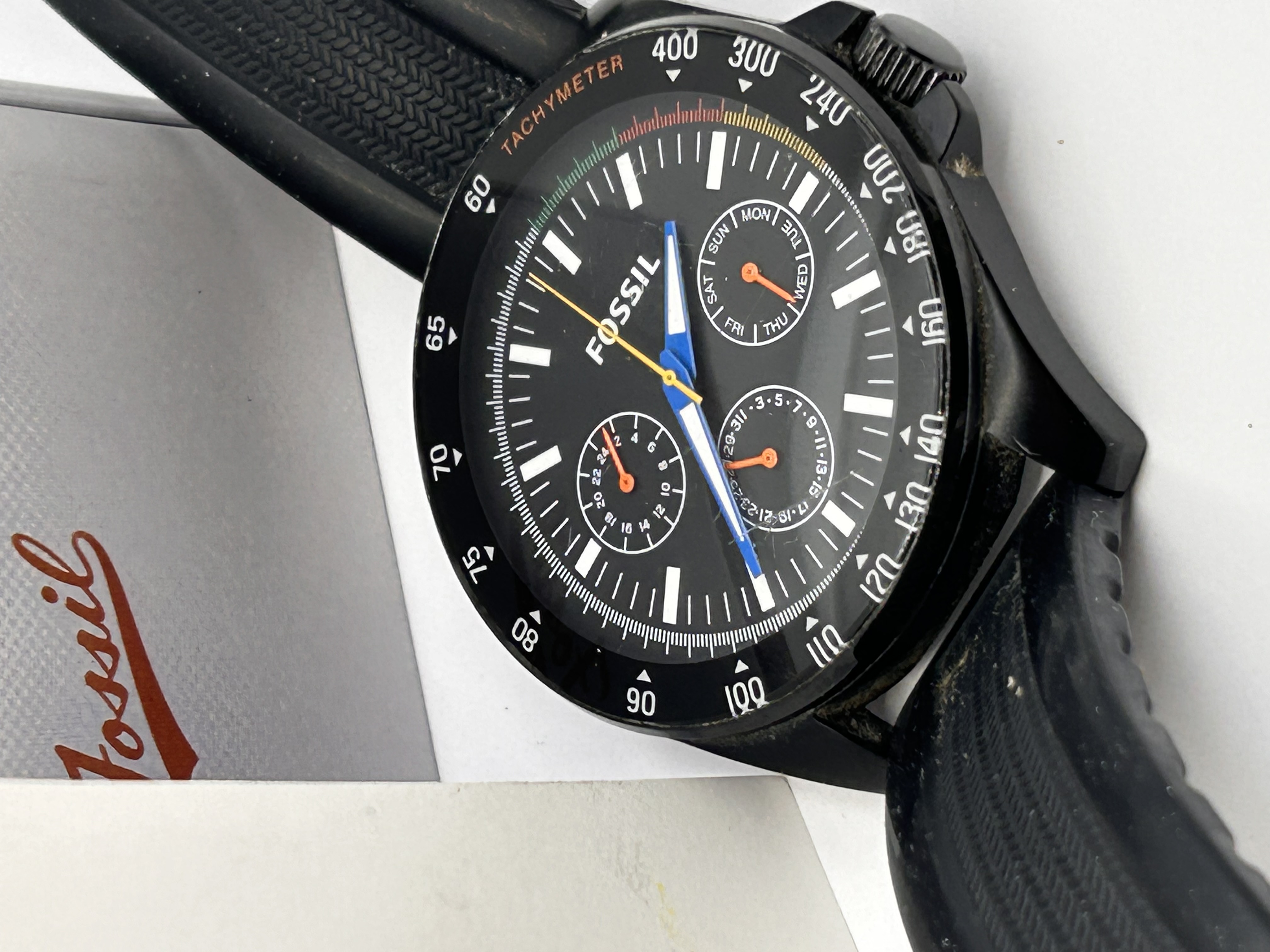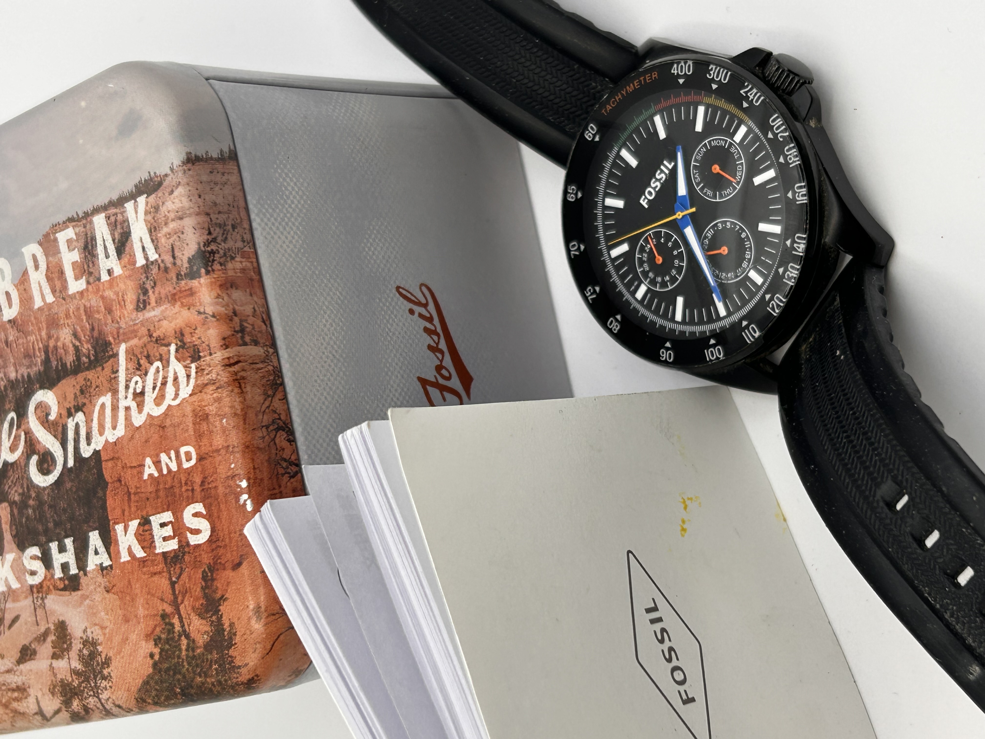 A collection of three items comprising a Fossil multi-function wristwatch, its original packaging tin, and accompanying paperwork. The wristwatch is identified through web consensus as the Fossil BQ2355 model. The watch features a black case and a black dial displaying the Fossil script logo beneath the 12 o’clock position. The dial incorporates three functional sub-dials indicating the date, day of the week, and 24-hour time. The case is fitted with a bezel marked with a TACHYMETER scale. The strap is a textured black rubber or silicone material. The accompanying rectangular metal packaging tin features a rustic canyon-scene graphic on the lid, with partially visible text including BREAK, SnakeS, and SHAKES. The lower gray section of the tin is marked with the Fossil script logo. The third item is a stack of white instruction manuals or warranty paperwork bearing the Fossil logo within a lozenge design.