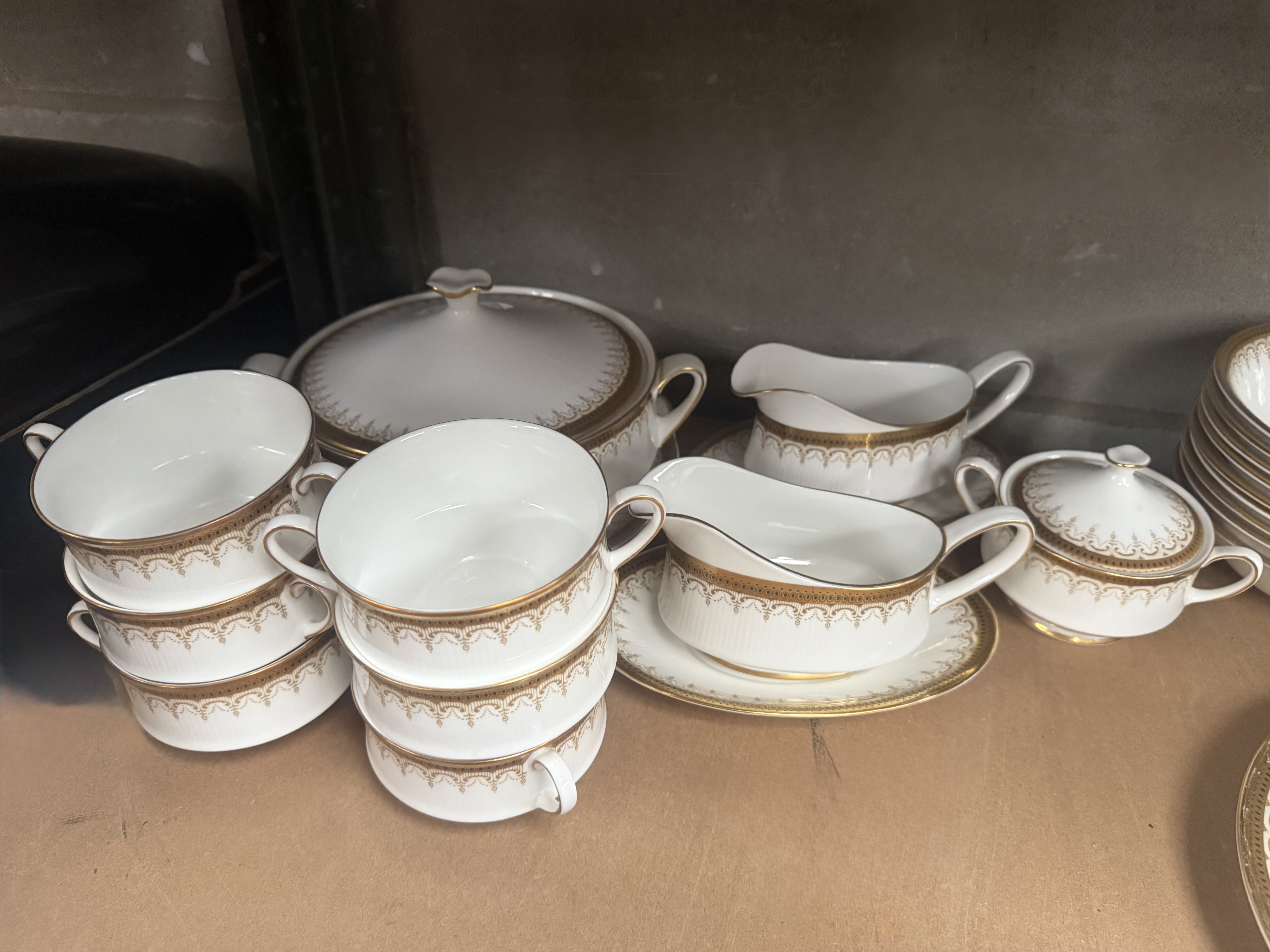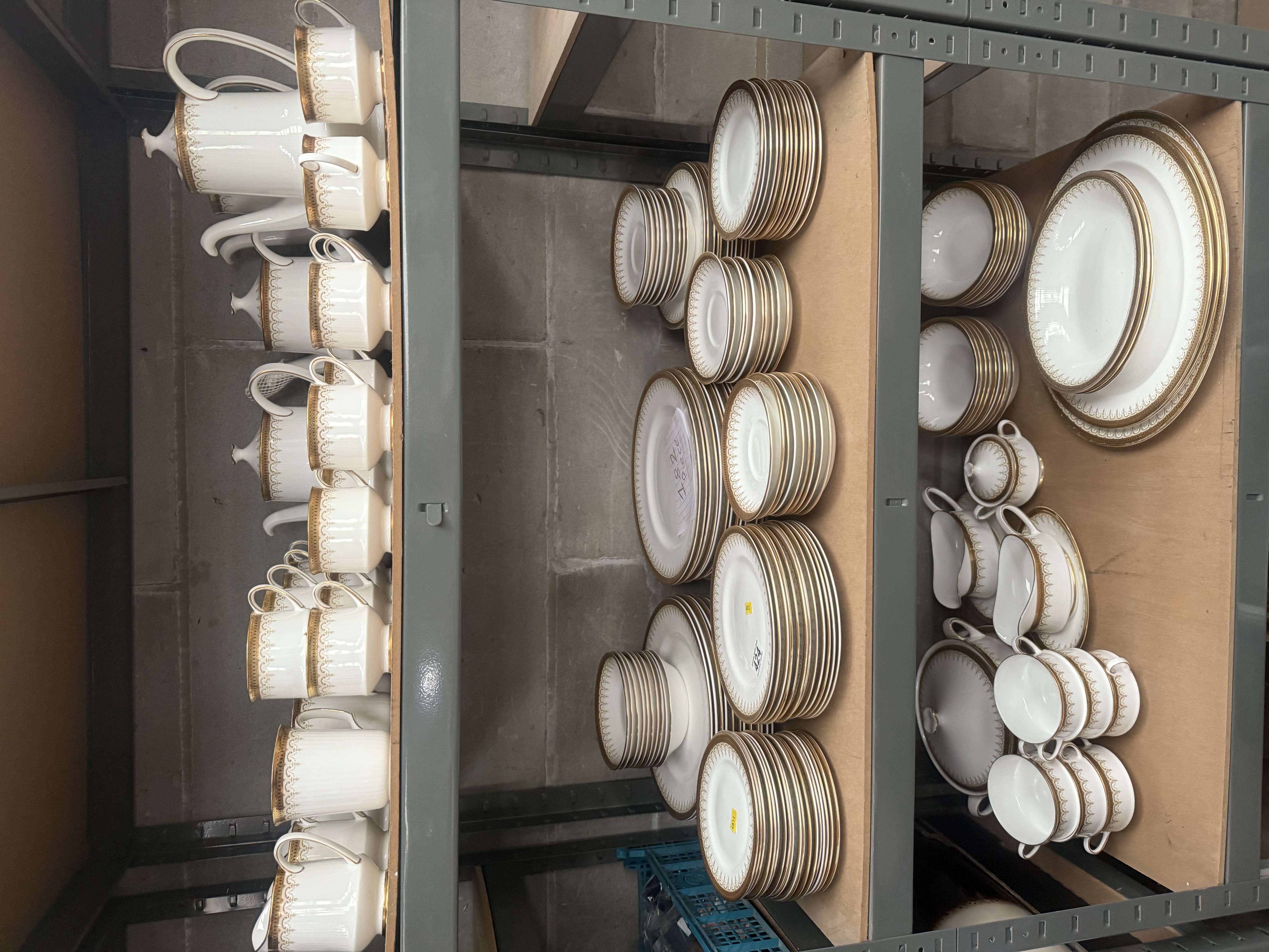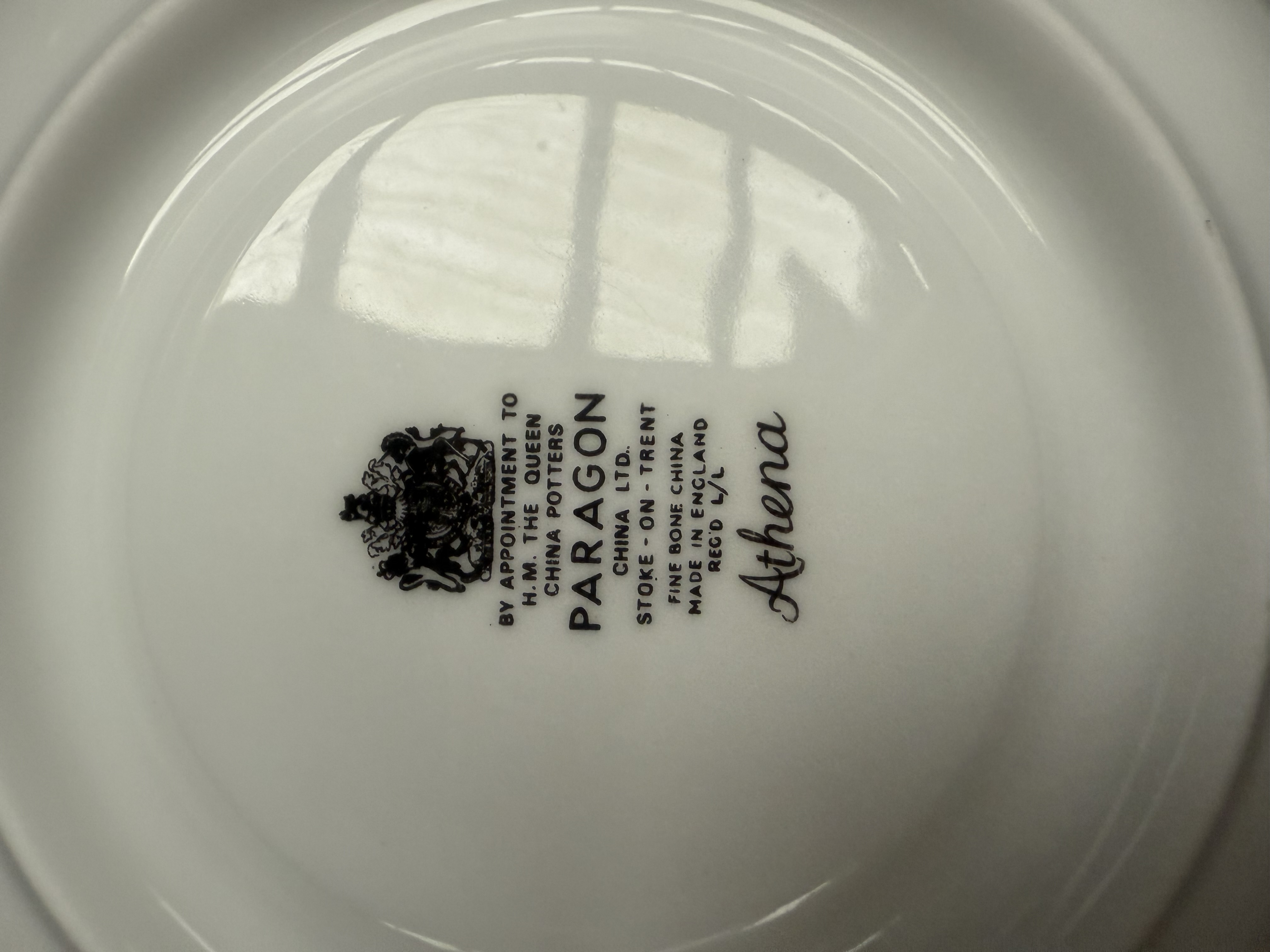 An extensive service of Paragon Fine Bone China in the highly sought-after ‘Athena’ pattern. The collection comprises approximately 131 pieces of dinnerware, teaware, and serving vessels. The material is white bone china, characterized by radially ribbed molding near the rims and decorated with heavy gold gilding forming a complex lacework and scroll border design. The service includes teapots, cups, saucers, various sizes of dinner and luncheon plates, deep bowls, serving platters, gravy boats with underplates, a lidded soup tureen, and handled soup cups. The backstamp visible on the underside confirms the manufacturer and pattern, reading: “By Appointment to H.M. The Queen China Potters, Paragon China Ltd., Stoke-on-Trent, Fine Bone China, Made in England,” confirming its production under a Royal Warrant.
