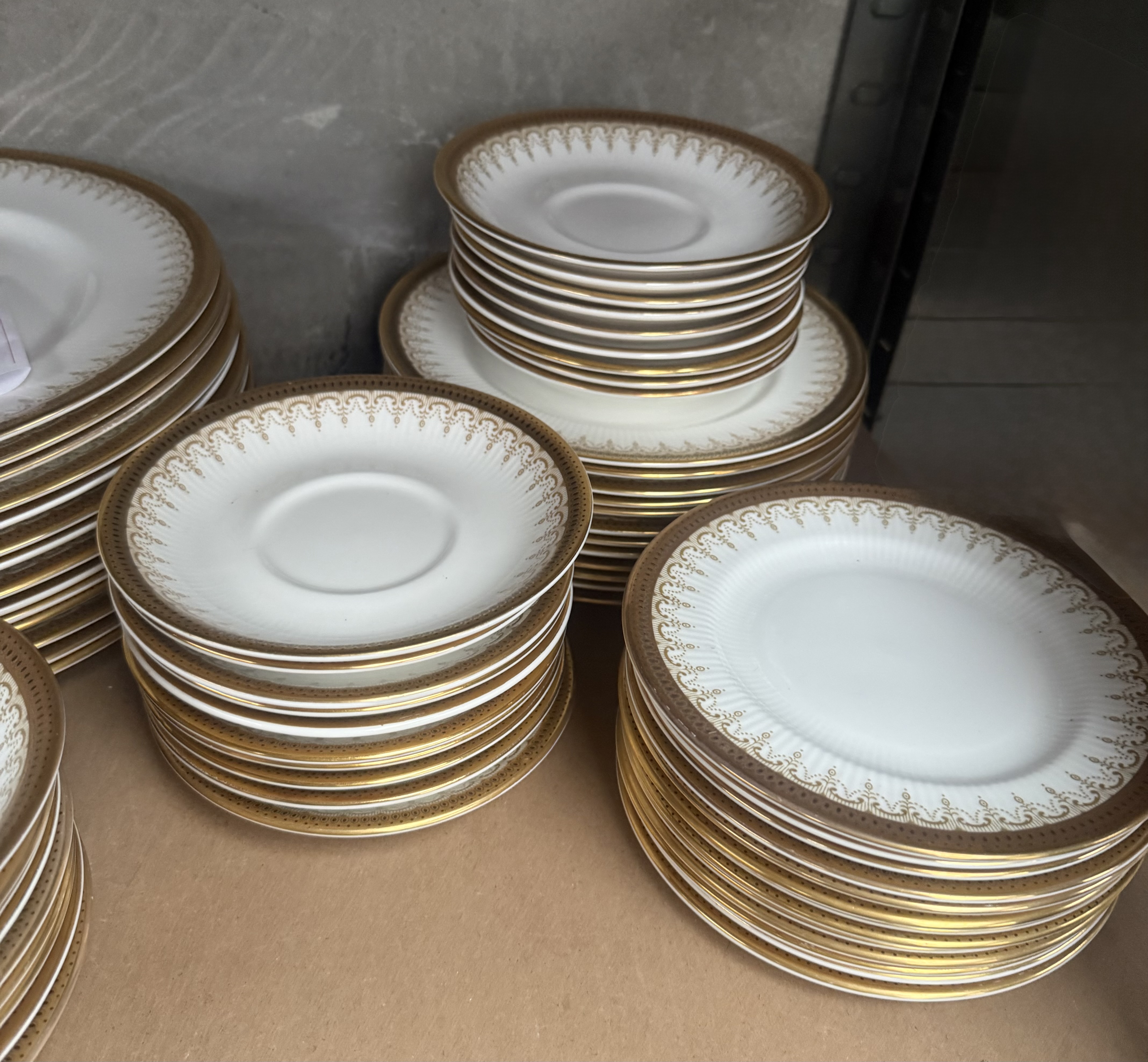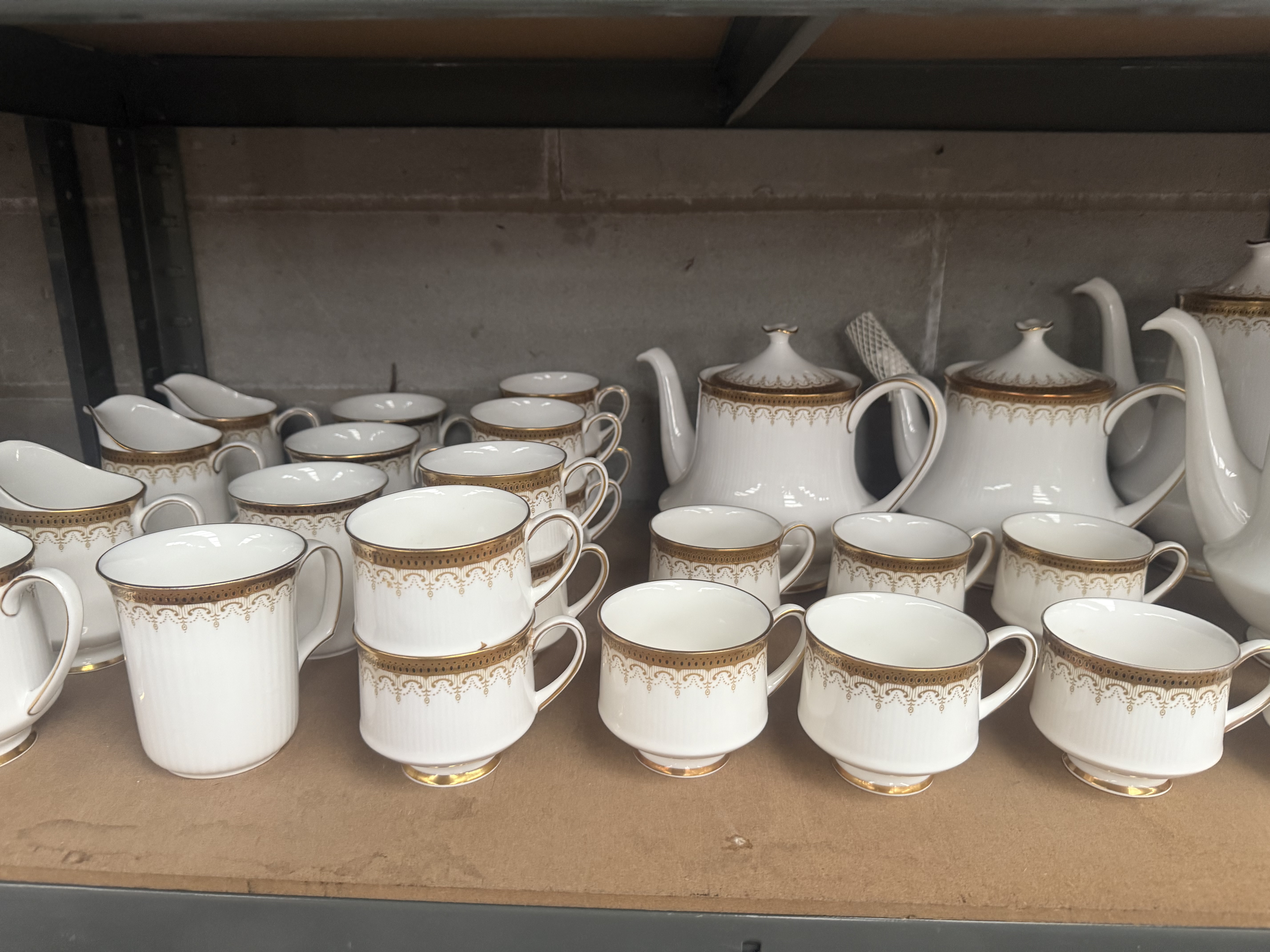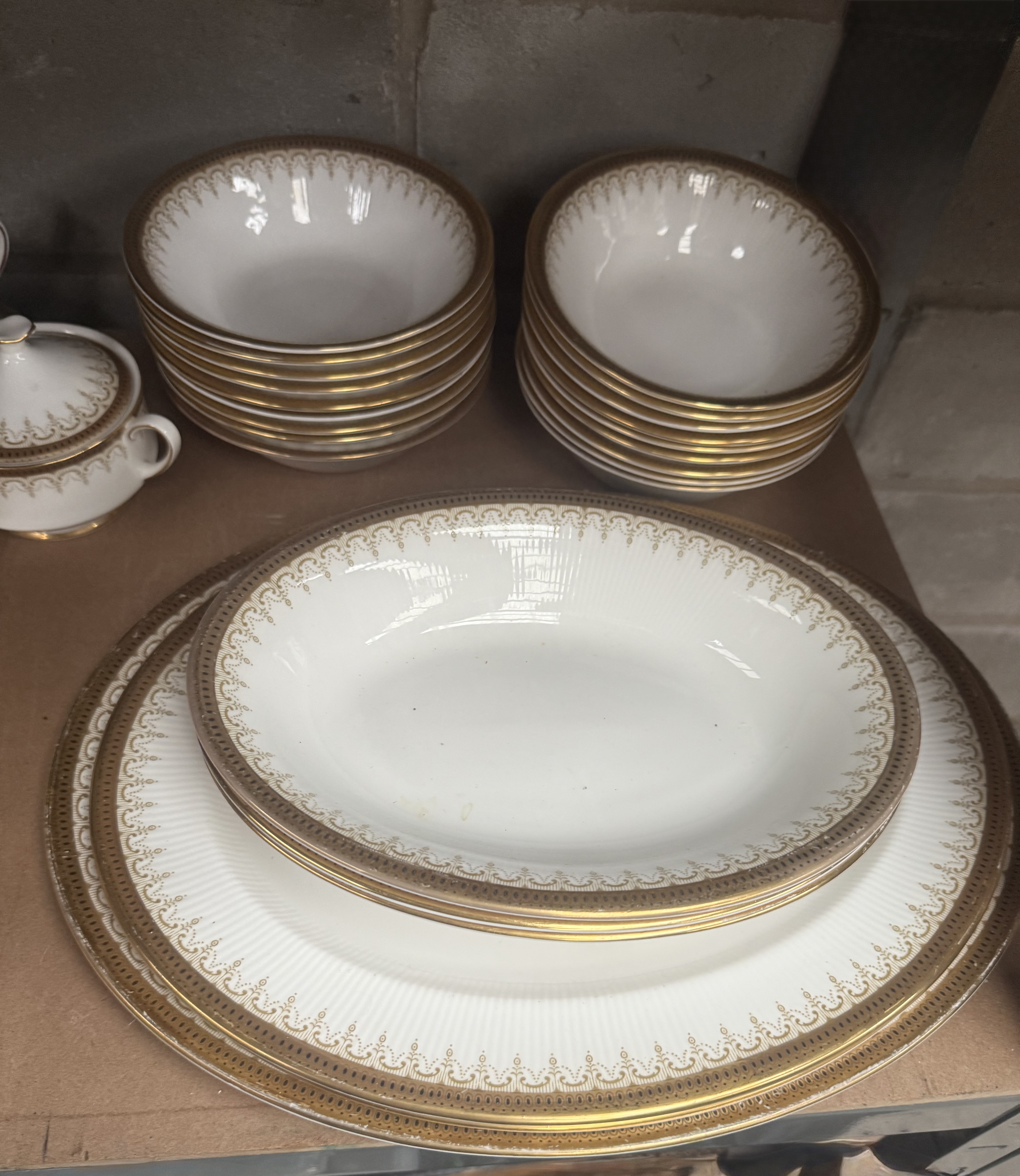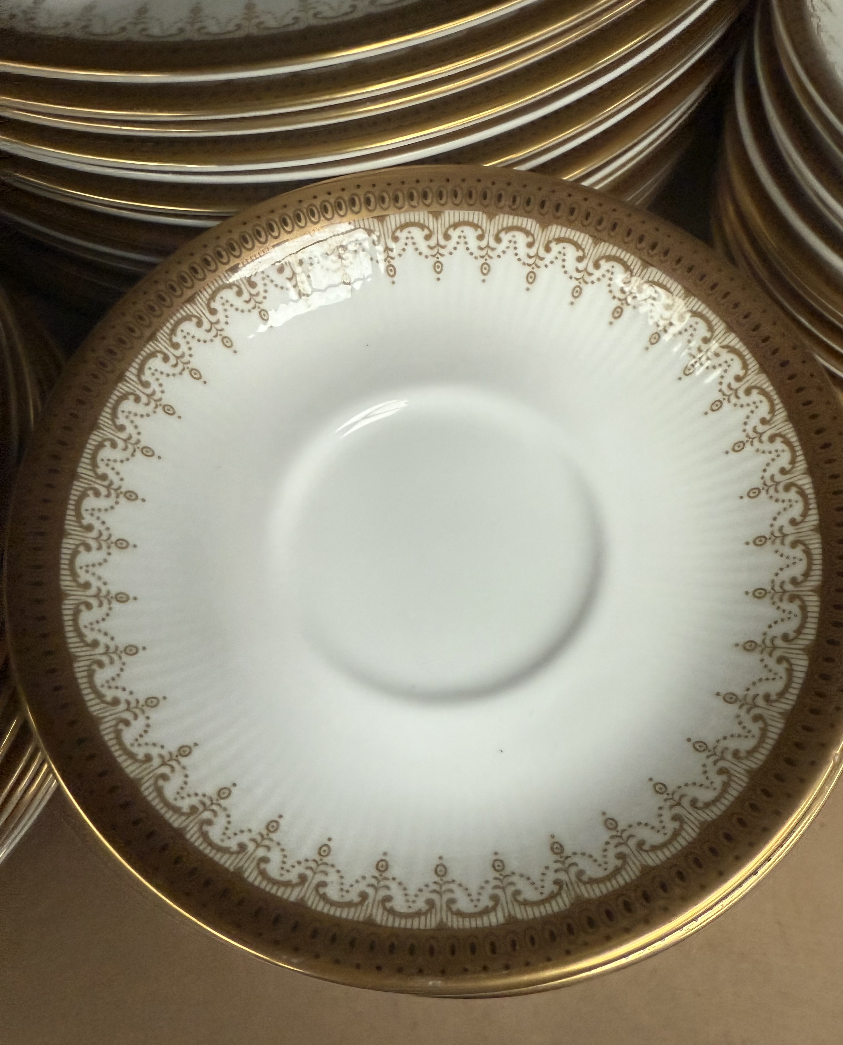 An extensive service of Paragon Fine Bone China in the highly sought-after ‘Athena’ pattern. The collection comprises approximately 131 pieces of dinnerware, teaware, and serving vessels. The material is white bone china, characterized by radially ribbed molding near the rims and decorated with heavy gold gilding forming a complex lacework and scroll border design. The service includes teapots, cups, saucers, various sizes of dinner and luncheon plates, deep bowls, serving platters, gravy boats with underplates, a lidded soup tureen, and handled soup cups. The backstamp visible on the underside confirms the manufacturer and pattern, reading: “By Appointment to H.M. The Queen China Potters, Paragon China Ltd., Stoke-on-Trent, Fine Bone China, Made in England,” confirming its production under a Royal Warrant.