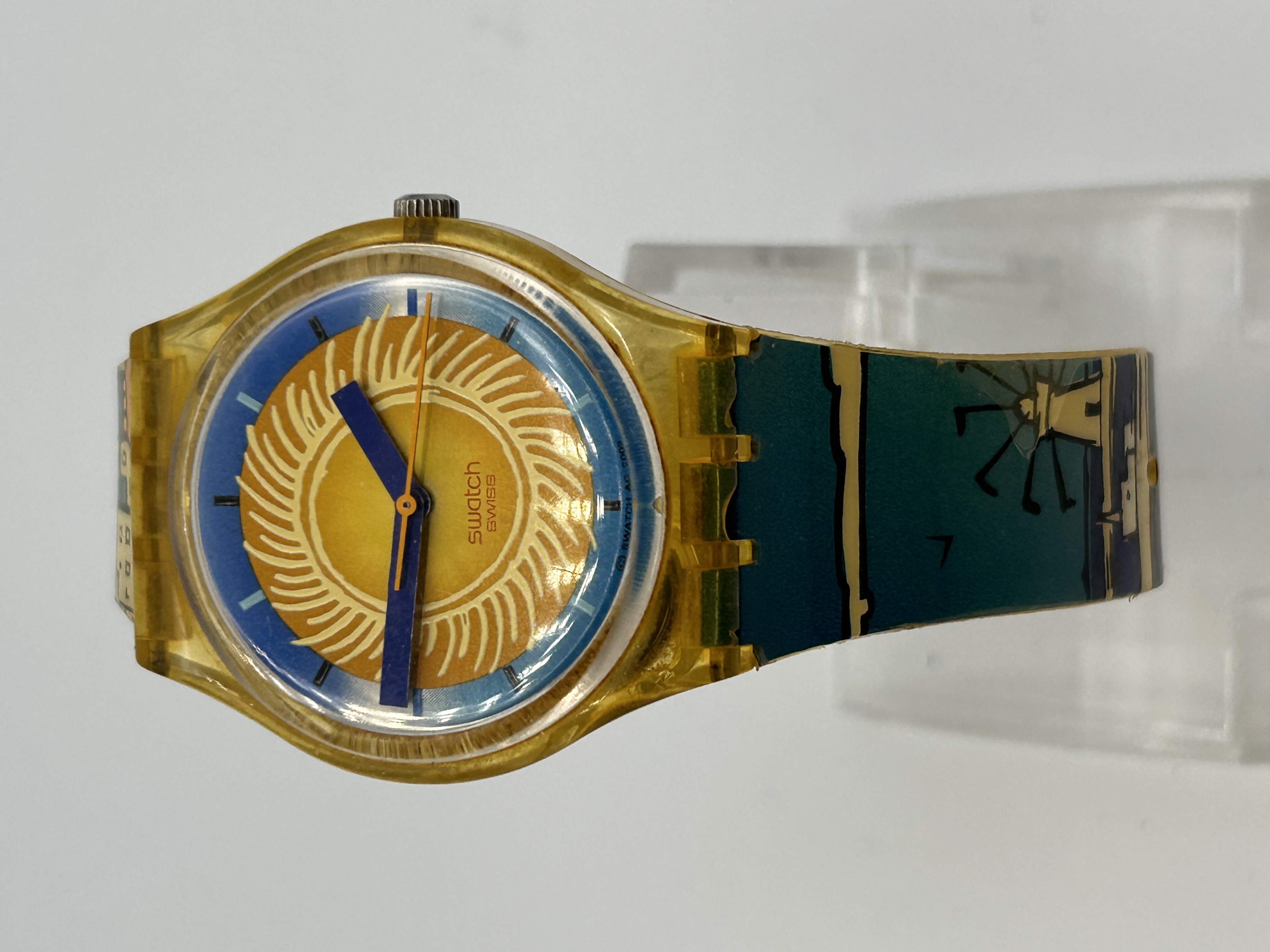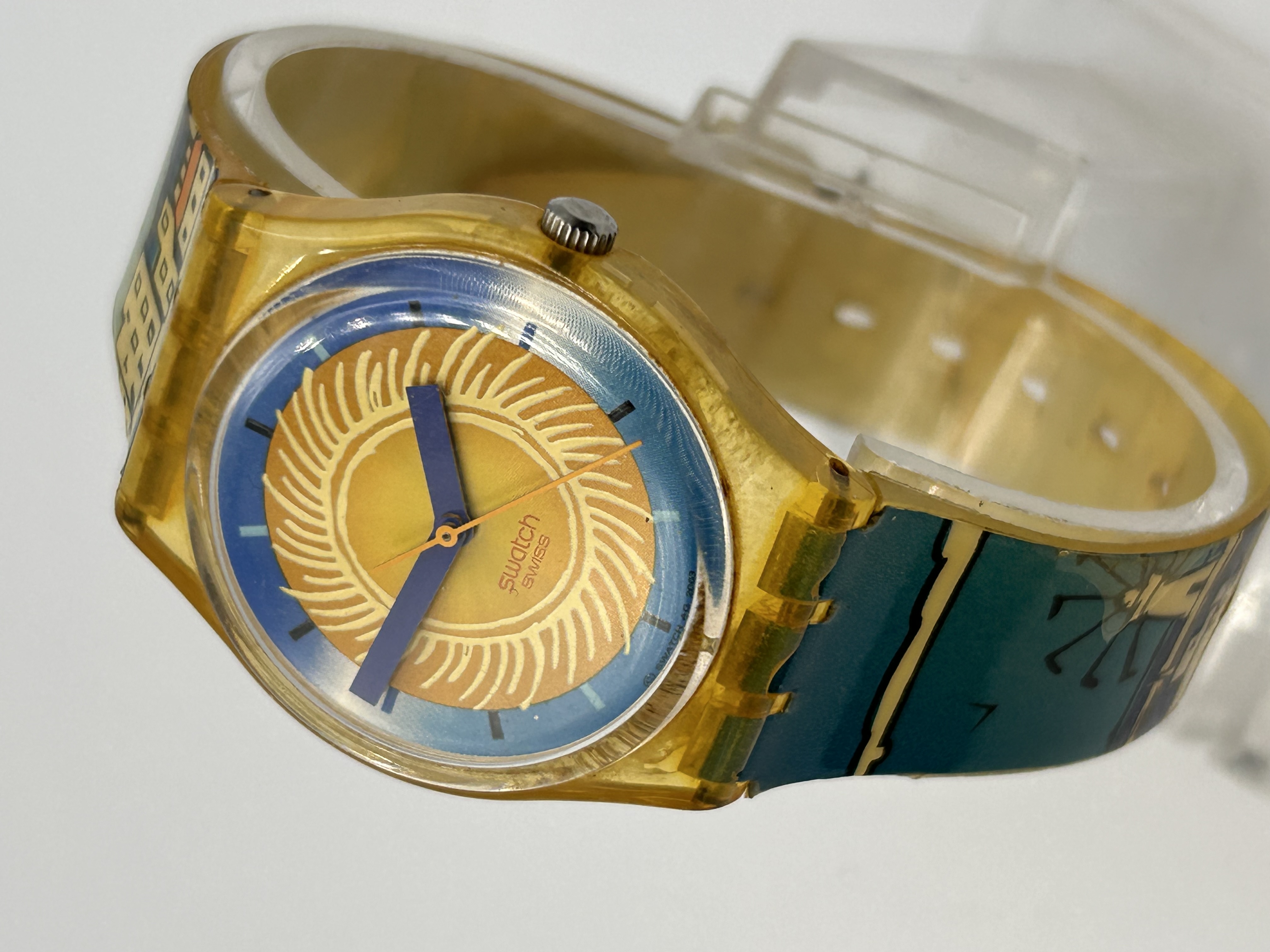 A Swatch GK140 “Blue Anchorage” quartz wristwatch, identified through market consensus as dating to the early 1990s (c. 1991-1992). The watch features a translucent yellow plastic case and a pictorial plastic band. The dial displays a stylized sun graphic in yellow and orange radial patterns set against a blue field. The dial is marked “swatch SWISS” below the central axis. The watch is fitted with broad blue hour and minute hands. The attached plastic band displays a complex landscape scene incorporating dark teal and green backgrounds with white stylized elements, including motifs resembling windmills and golf flags.