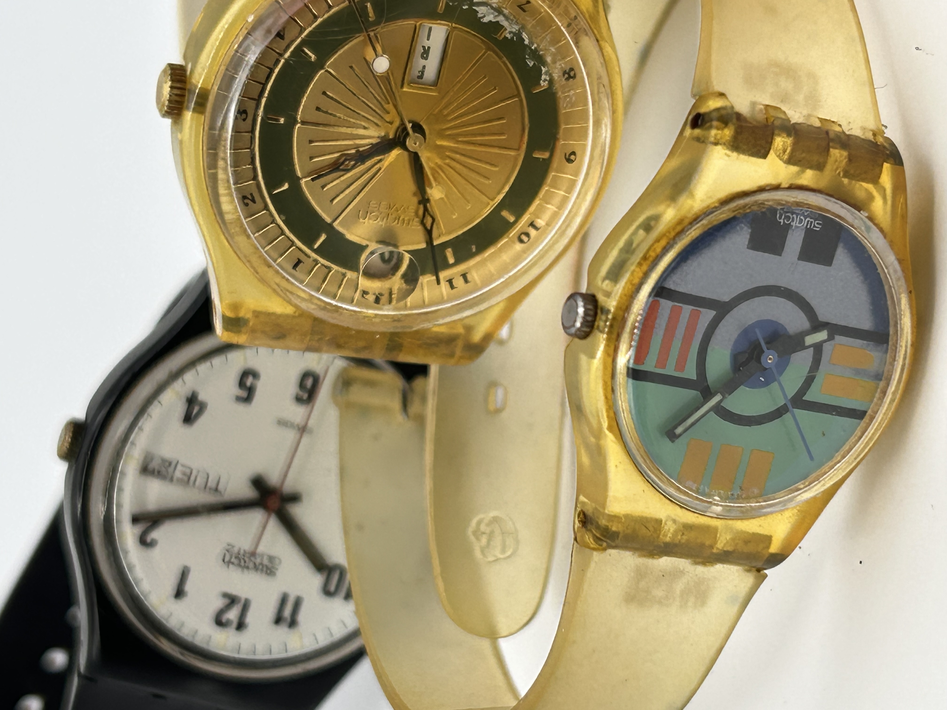 A collection of three vintage Swatch analog wristwatches, constructed primarily of plastic and resin materials. The lot includes the identified Swatch GK715 MOOS model, circa 1994-1995, featuring a gold-toned radial dial, gold-toned plastic case, and a date/day window currently displaying FRI 1. The strap and case of this model exhibit significant yellowing and material degradation consistent with age. A second watch in the foreground features a translucent yellowed plastic case and strap with an abstract, geometric multi-colored dial. The third watch, positioned in the background, features a black plastic case and strap with a white dial displaying large black Arabic numerals and a day/date window currently set to TUE 12. All dials are inscribed swatch.