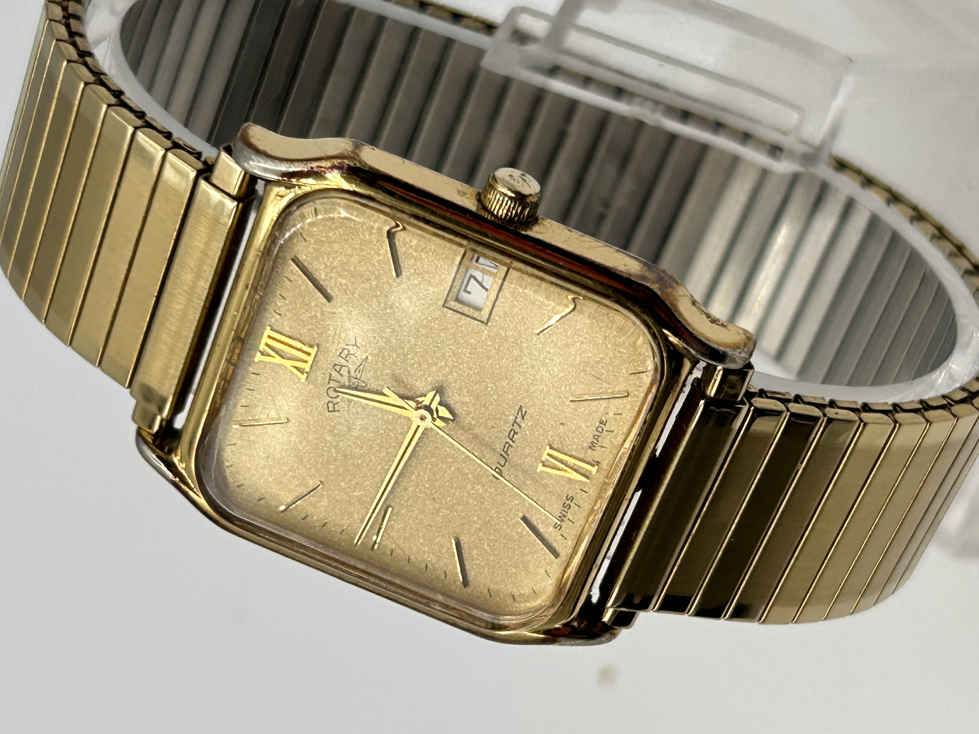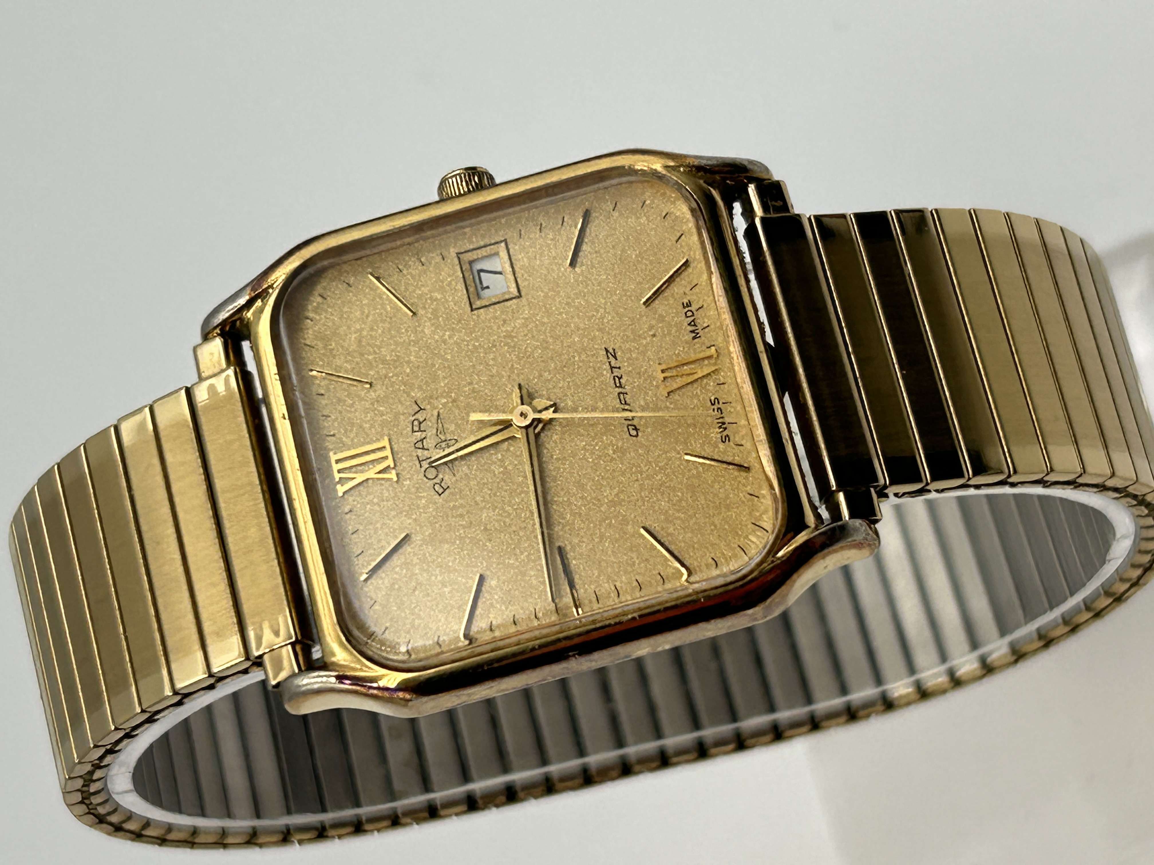 A gentleman’s gold-toned quartz wristwatch by Rotary. The watch features a rectangular or squared-off tonneau case housing a champagne-colored, textured dial. The dial is marked with applied gold-toned baton indices, with Roman numerals present at the 12 (XII) and 6 (VI) positions. It utilizes a three-hand display (hour, minute, second) and includes a date aperture located at the 3 o’clock position, currently displaying the number ‘7’. Visible text on the dial includes ROTARY, QUARTZ, and SWISS MADE. The watch is fitted with an integrated gold-toned expansion stretch bracelet.
