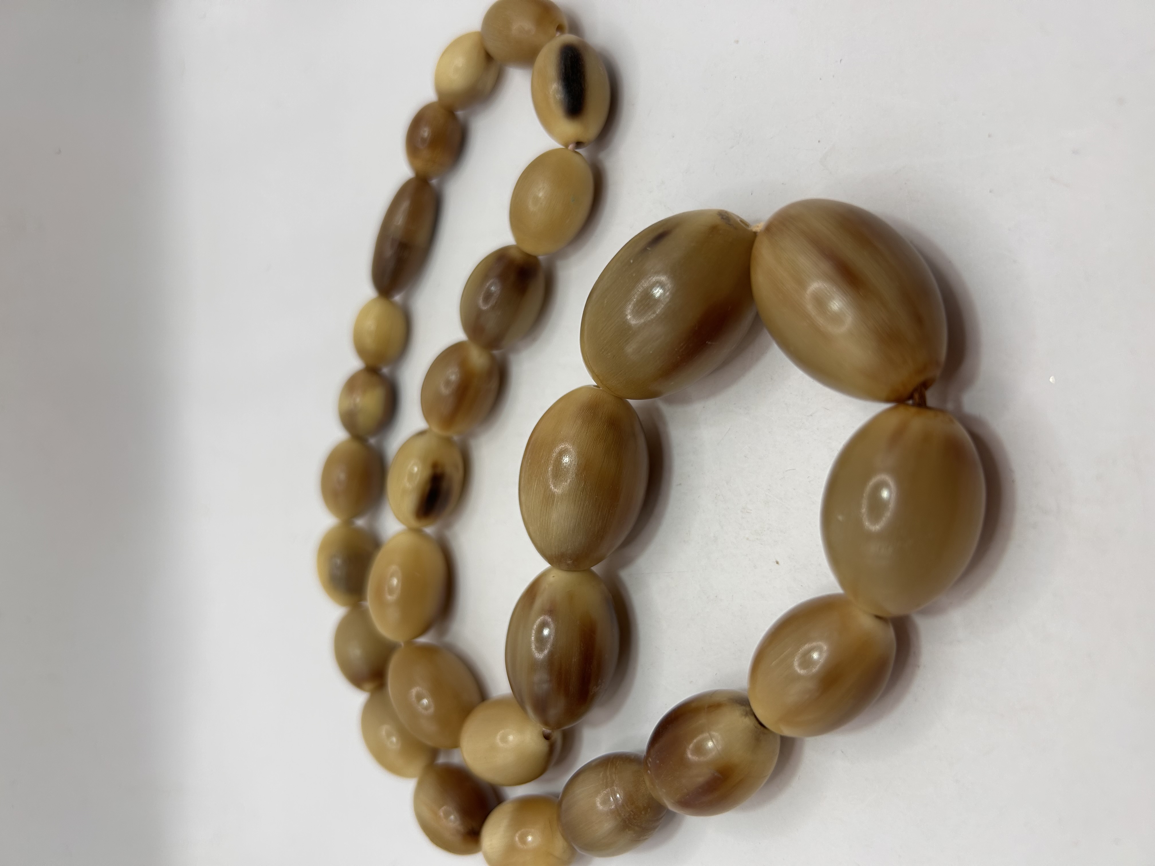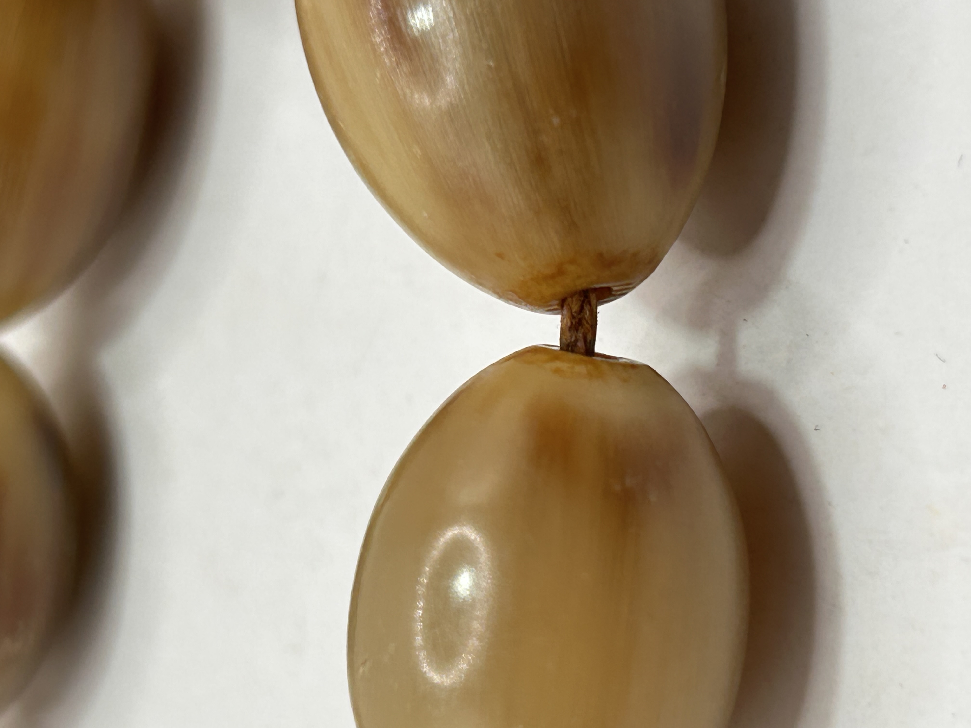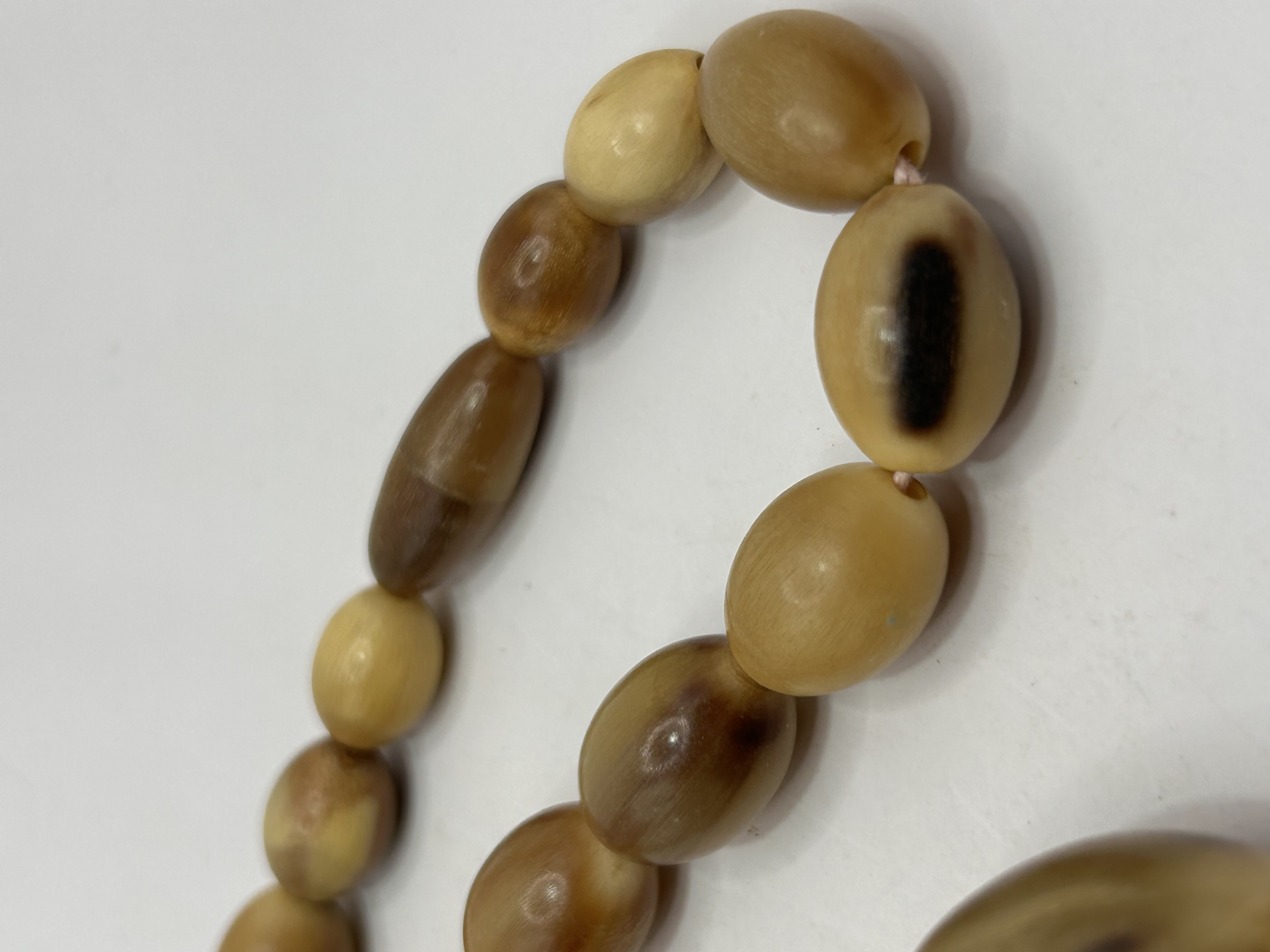 A necklace composed of 30 individually carved, graduated beads strung on a dark cord. The beads are oval or barrel-shaped and highly polished. The material appears to be natural buffalo horn or a similar organic substance, characterized by striking natural variegation in color, ranging from creamy tan and pale yellow to deep chocolate brown, with natural dark inclusions visible on some beads. The beads are arranged in a graduated manner, with the largest beads positioned at the center front, tapering significantly towards the back closure area. No identifying text, stamps, or markings are visible.
