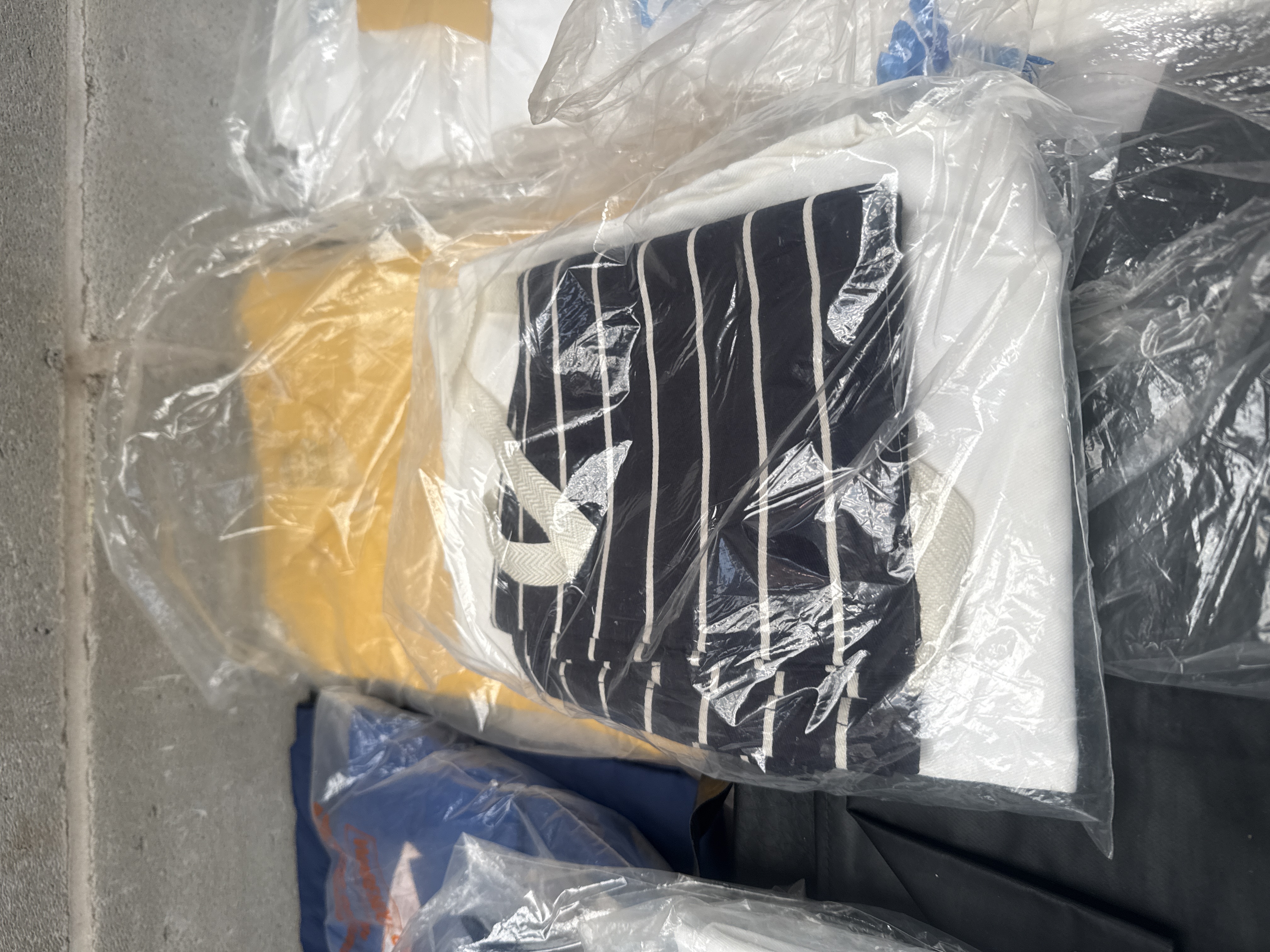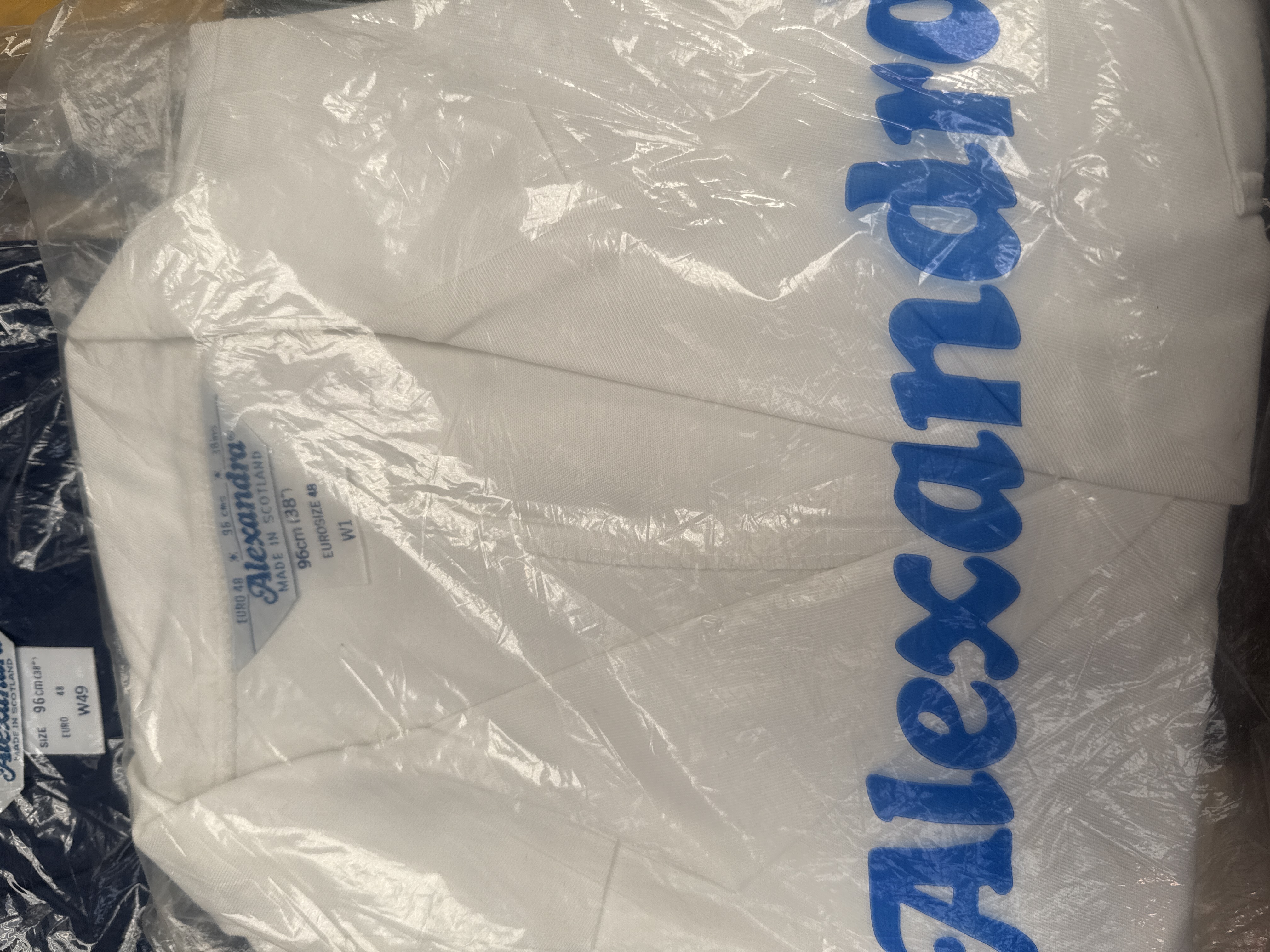 A collection of 10 items of Alexandra professional workwear apparel, New Old Stock (NOS). The lot includes various tops and uniform pieces, such as potential lab coats (based on collar structure visible through packaging). The garments are manufactured by Alexandra, with neck labels clearly stating “Alexandra, MADE IN SCOTLAND.” The collection features multiple colorways, including predominant white, navy blue, yellow/gold, and a navy and white horizontal stripe pattern. Visible sizing tags indicate metric and imperial measurements, such as “96CM (38″)” and “EURO 48.” The textiles appear to be poly/cotton blends typical of standard industrial or professional workwear.