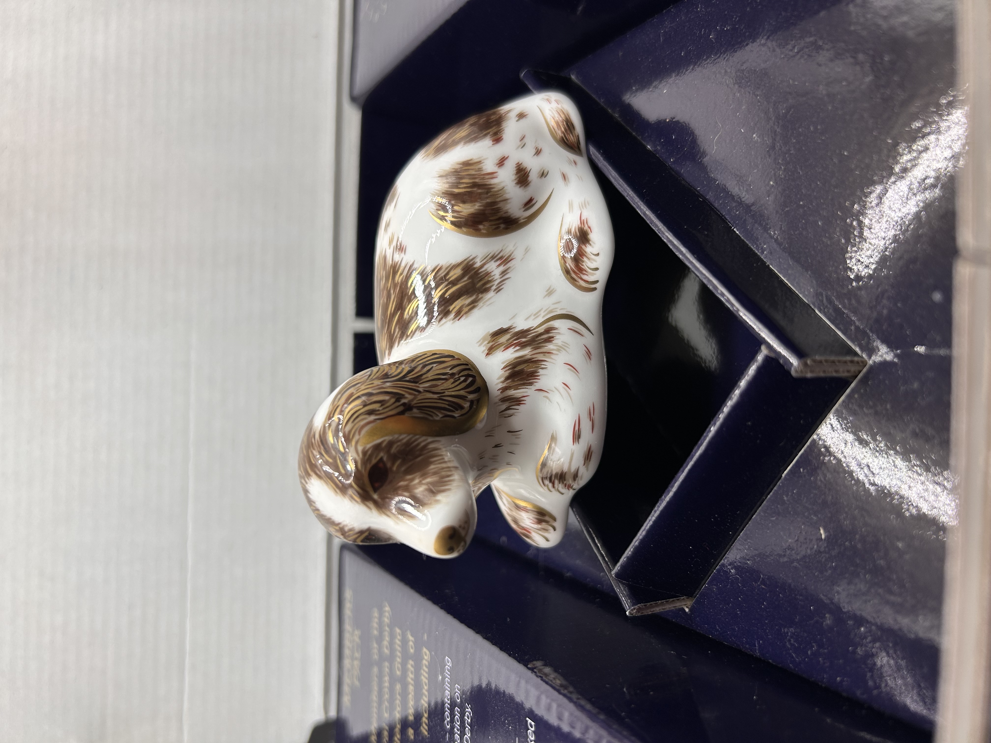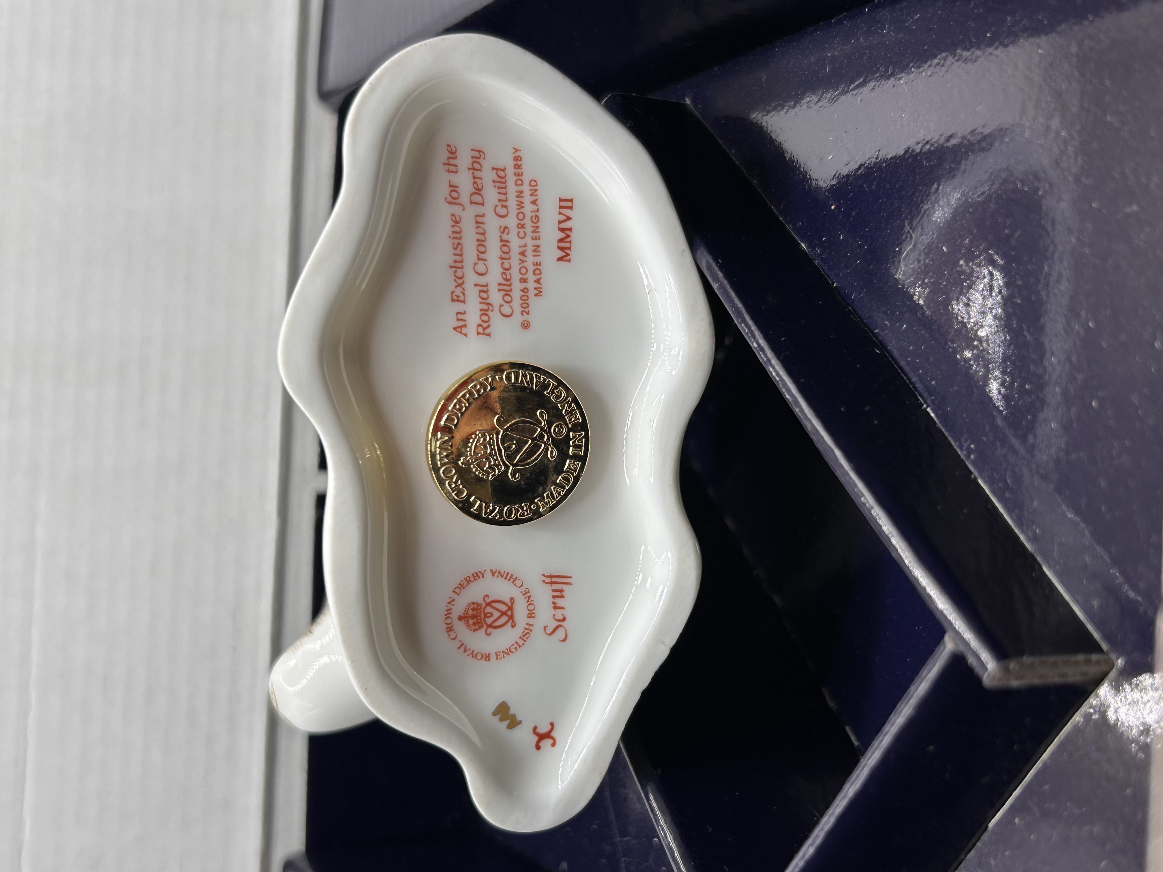 A single Royal Crown Derby bone china figurine, identified as “Scruff,” depicting a recumbent spaniel puppy. The piece is decorated with hand-painted russet and brown patches over a white ground, accented by extensive gold gilding. Research confirms this model is often referred to as a paperweight and was issued as an exclusive gift for the Royal Crown Derby Collectors Guild Members Pack. The underside features the red printed Royal Crown Derby backstamp reading “ENGLISH BONE CHINA,” “An Exclusive for the Royal Crown Derby Collectors Guild,” and the copyright date “© 2004 ROYAL CROWN DERBY.” The production date “MMVII” (2007) is also marked. An inlaid gold-toned medallion stamped “ROYAL CROWN DERBY MADE IN ENGLAND” is present in the base. The figurine is presented in its original navy blue fitted presentation packaging, marked relating to a “MEMBERS PACK.”