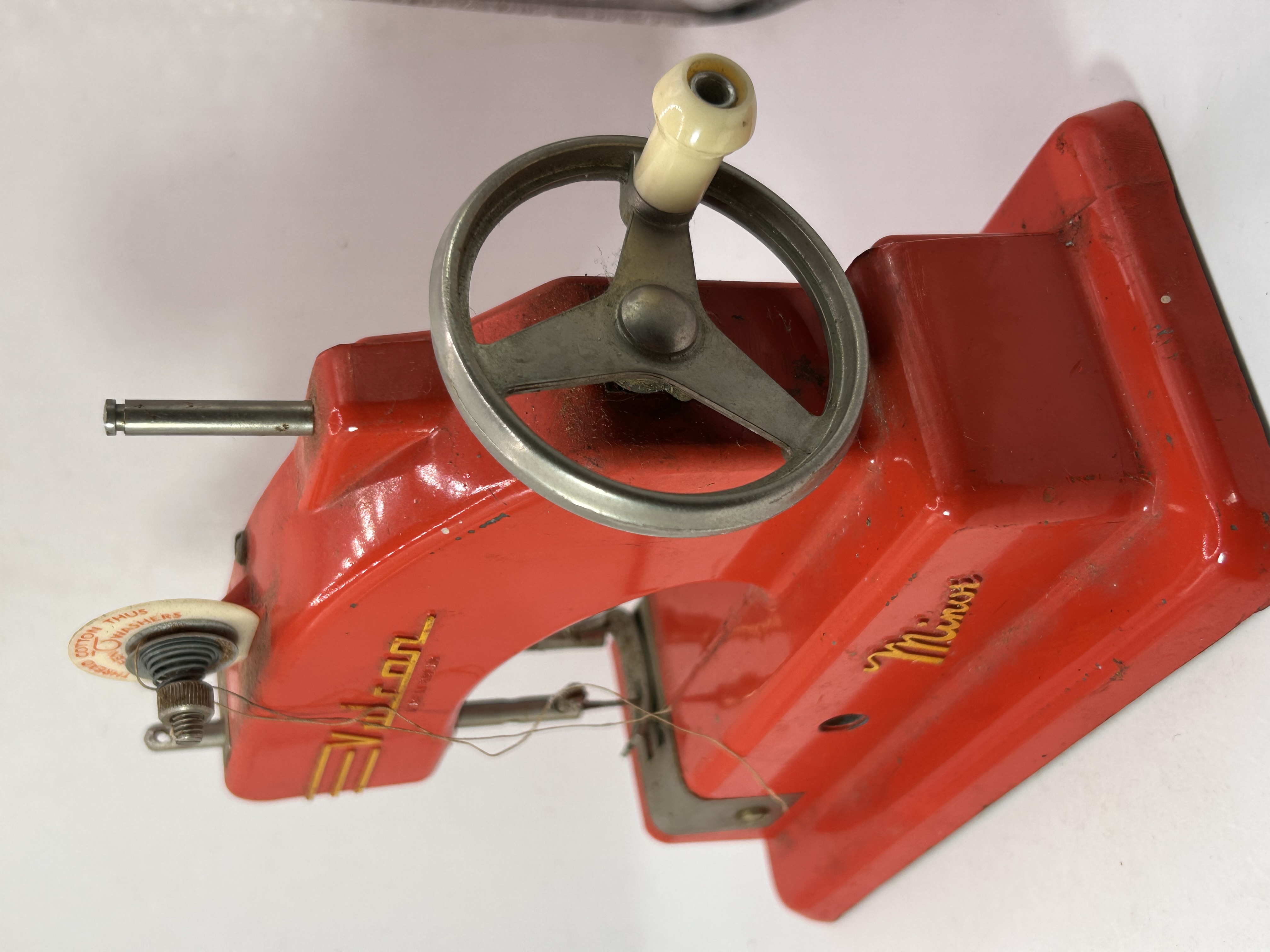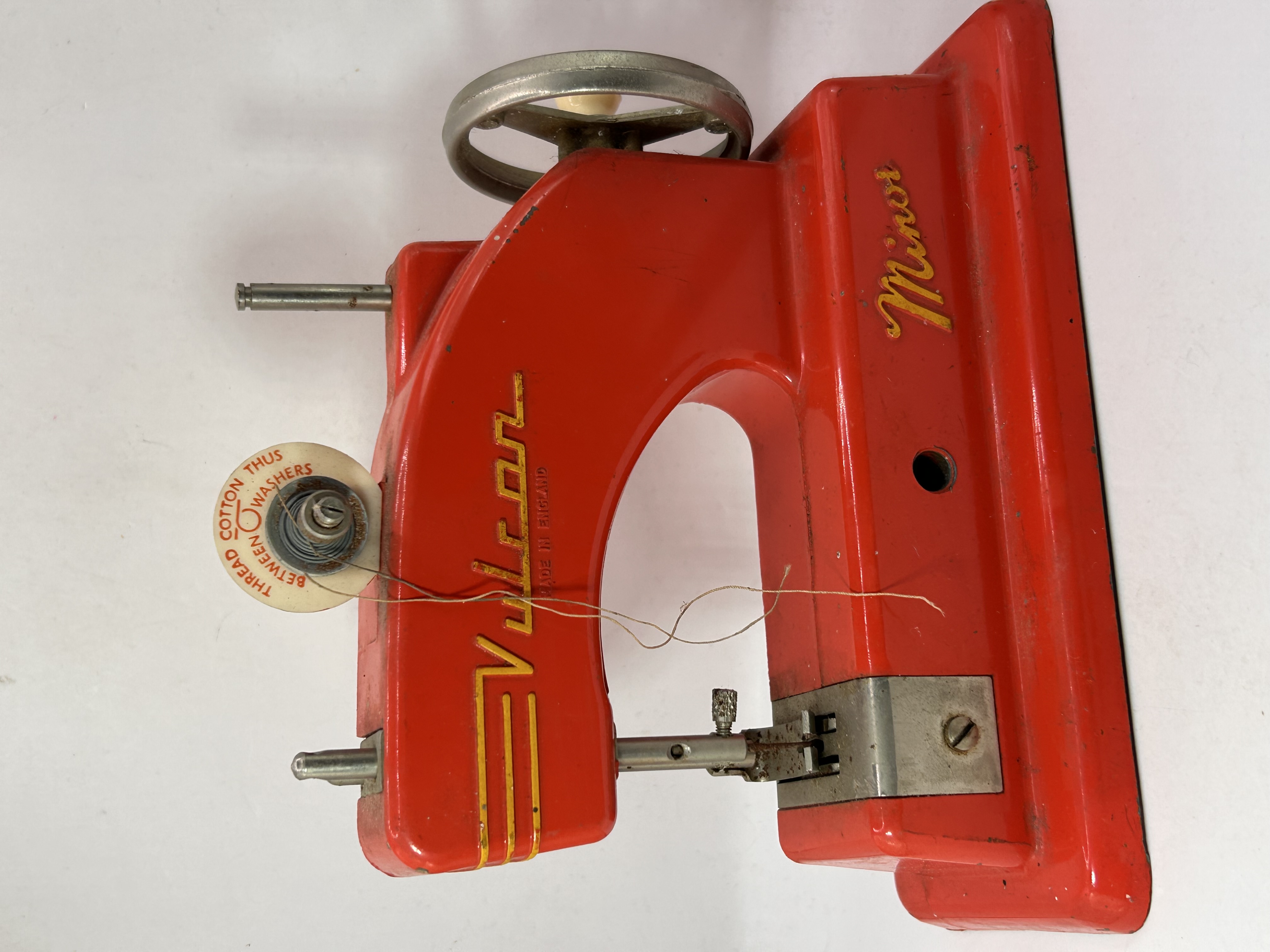 A single vintage children’s sewing machine identified through market consensus as a Vulcan Minor model. The machine is constructed primarily of cast metal and finished in bright red enamel paint with yellow lettering accents. It is a hand-operated model featuring a flywheel with a light-colored knob handle. The arm is inscribed with the maker’s name VULCAN above the inscription MADE IN ENGLAND. The base is marked Minor in script lettering. The thread tension assembly features a circular marking reading THREAD BETWEEN COTTON THUS WASHER.