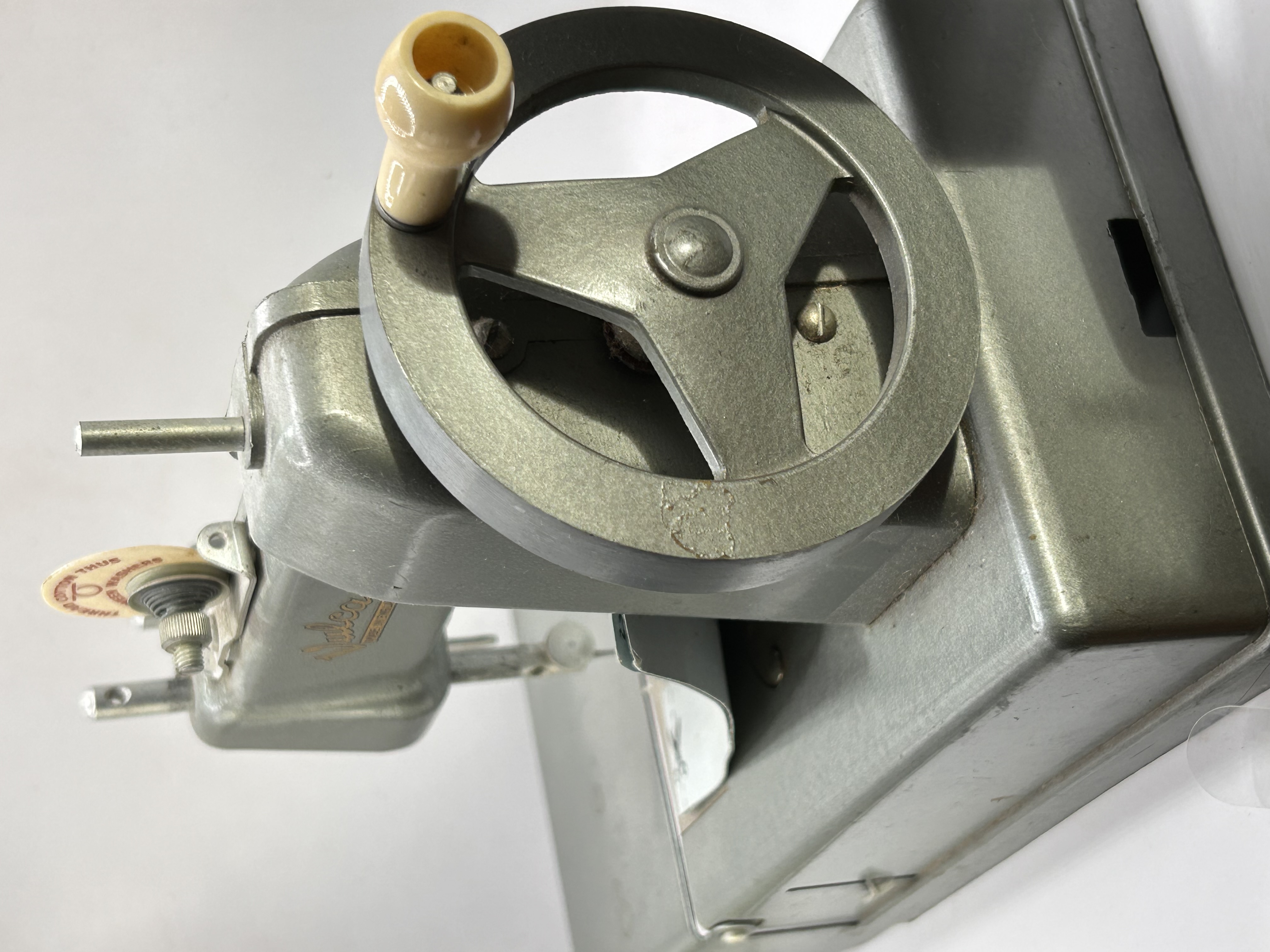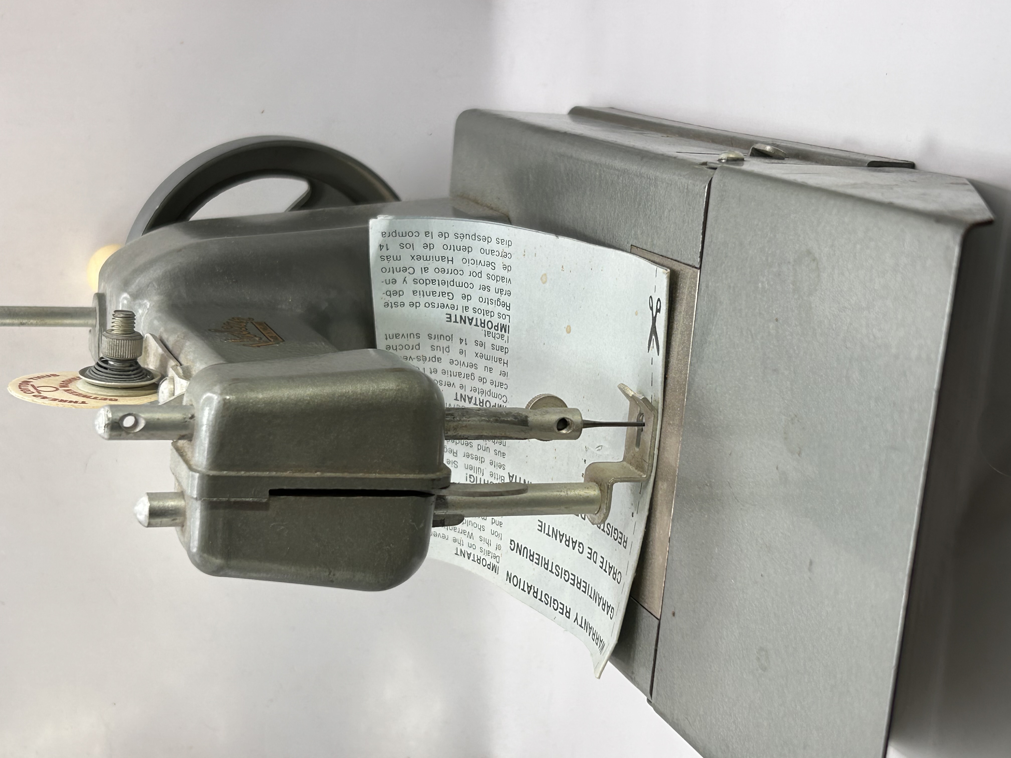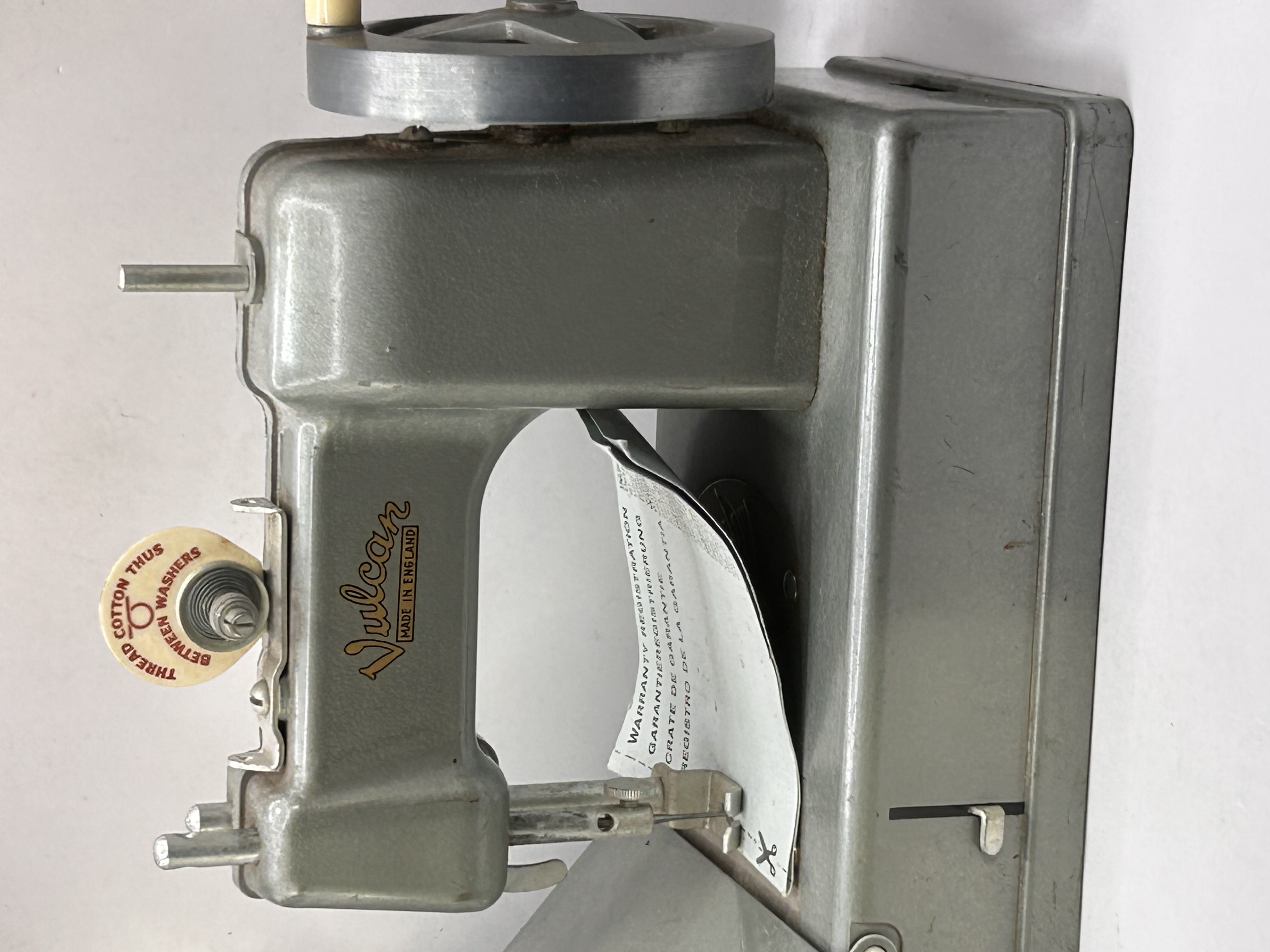 A vintage hand-operated miniature sewing machine identified through research as a Vulcan model, typically designed as a toy or child’s machine capable of chain stitching. The machine is constructed primarily of grey painted die-cast metal. The body is marked prominently with the name Vulcan in stylized gold lettering above the text MADE IN ENGLAND. The machine features a hand-operated flywheel with a plastic or bakelite handle grip. A circular spool and tension guide at the top is inscribed with the directions THREAD COTTON THUS and BETWEEN WASHERS. A folded and creased paper document is positioned beneath the presser foot, displaying multilingual headings including WARRANTY REGISTRATION, GARANTIEREGISTRIERUNG, and CRATE DE GARANTIE.