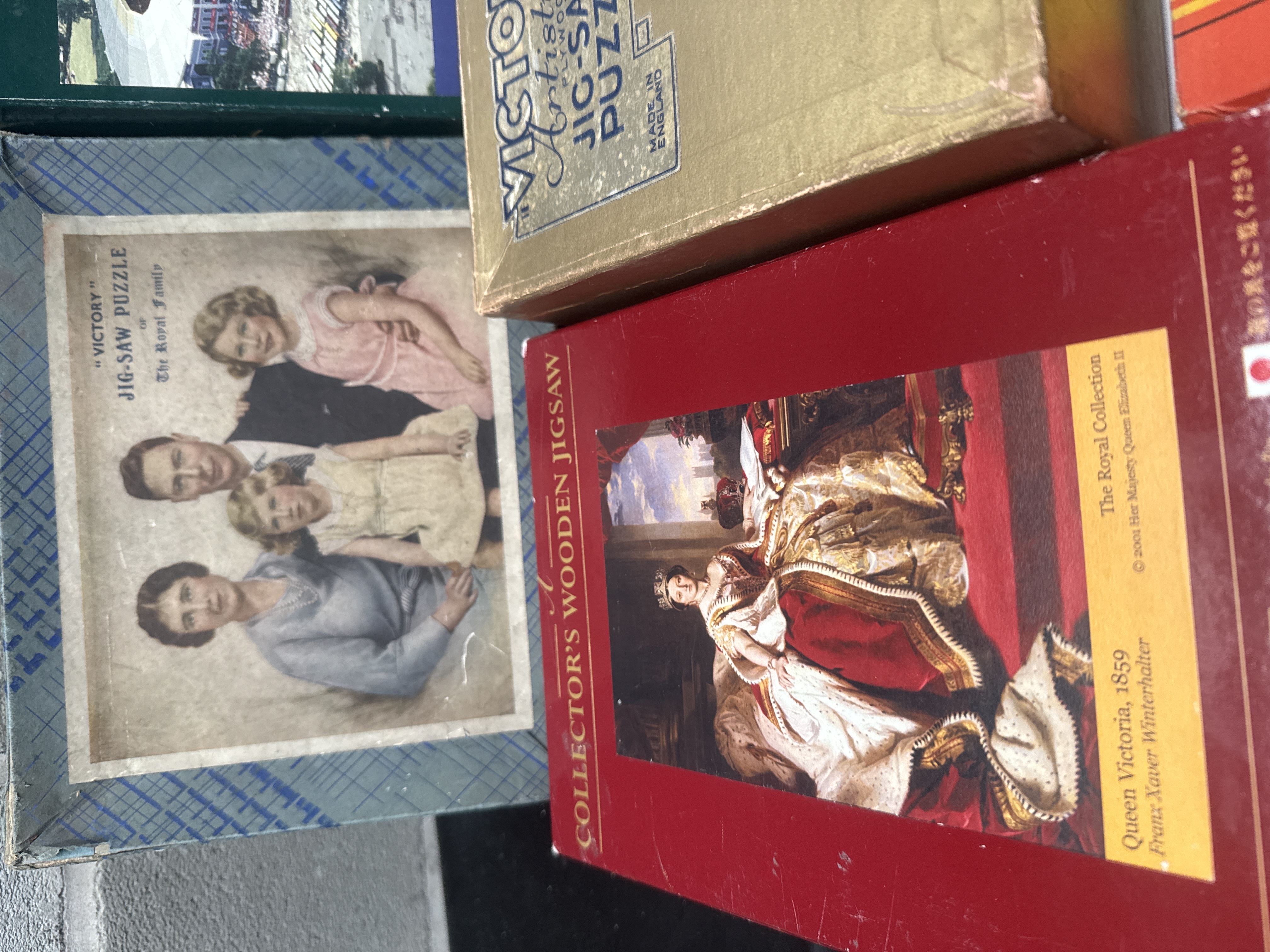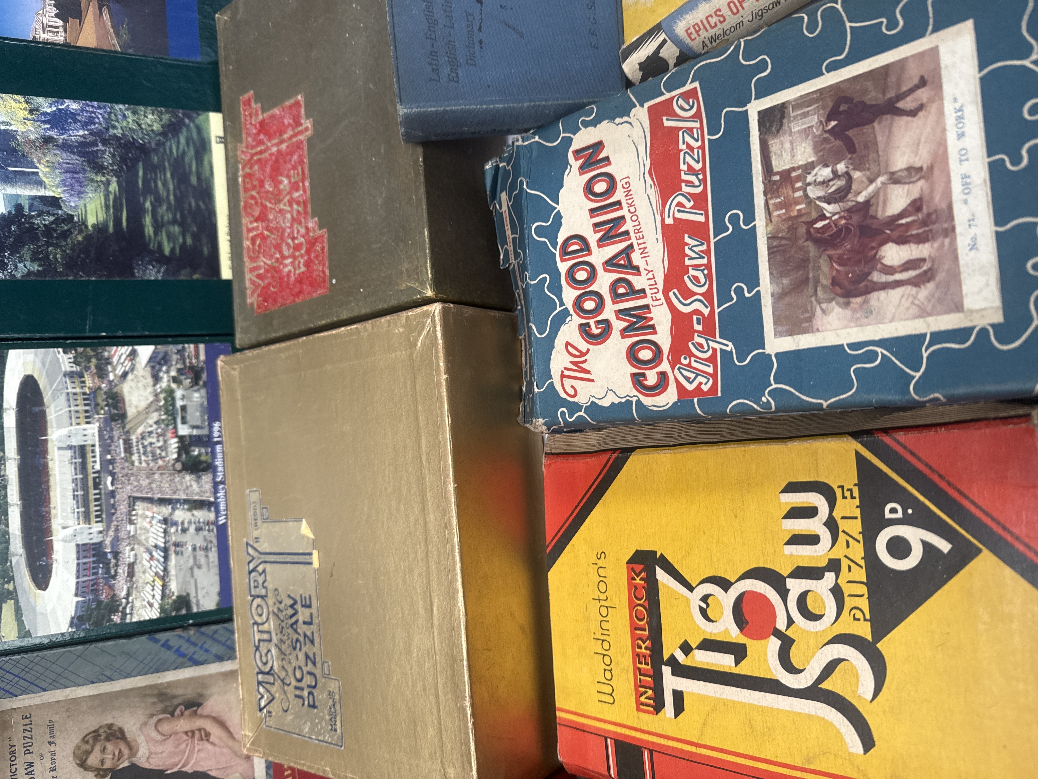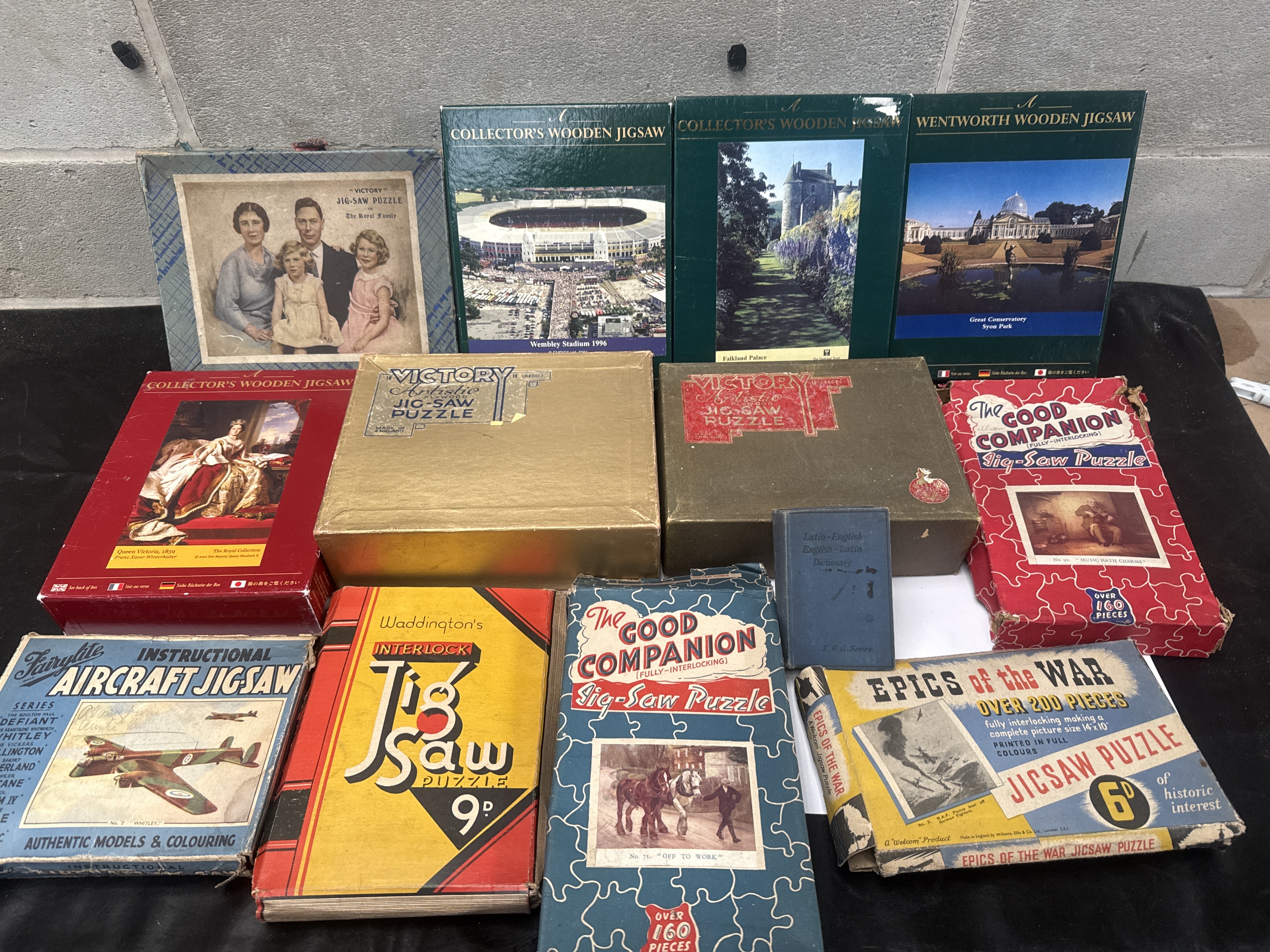This lot comprises a collection of 12 boxed items, primarily vintage and contemporary jigsaw puzzles, along with one small Latin-English English-Latin Dictionary (E.F.G. Series). The puzzle collection represents several decades of manufacturing, featuring various subjects and styles, including early 20th-century royalty, historical figures, wartime themes, and modern photographic scenes. Key manufacturers and series visible include Victory, Waddington’s Interlock (marked 9d), The Good Companion, Fairylite Instructional Aircraft Jigsaw, and Collector’s Wooden Jigsaw. Specific puzzle subjects noted are Victory Royal Family, Queen Victoria (1859, from The Royal Collection), Wembley Stadium 1996, and Epics of the War (marked 6d, over 200 pieces). The collection also includes several modern wooden jigsaws, such as those by Wentworth Wooden Jigsaw (e.g., Great Conservatory, Syon Park). The small dictionary is bound in blue cloth.