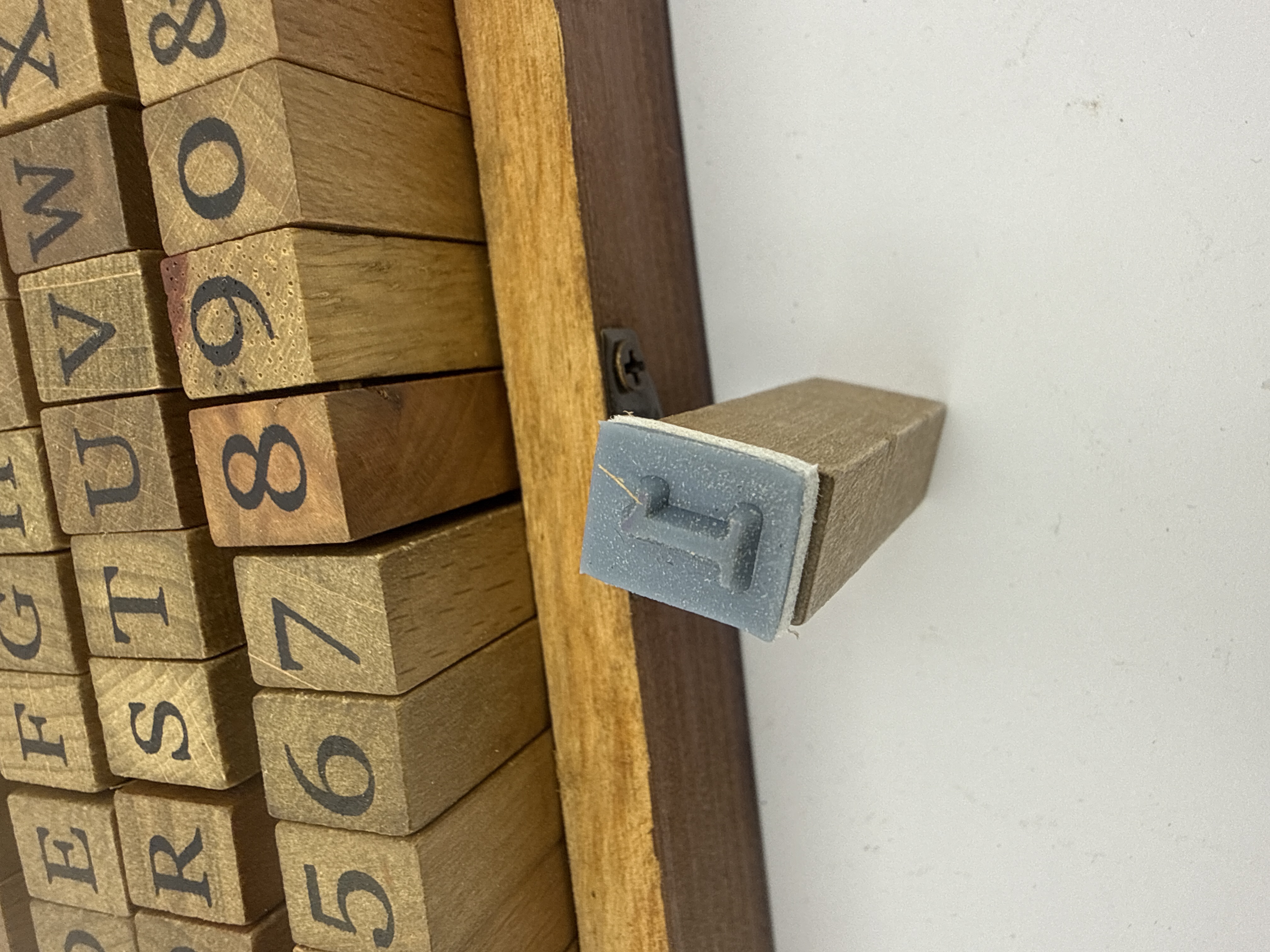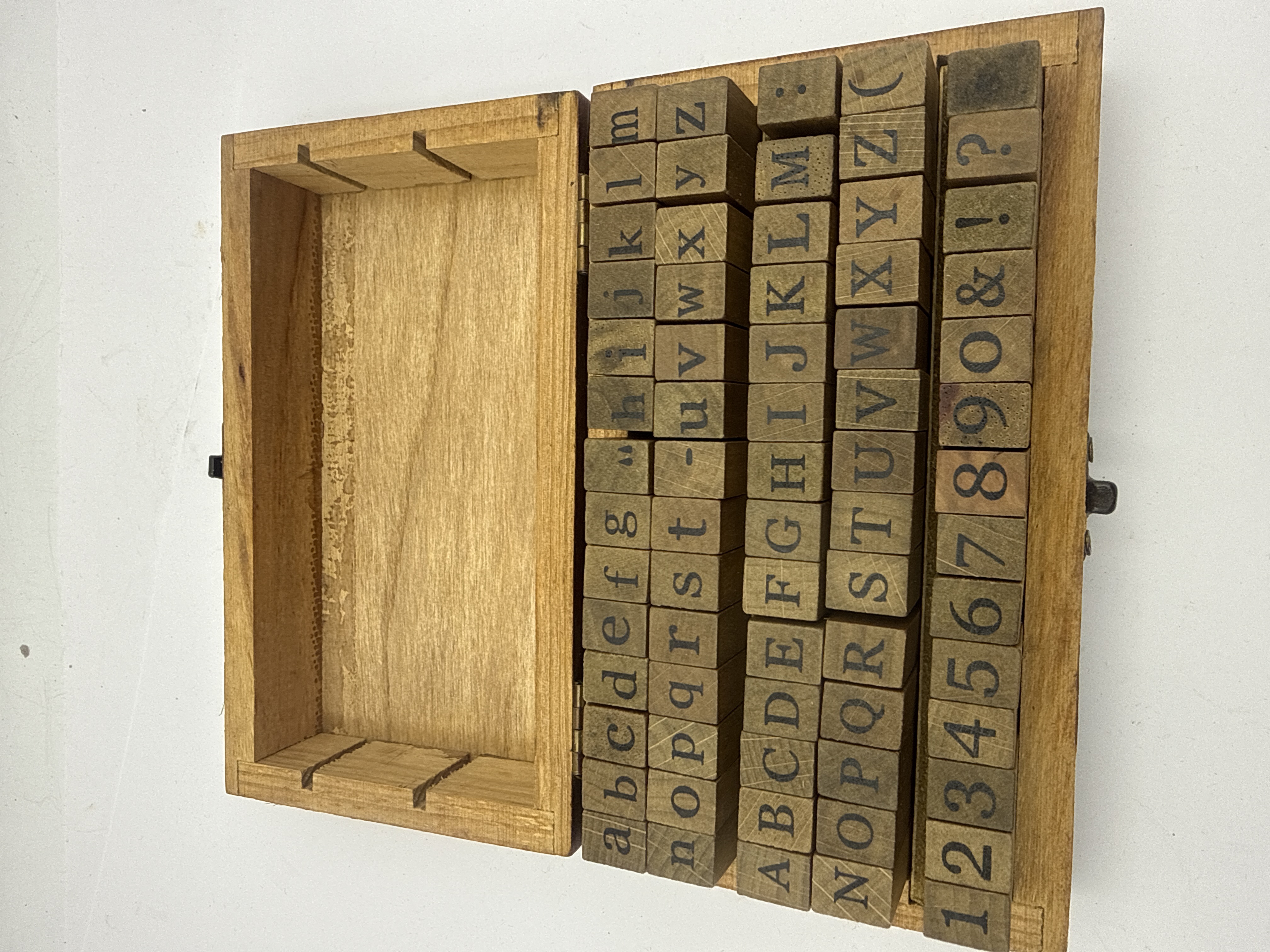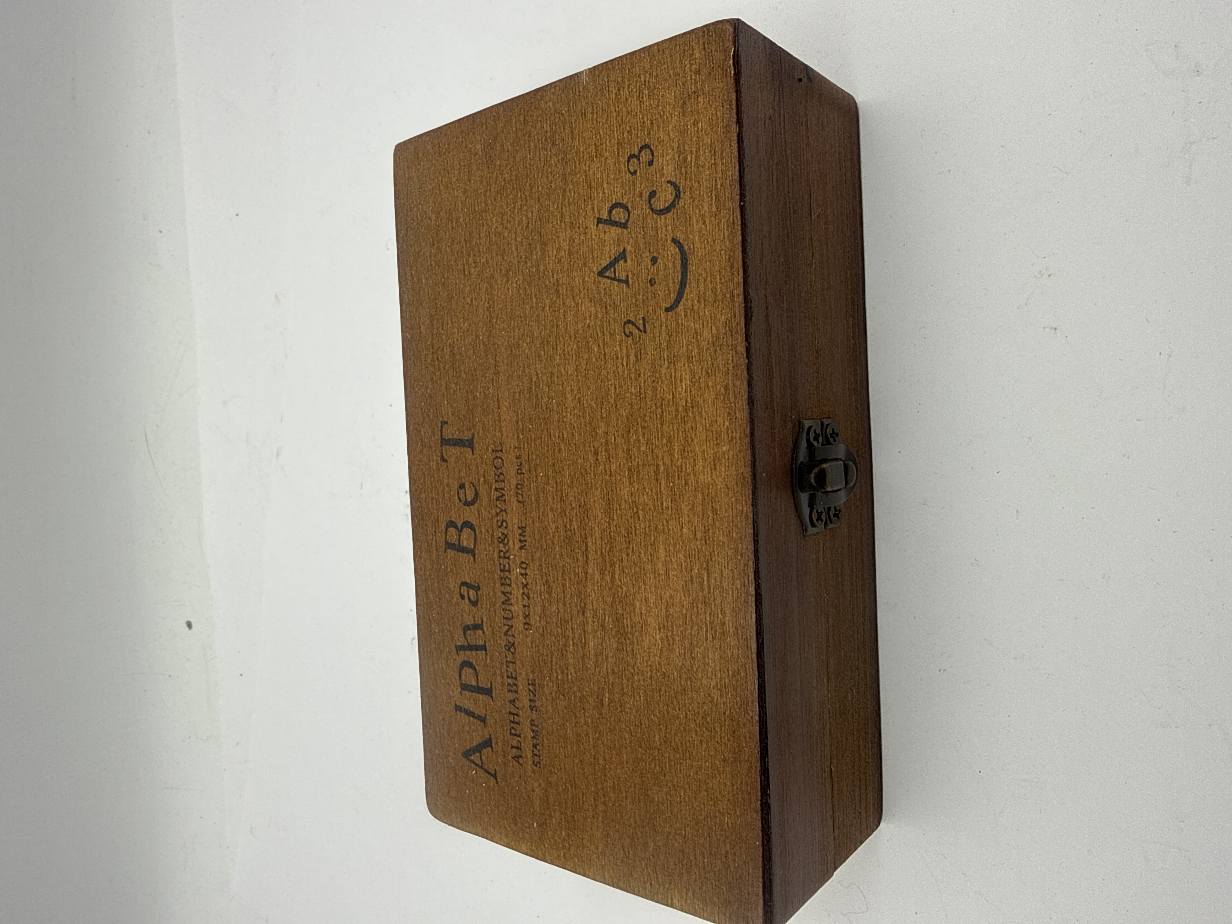 A collection of individual rubber stamps housed within a rectangular, stained wooden storage box secured by a hinged lid and a small metal latch. The stamps feature wooden block handles and gray polymer or rubber stamp faces displaying various characters. The box lid is marked AlphaBeT ALPHABET & NUMBER & SYMBOL, detailing the stamp size as 9.5X12X40 MM and claiming 70 pieces total. The collection consists of 69 verified stamps, including a near-complete set of uppercase letters, lowercase letters, numbers (1-0), and various symbols (including dash, ampersand, exclamation point, and question mark). The stamps are arranged in five rows within the fitted interior of the box.