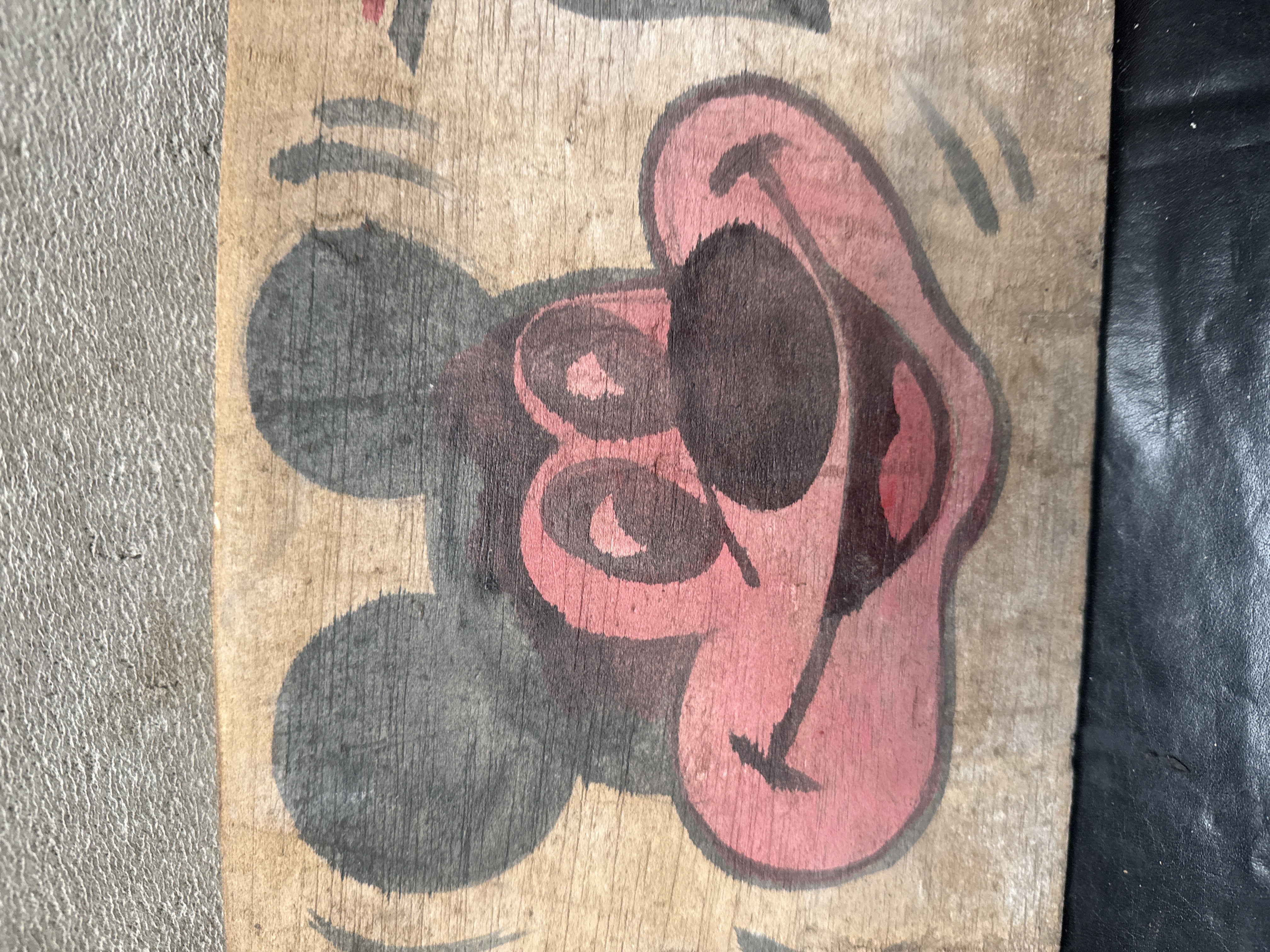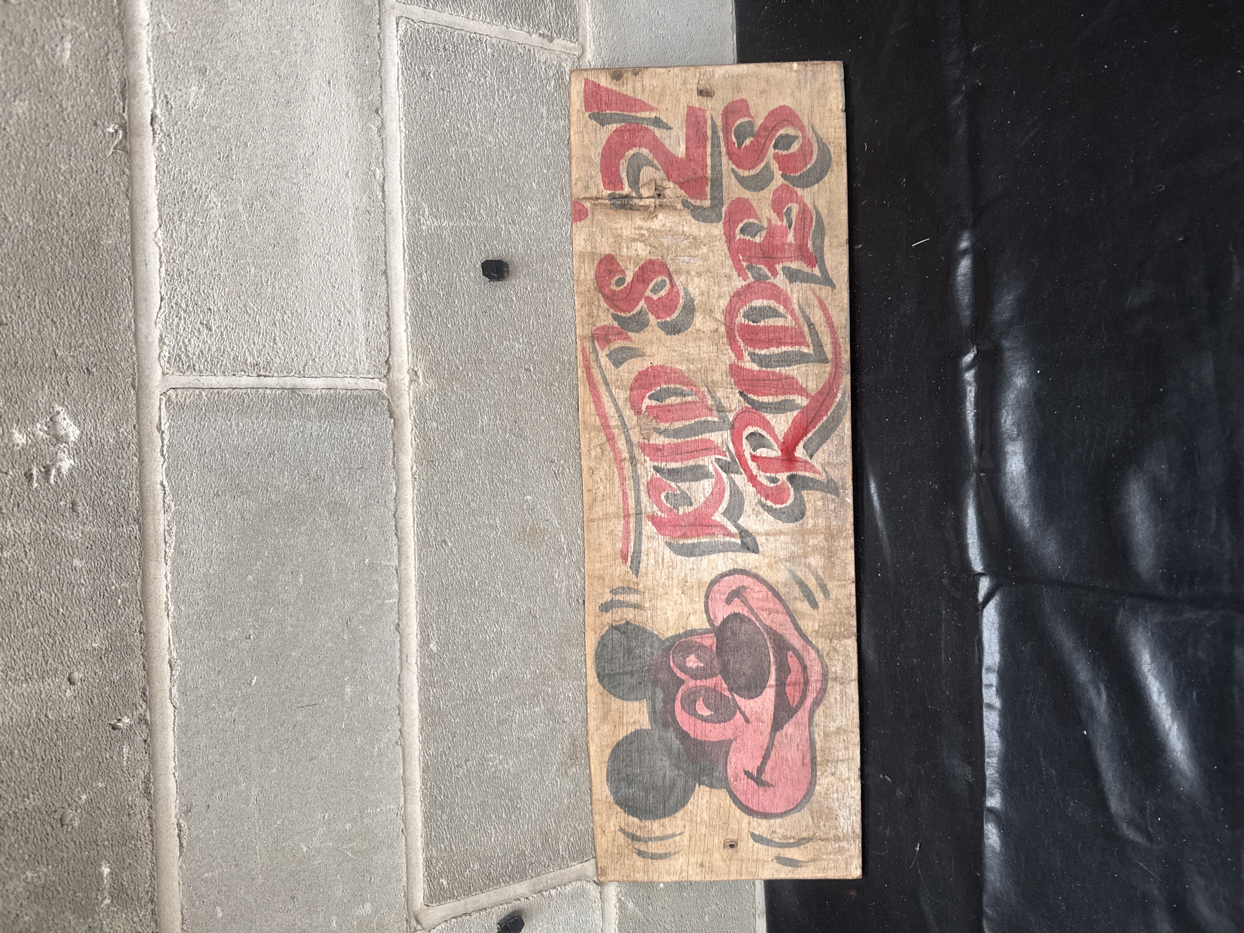A single piece of vintage vernacular advertising signage constructed from Plywood. The rectangular sign is hand-painted in a folk art style, featuring a stylized cartoon head resembling Mickey Mouse on the left side. The graphics are executed in faded red/pink and black/dark gray paint. The sign displays the vernacular text “KID’S 2′ RIDES.” This type of sign was typically used for carnival, fairground, or amusement park ride advertising.