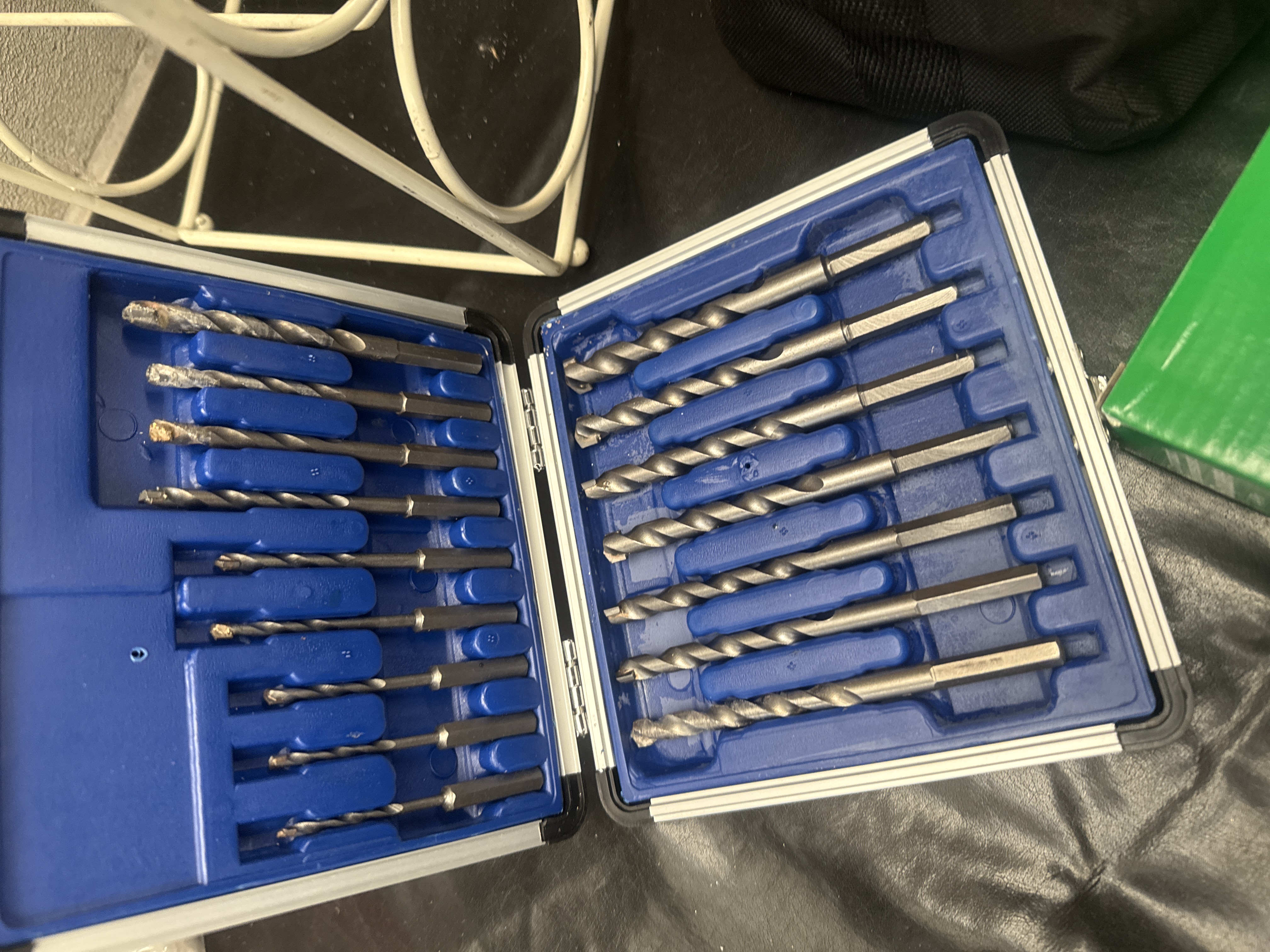 The collection consists of eight distinct items or sets of new and unused hardware, tools, and domestic supplies, primarily retained in their original retail packaging or dedicated storage cases. The lot includes a white decorative metal wine rack designed to hold four bottles. Also present is a blue aluminum-cased set containing 16 metal twist drill bits. A yellow and black canvas tool bag marked ‘DRILL ALL’ is included. One item is a Bell Lighting CFL Square 28W 4-Pin compact fluorescent lamp bulb (GR10q cap, 2050 lm), consistent with the 3500k standard white type identified in research. The lot also features a Victor Tools ‘2-IN-1 SAW’ set in its original box, a VonHaus Ultra Slim Cantilever TV Wall Bracket set boxed for 23-55 inch screens, a Black+Decker tool or bit set housed in a black plastic storage case, and a sealed plastic bag containing a Harris/Taskmasters 9″ Roller Set of painting supplies.