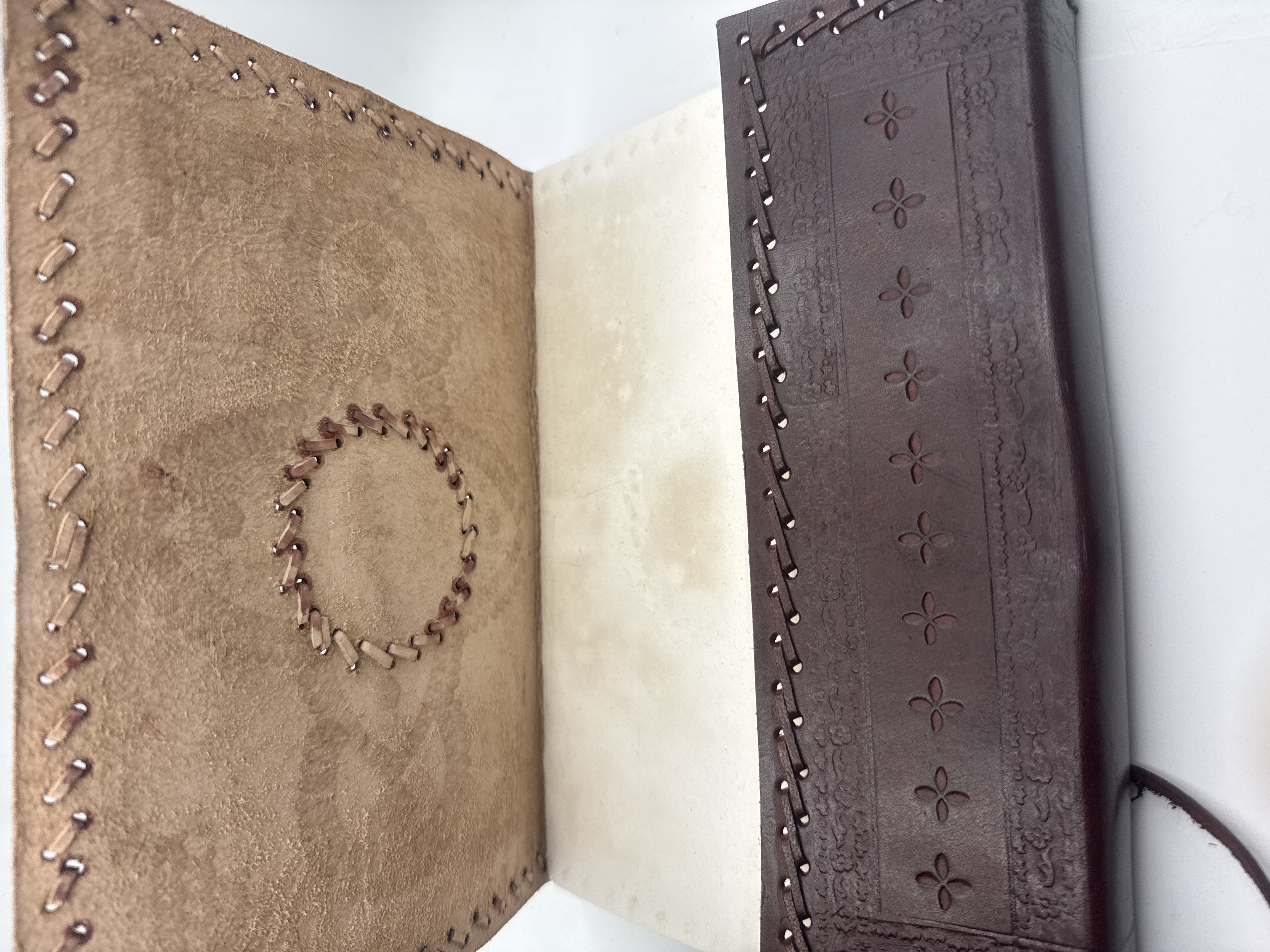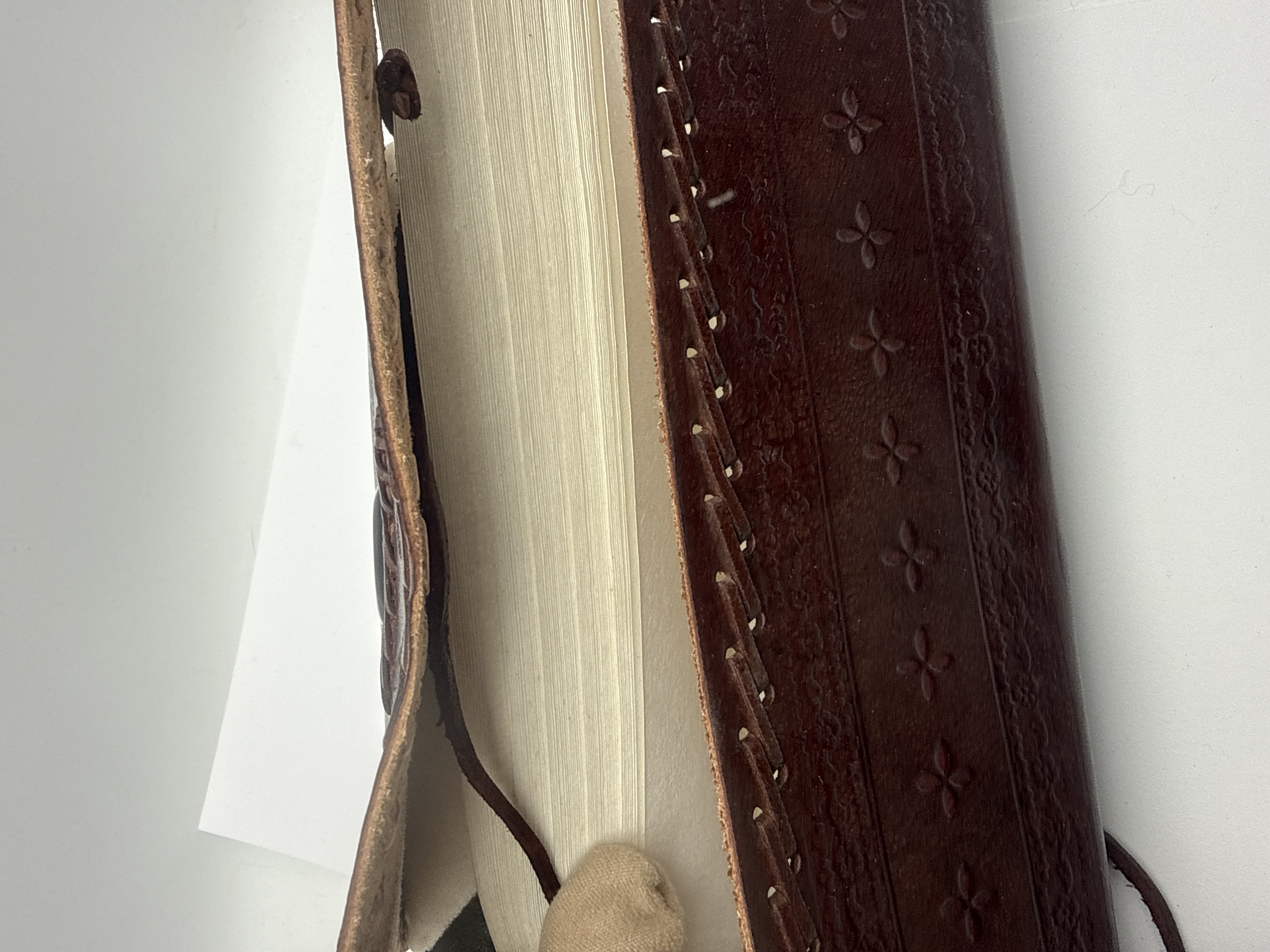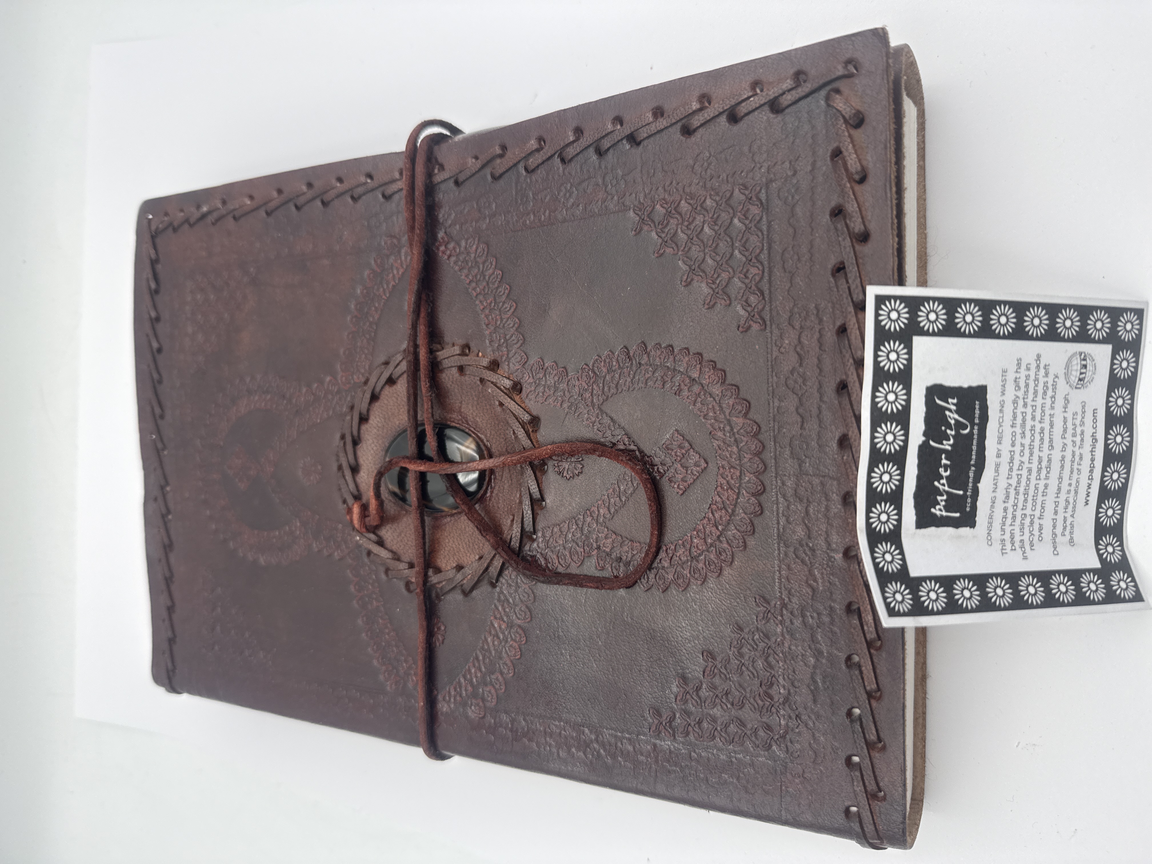 A single handmade journal and an informational tag. The journal is bound in dark reddish-brown Leather, featuring extensive blind-tooled decoration on the cover, including symmetrical floral and swirling patterns. The cover is secured by a central fastener composed of a dark oval cabochon stone wrapped with a leather cord. The edges of the thick cover are finished with an exposed lacing stitch, and the spine area is decorated with an embossed repeating quatrefoil motif. The interior contains a substantial block of thick, cream-colored handmade paper, confirmed by the accompanying ‘Paper High’ tag to be manufactured from recycled materials. The overall size is consistent with the 8 X 11” format.