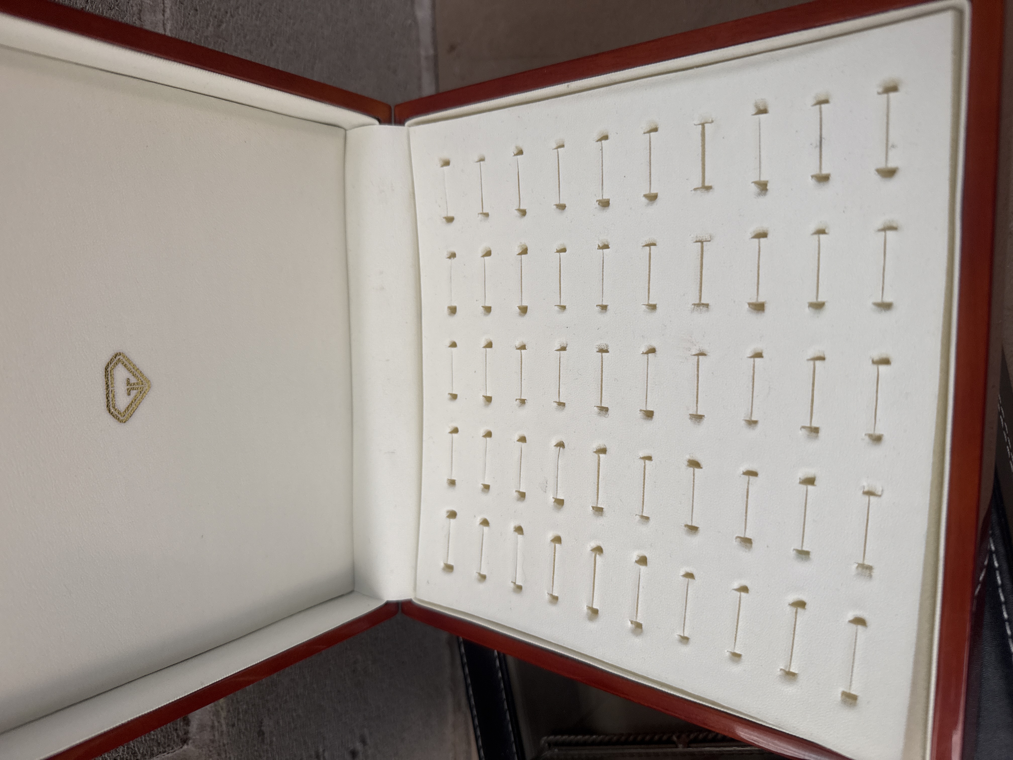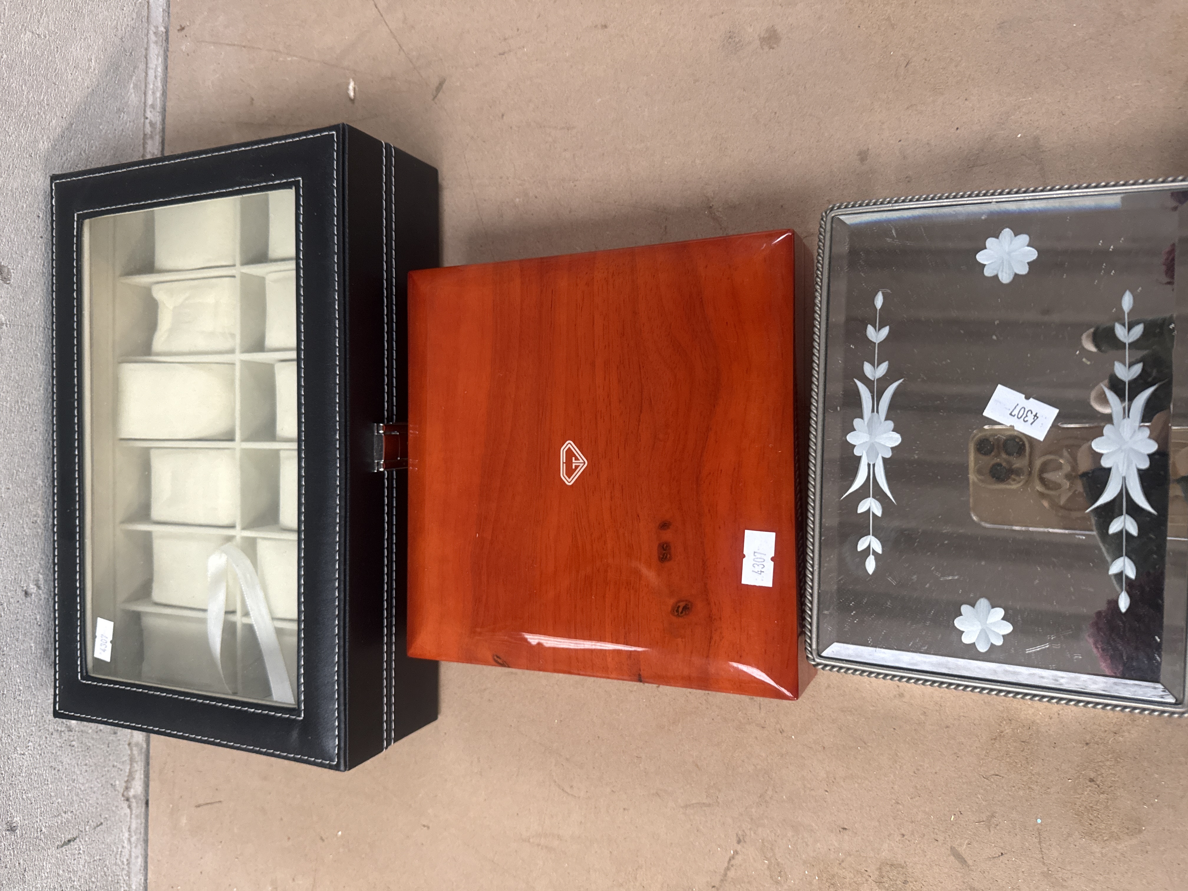 The lot consists of three modern storage and display cases for jewelry and timepieces. The first is a rectangular watch display case constructed of black faux leather with white contrast stitching, featuring a clear lid and an internal arrangement of twelve cream-colored compartments designed for wristwatches. The second item is a high-gloss, reddish-brown wooden box, possibly veneered burl, which opens to reveal a custom interior designed as a ring tray featuring 48 individual ring slots arranged in eight columns by six rows. The interior lid displays a gold-toned diamond logo. This wooden box bears an inventory sticker reading 4307. The third item is a rectangular mirrored jewelry box with a silver-toned metal frame, featuring a beaded edge and a mirrored lid decorated with frosted, etched floral motifs. The interior is lined with black velvet and includes internal dividers. This mirrored box also bears an inventory sticker reading 4307.