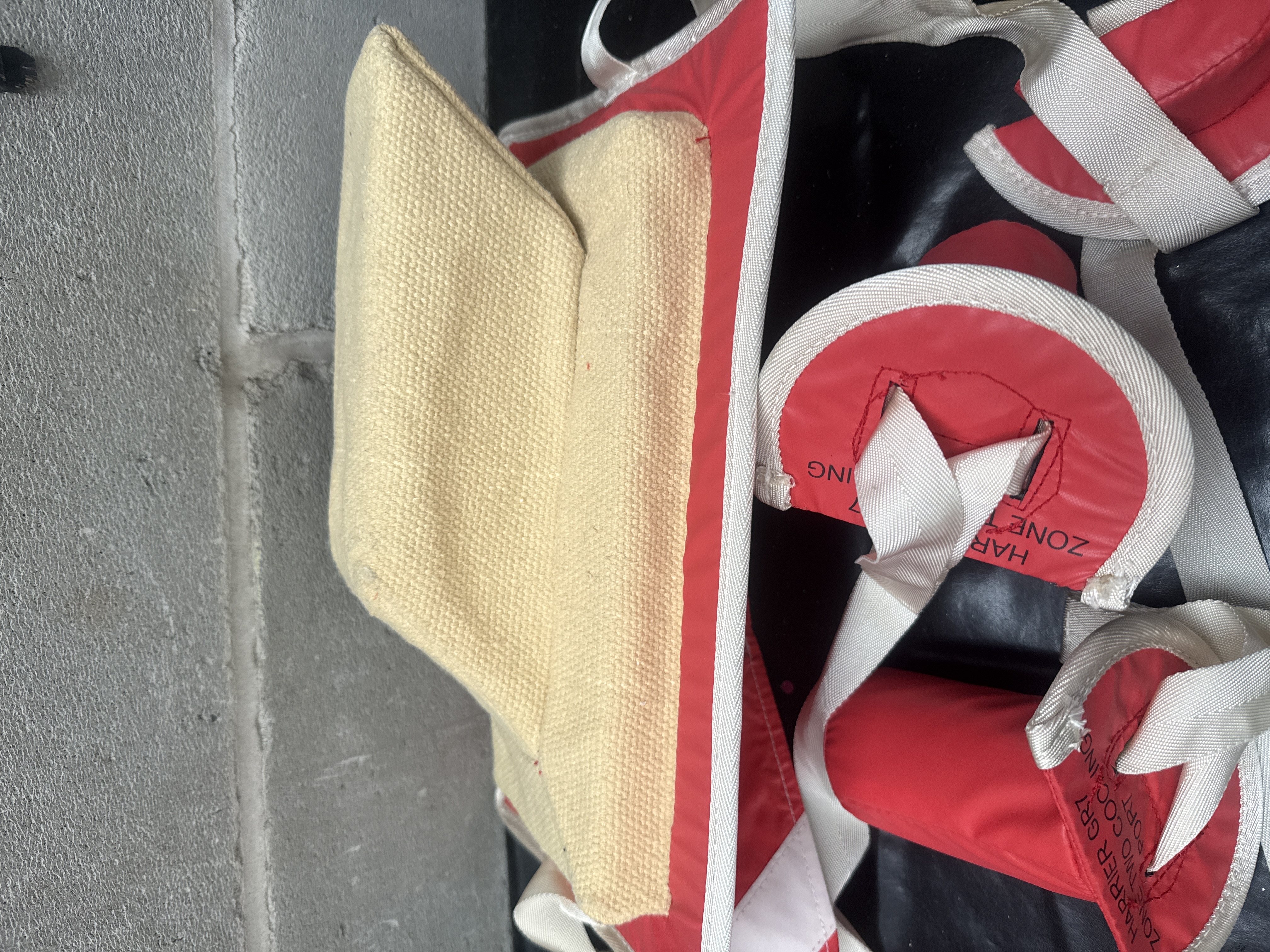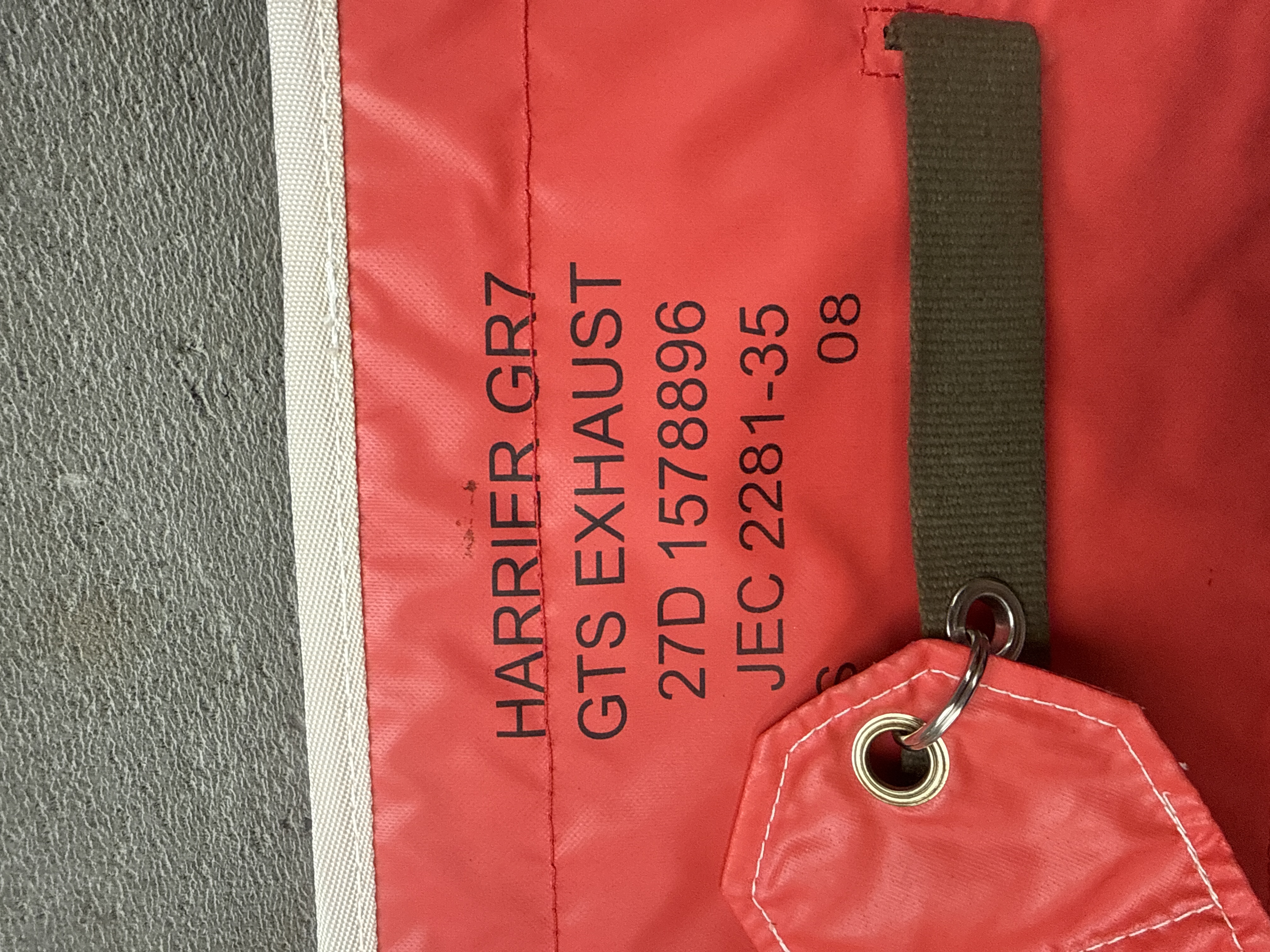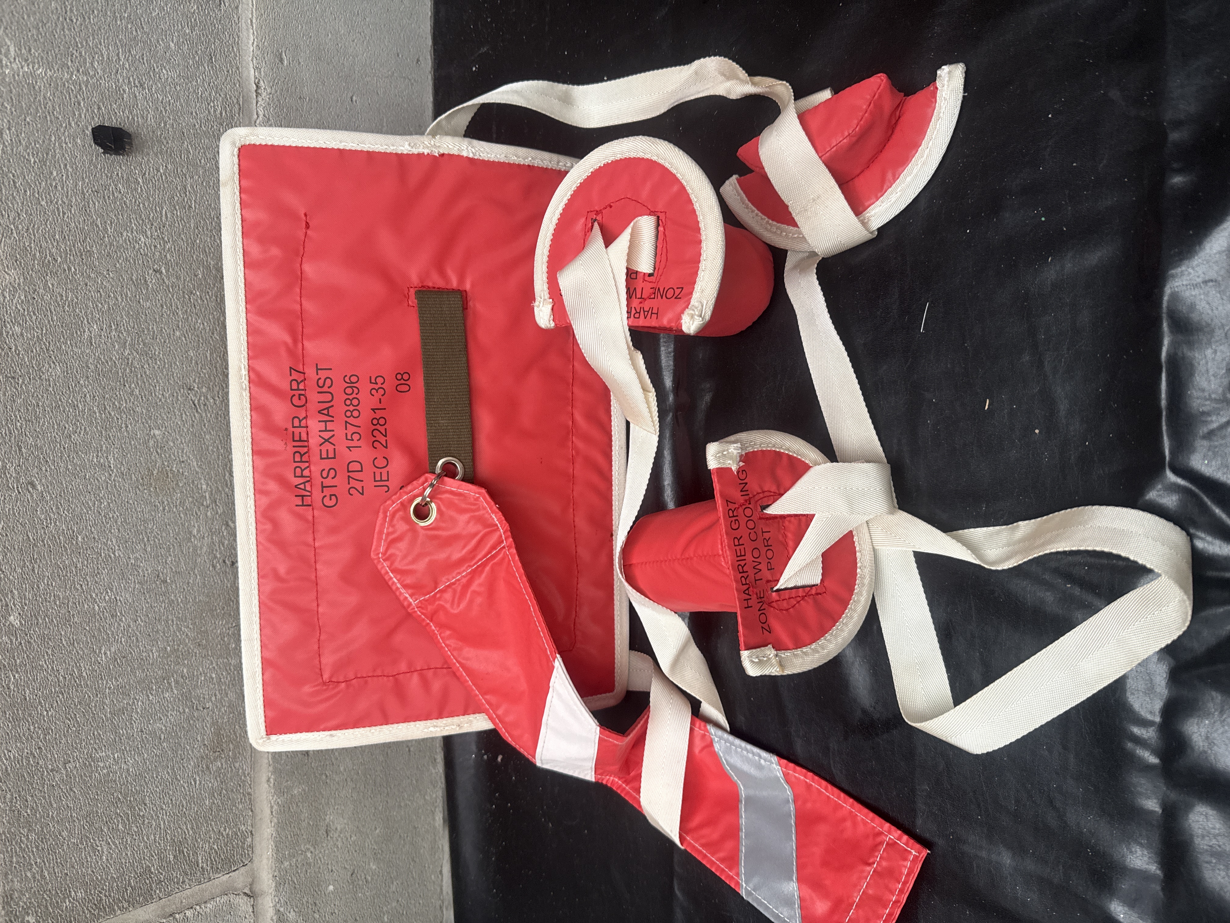 A collection of five specialized aircraft ground support equipment covers and plugs designed for the British Aerospace/McDonnell Douglas Harrier GR7 Jump Jet. The set is constructed from padded, quilted red synthetic material with off-white fabric trim and interconnected by off-white webbing straps. The collection includes one large rectangular panel cover and four smaller curved or cylindrical plugs, all designed to protect critical engine ports during maintenance or storage. The large cover is stenciled in black with the identifiers HARRIER GR7, GTS EXHAUST, 27D 1578896, JEC 2281-35, and 08. The smaller plugs are marked HARRIER GR7 ZONE TWO COOLING PORT. One long strap attached to the main cover features reflective white and red safety stripes. The reverse side of the large cover shows a thick, textured, off-white protective padding.