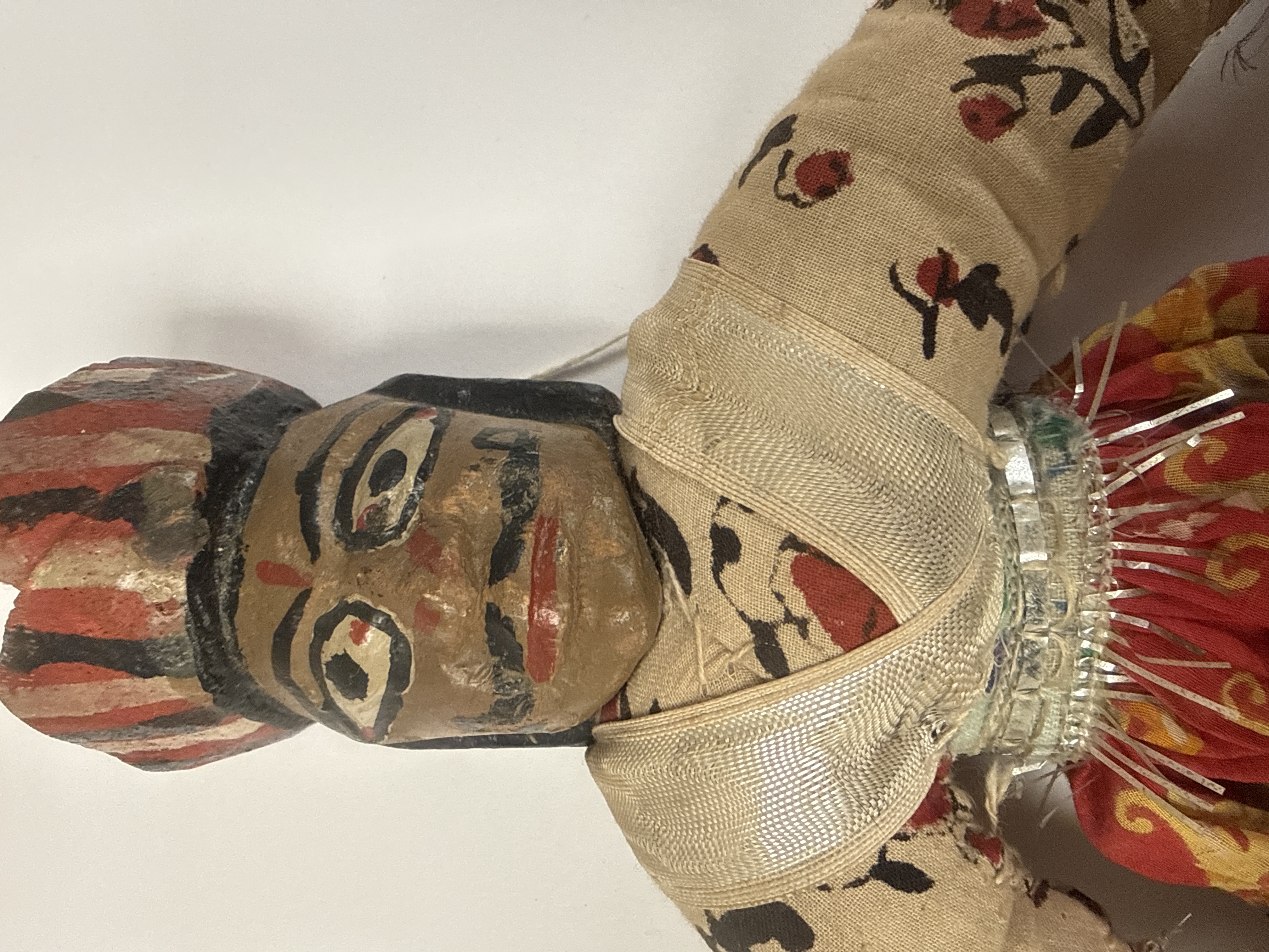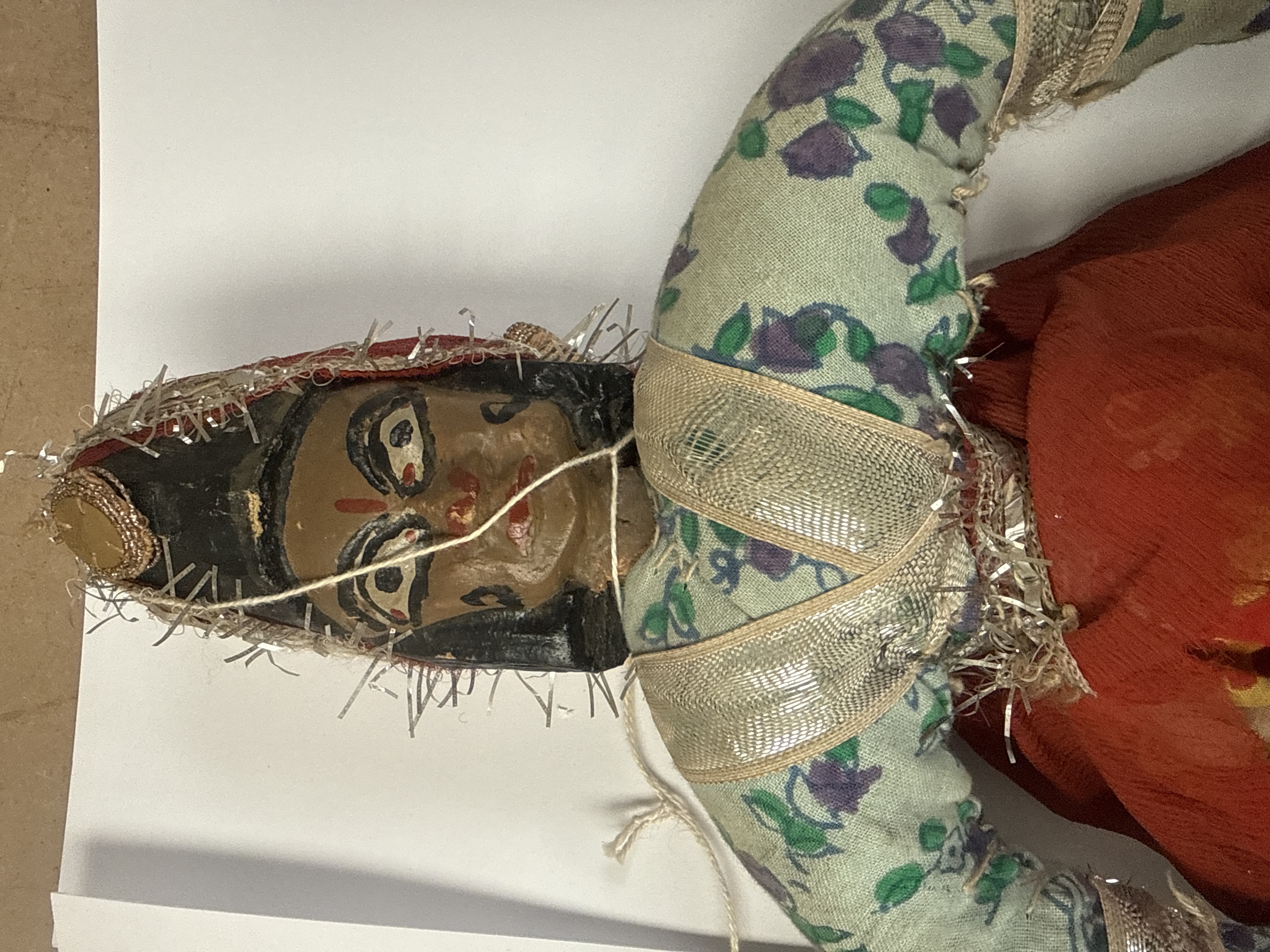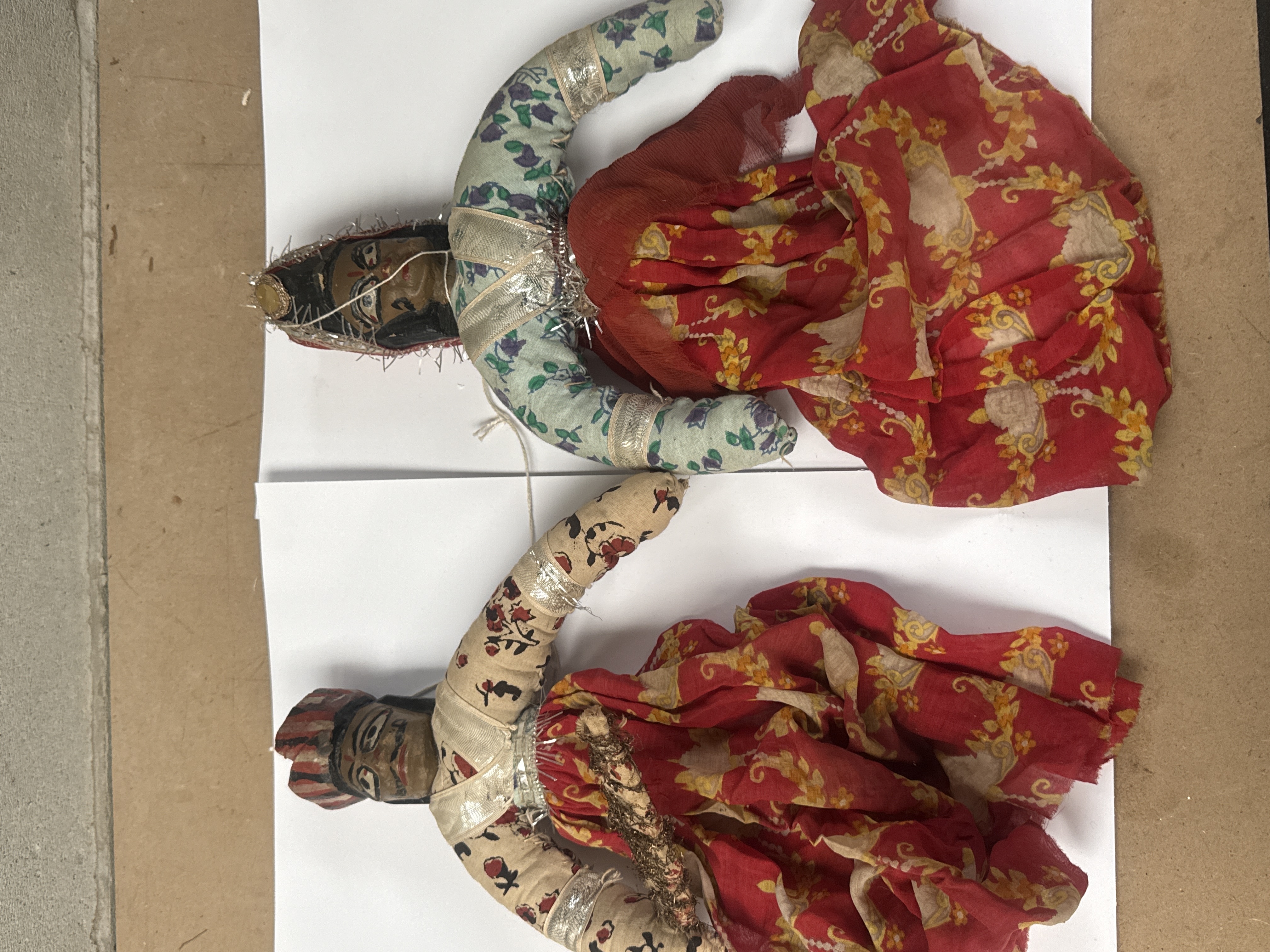 A pair of traditional folk-art string puppets, consistent with the style of Indian Kathputli figures. Each figure features a carved and painted wooden head with dark brown skin tones and expressive features. The bodies are constructed of stuffed fabric. Both puppets are elaborately dressed in patterned cotton folk costumes accented with metallic silver braided trim. The male figure wears a striped wooden turban and a beige floral upper garment. The female figure wears a green floral choli and a black head covering decorated with silver tinsel. Both are clad in voluminous skirts primarily made of red and yellow patterned fabric. White control strings are visible.