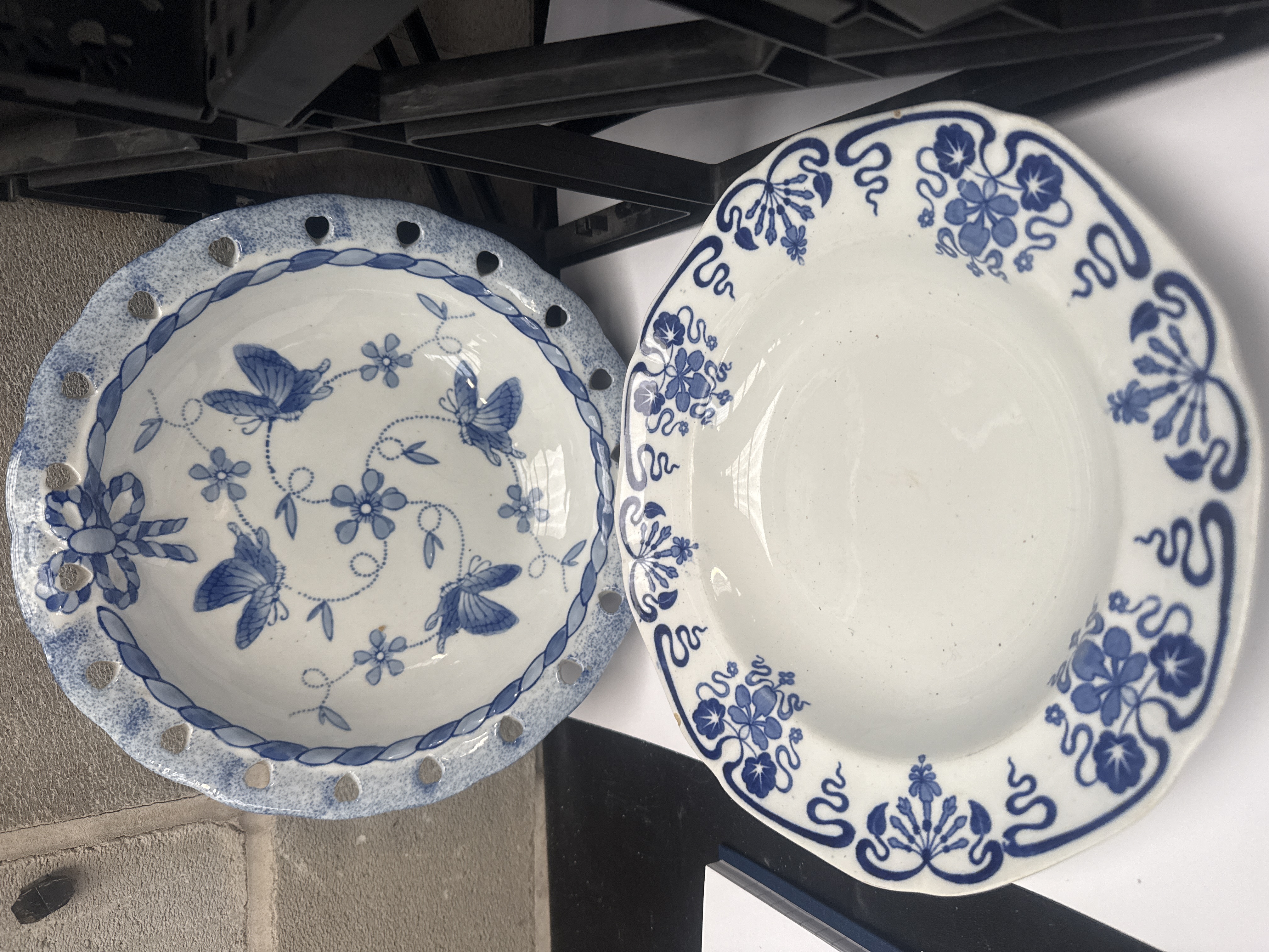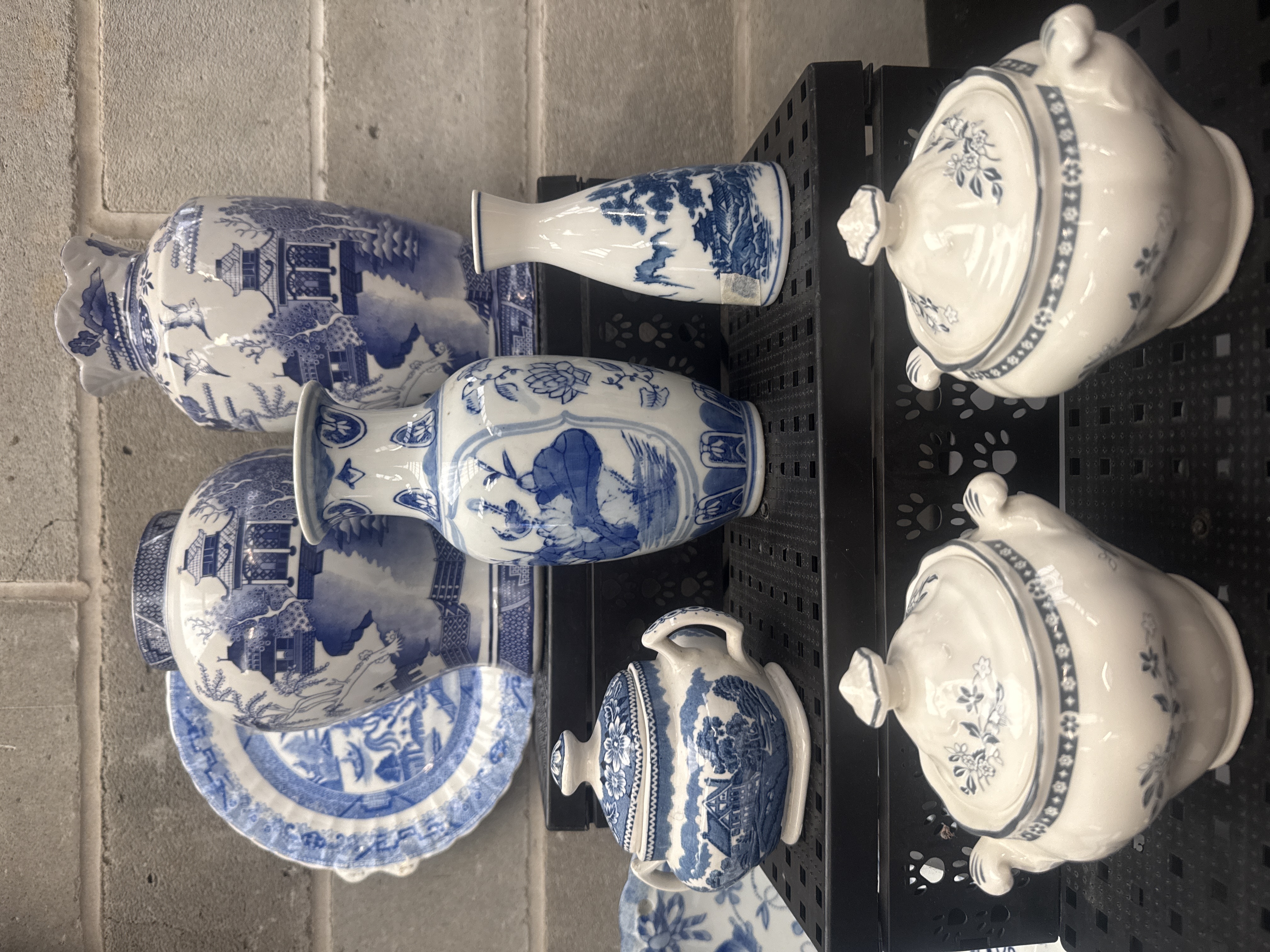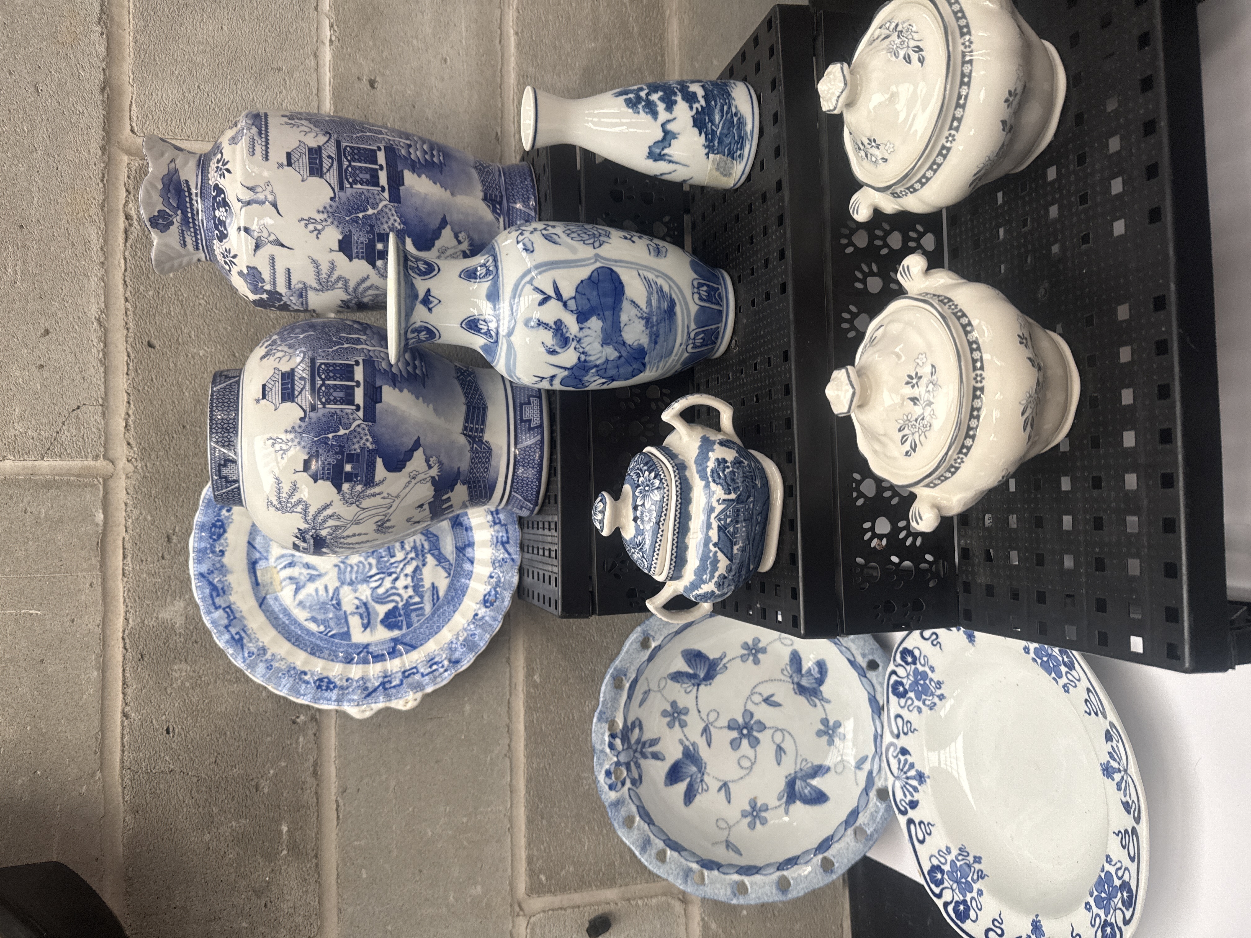 The collection consists of 10 pieces of blue and white ceramic dinnerware and decorative vessels, primarily attributed to Royal Doulton in the “Real Old Willow” pattern, or a similar Chinoiserie transfer-printed design. The assembly includes three plates or shallow bowls (one large decorative plate, one shallow soup bowl, and one shallow bowl with a perforated rim and butterfly motif), four vases of varying heights and shapes (two large ovoid jars with Chinoiserie landscapes, one flared neck vase, and one narrow bottle vase), one small covered sugar bowl with handles decorated in a complex landscape scene, and a matching pair of lidded tureens or sugar bowls with handles featuring simpler floral sprays. The items are constructed of earthenware or porcelain, utilizing transfer printing techniques typical of 19th or 20th Century British interpretations of Chinese export styles. The decoration is predominantly blue on a white ground, featuring pagodas, bridges, birds, and figures in traditional Chinoiserie settings, alongside floral and butterfly motifs on some pieces. The inclusion of Royal Doulton is supported by market research identifying this pattern.