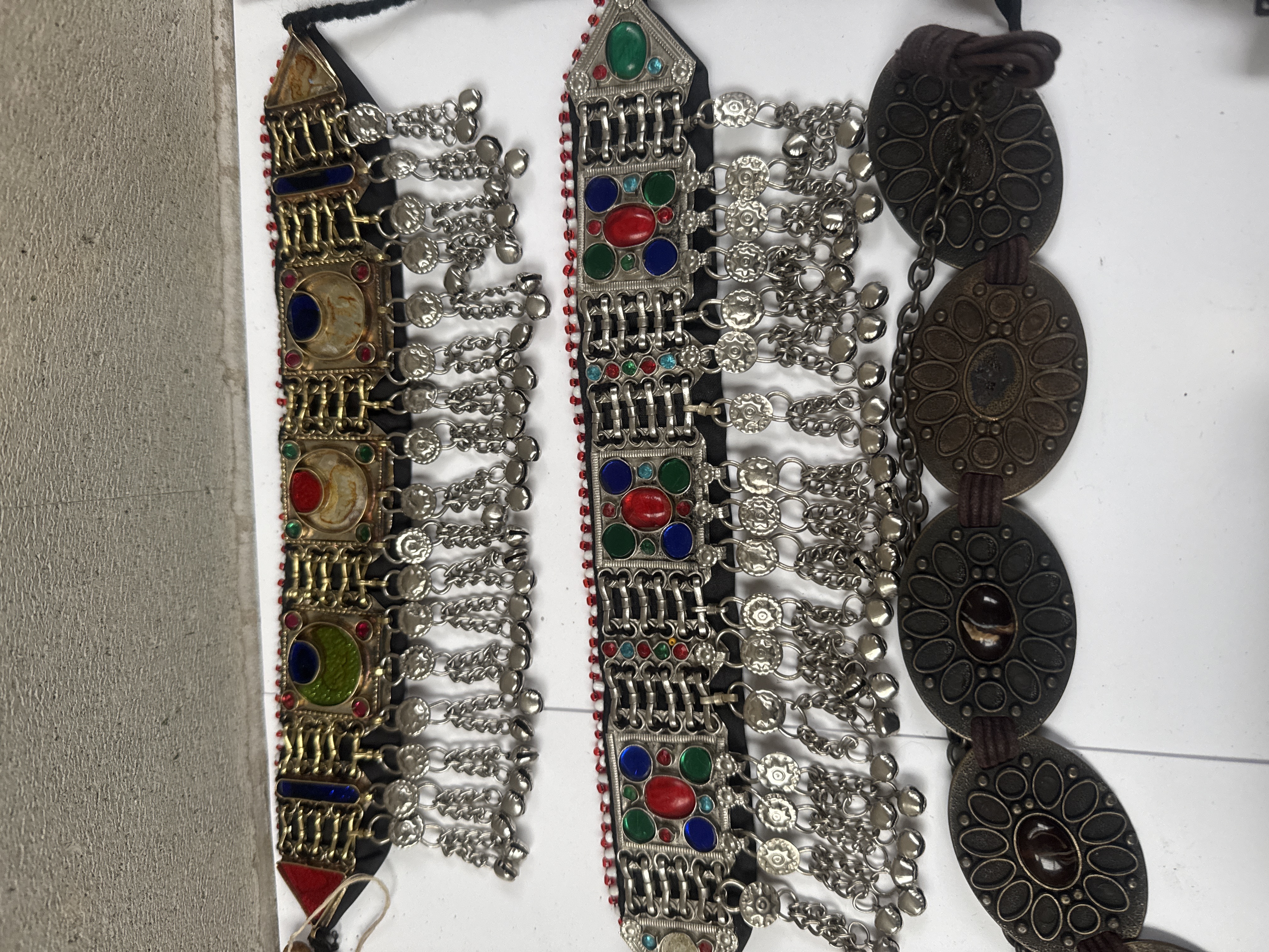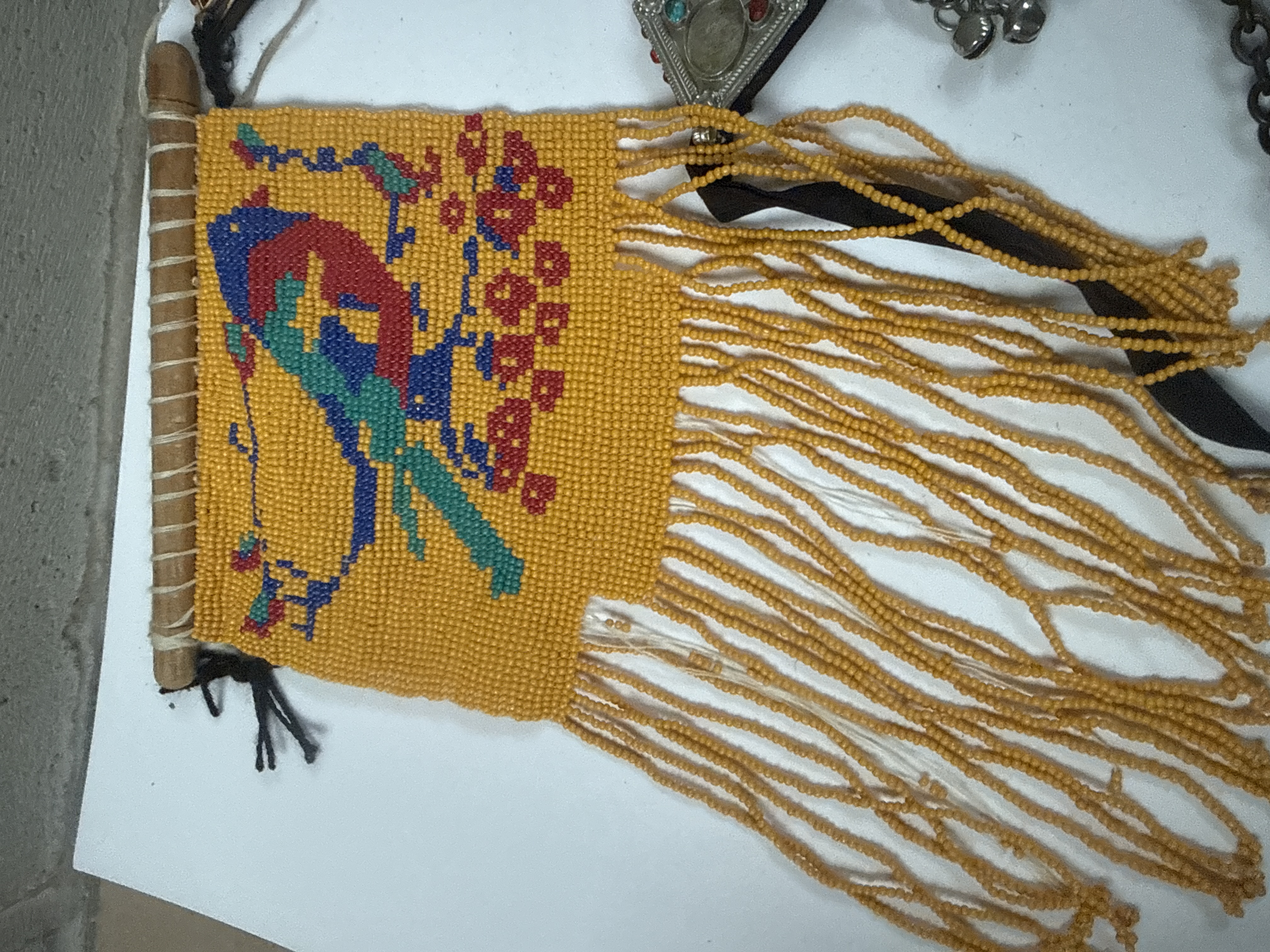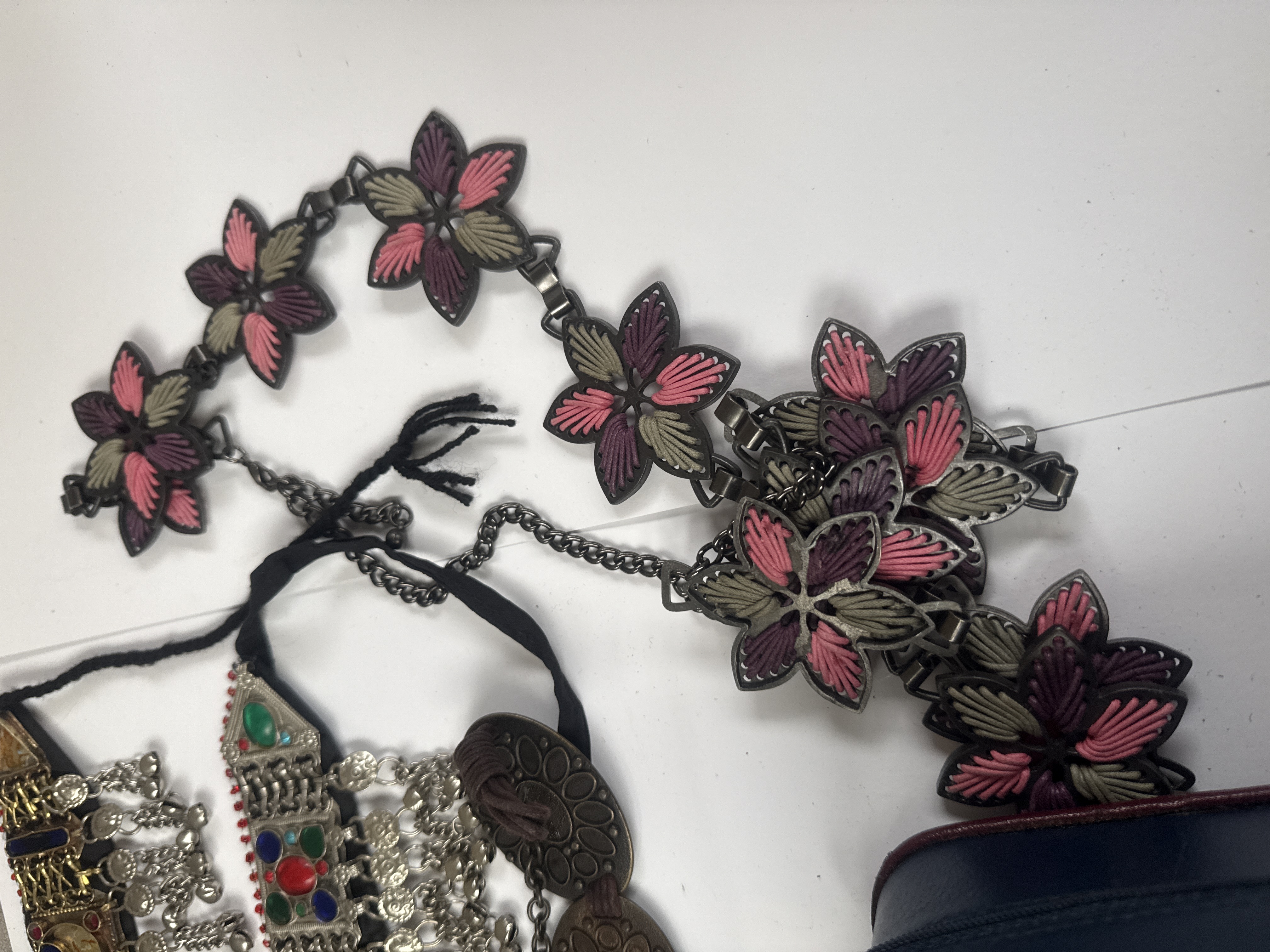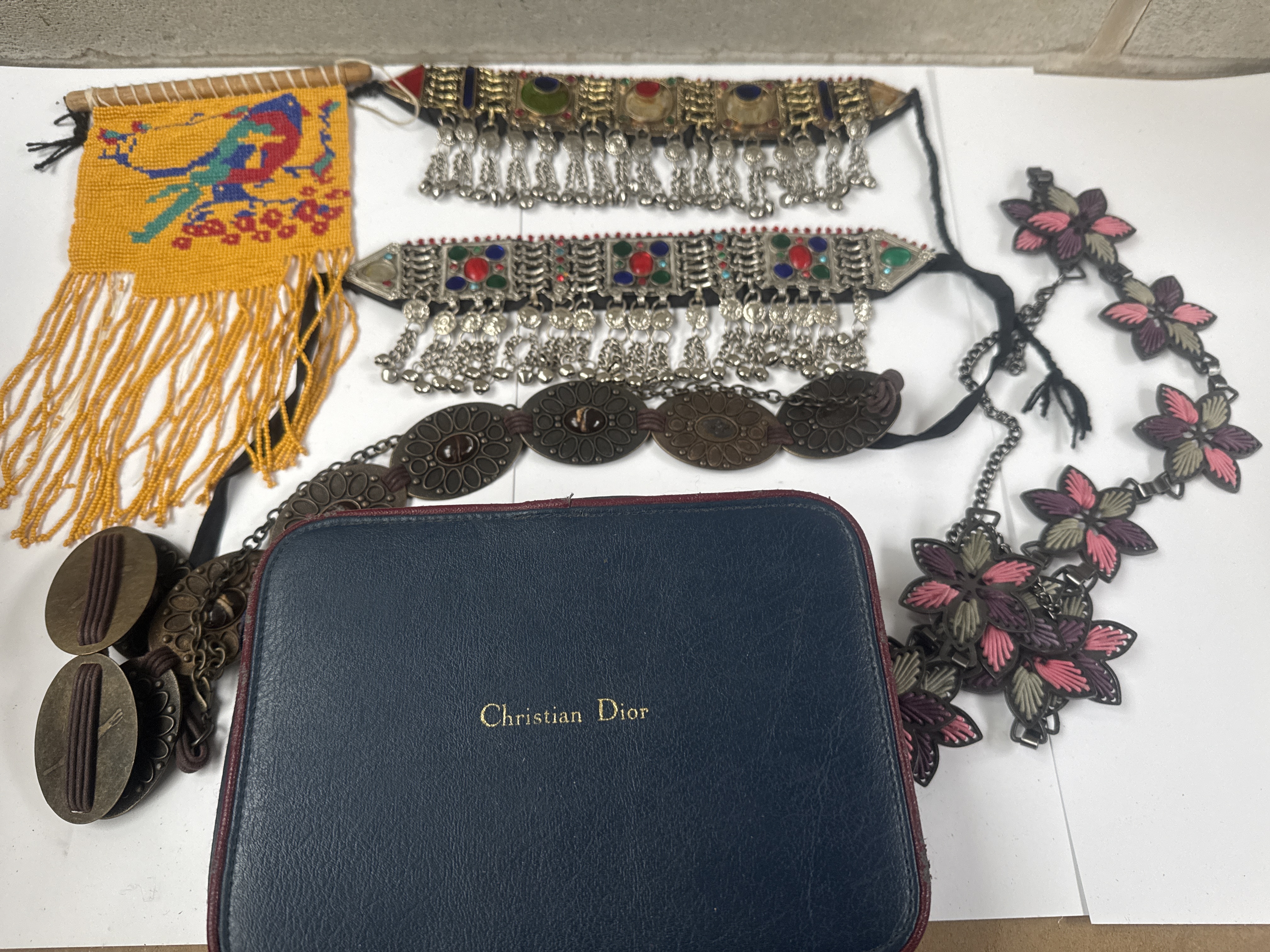 This collection consists of seven mixed fashion and ethnic accessory items. The primary piece is a rectangular, dark blue leatherette case embossed with the text Christian Dior, consistent with vintage Dior Parfums cosmetic pouches or small clutches. The lot also includes two similar ornate ethnic-style choker necklaces, consistent with Afghan or Kuchi tribal jewelry styles, featuring silver-toned settings, multi-colored cabochons (red, blue, green), and multiple dangling bell-form pendants. Also present is a long chain belt composed of large, round, dark bronze-toned medallions. A fashion necklace or belt is constructed of stylized, six-petal floral motifs rendered in darkened metal with pink and purple enameled or painted detailing. The collection is completed by a pair of small, brass-toned circular objects connected by short chains, resembling miniature cymbals or belt clasps, and a rectangular folk accessory crafted from yellow seed beads, depicting a colorful bird motif in pixelated form, finished with a lengthy yellow beaded fringe, and attached to a small wooden dowel at the top edge.