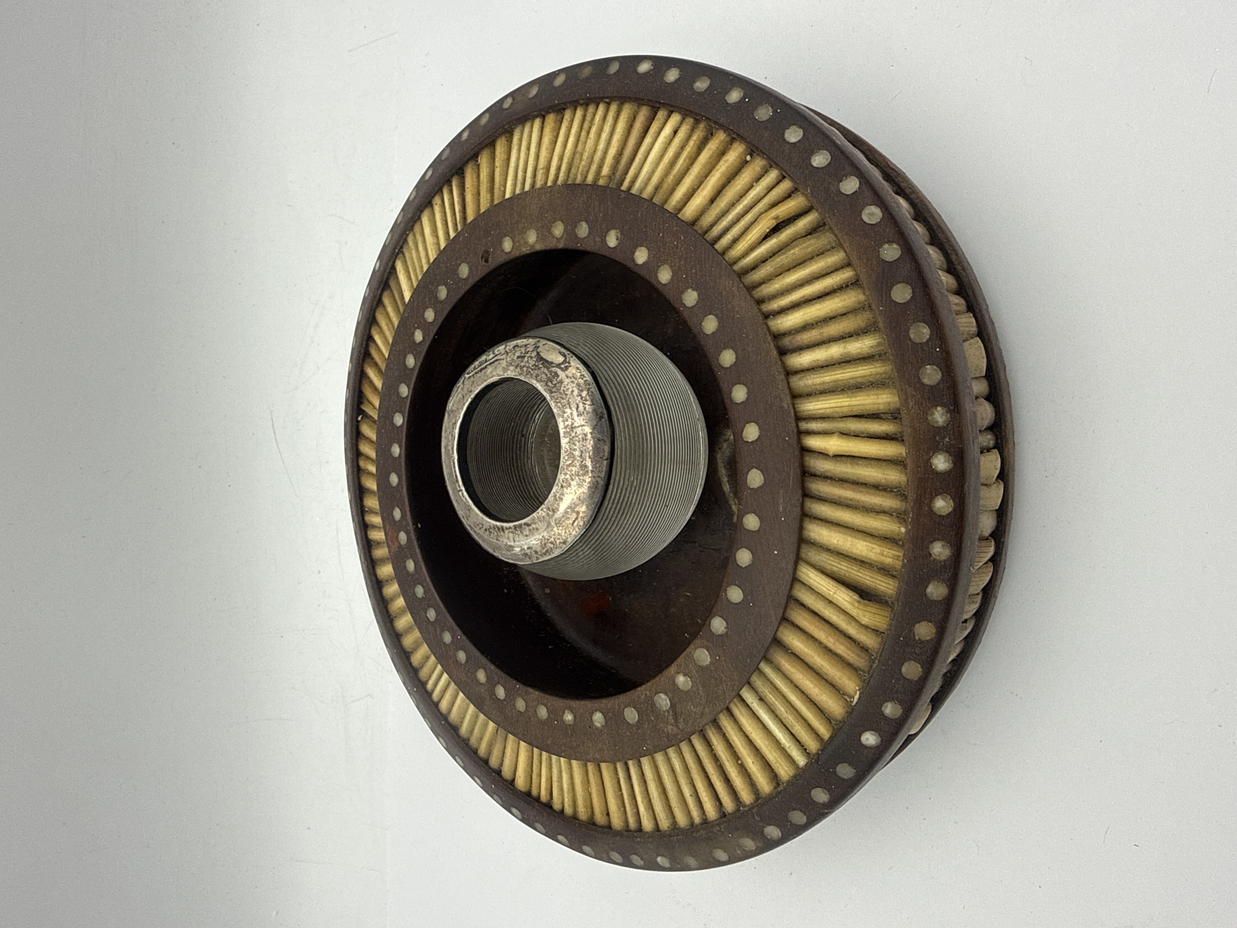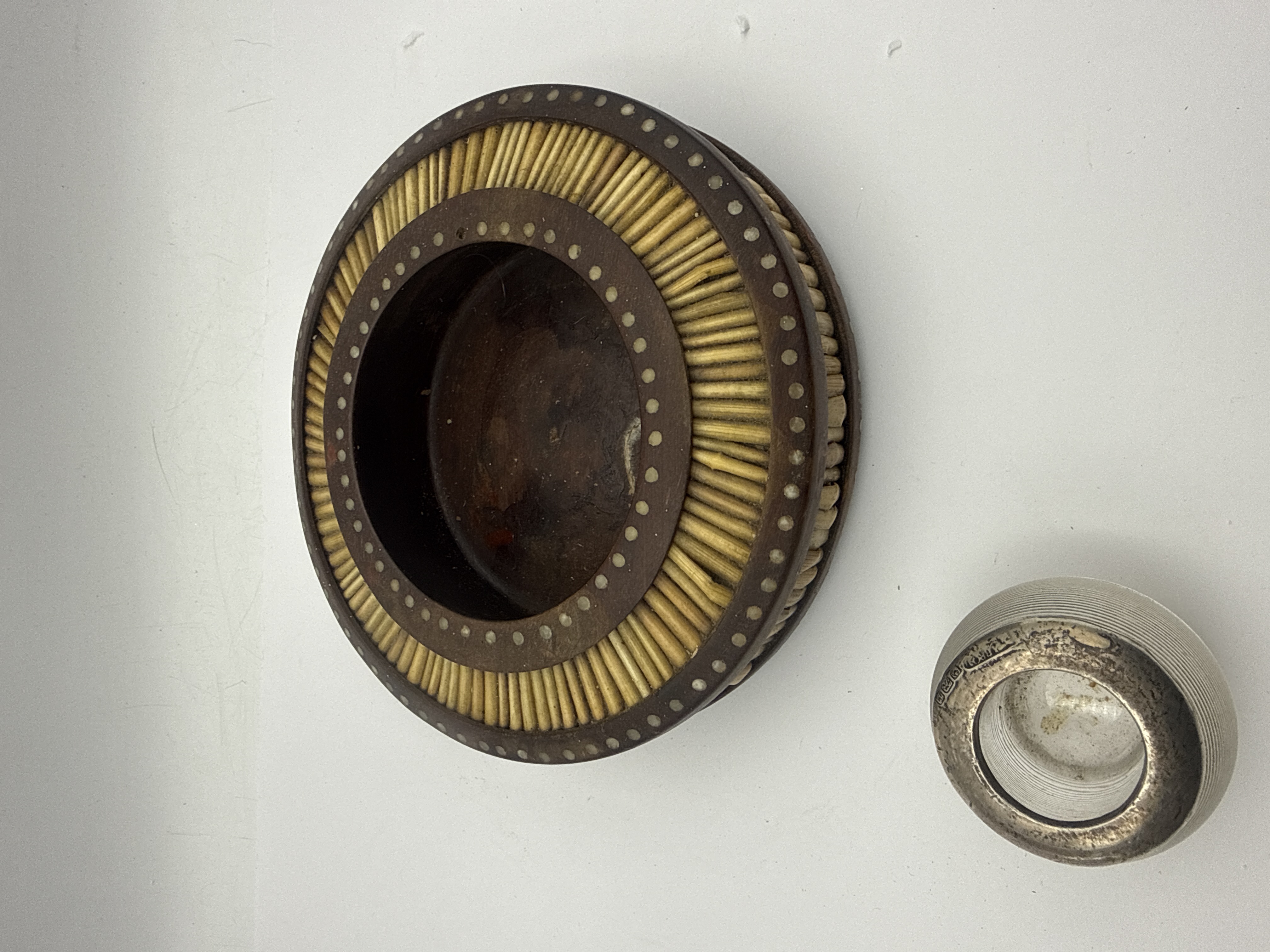 A lot of two items comprising an Anglo-Indian style Ebony and Porcupine Quill Catchall and a separate small metal vessel. The circular catchall features a wide, dark wood rim decorated with a dense radial arrangement of thin, cylindrical porcupine quill segments secured between concentric rings of small embedded metal studs. The exterior edge of the tray is carved with a scallop pattern, and the center is recessed, showing a dark patina consistent with use. The second item is a small, silver-toned metal cup or holder, possibly intended as a maté cup or tea glass holder, distinguished by deep, fine horizontal ribbing/corrugation on its body and a smooth, tarnished rim.