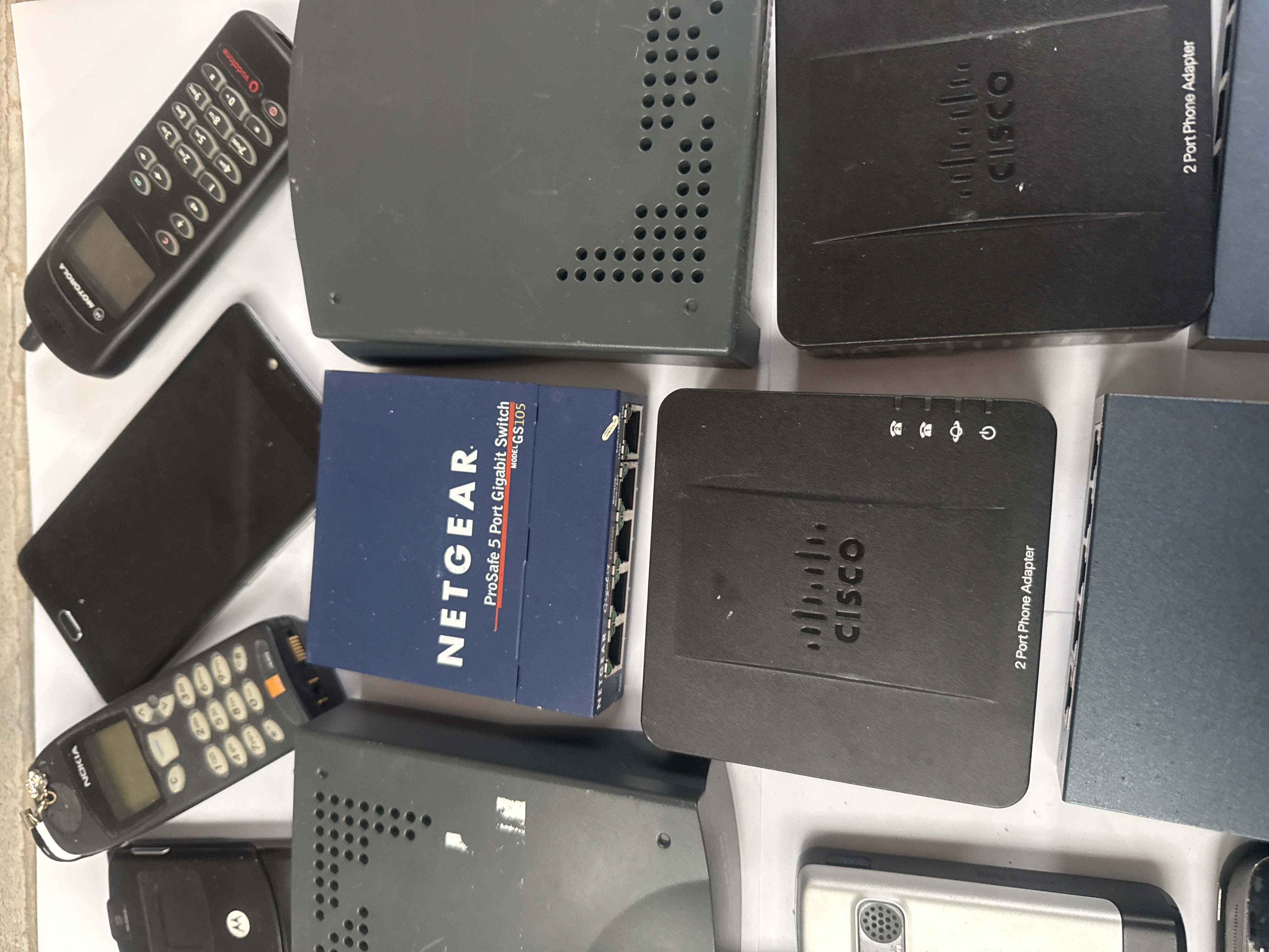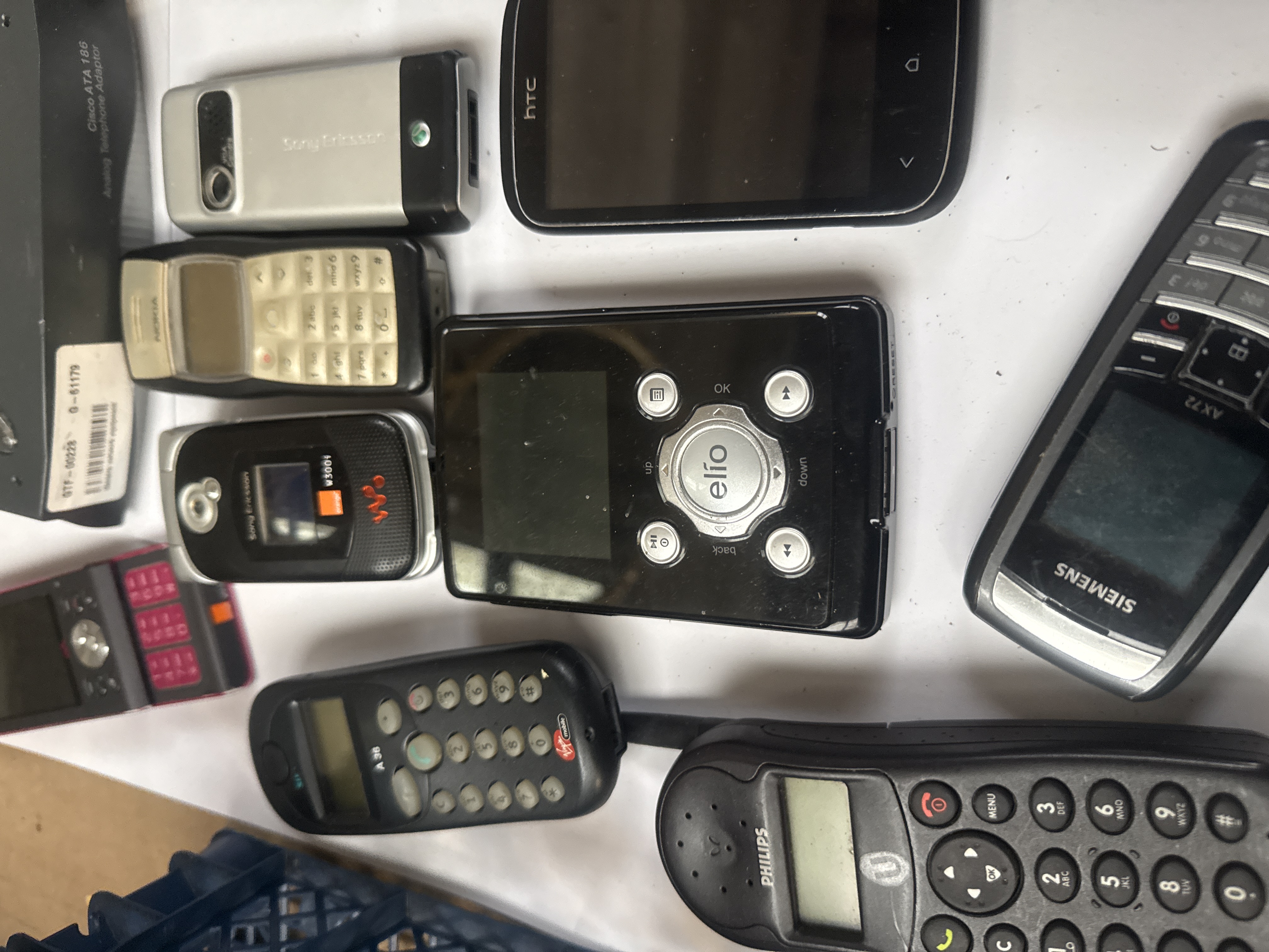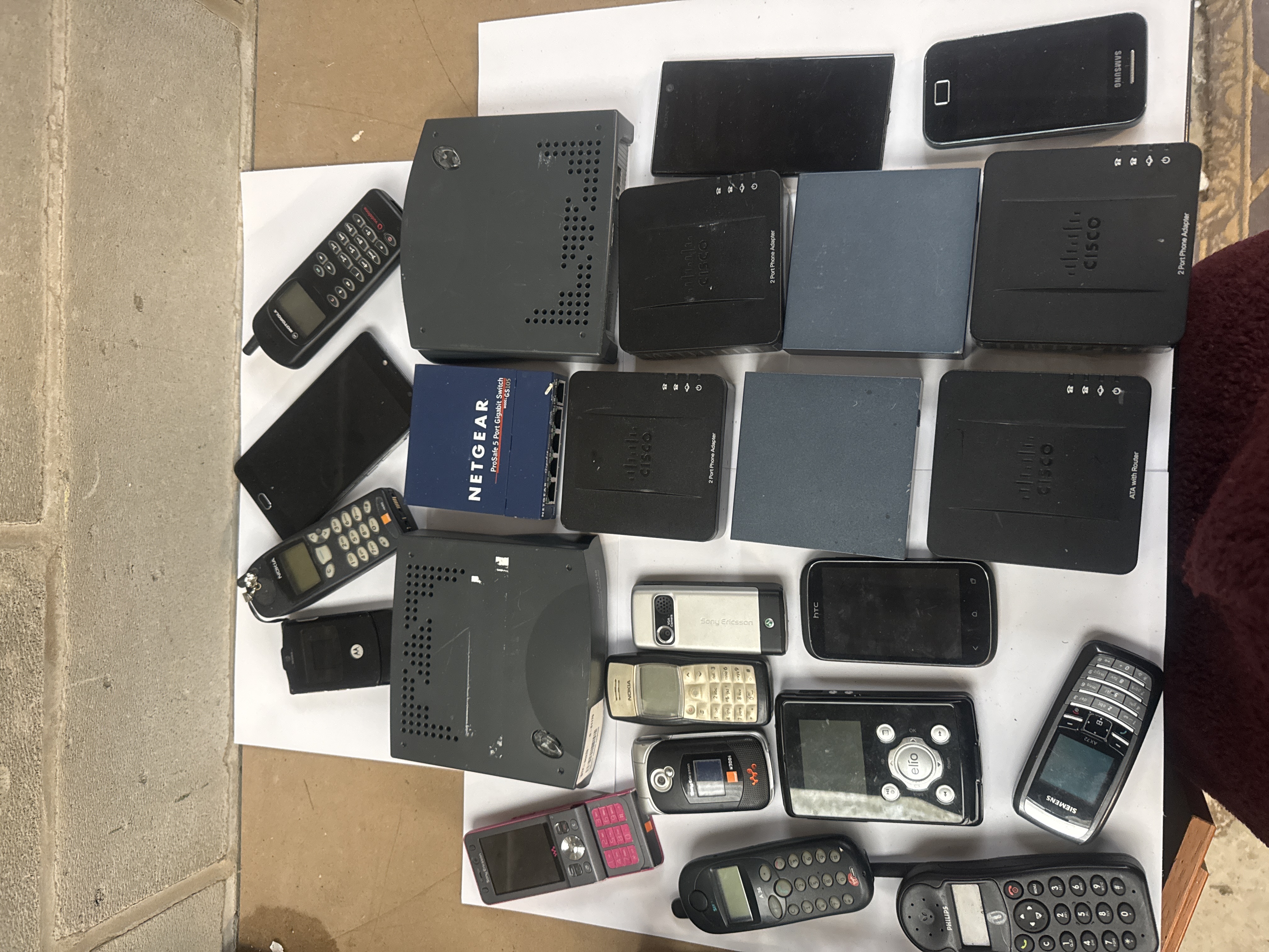 This collection consists of 24 items of consumer and networking electronics, primarily dating from the late 1990s through the early 2010s. The lot includes 14 mobile phones, 9 adapters, and 1 specialized media player/photo jukebox. The items are constructed primarily of black, gray, and silver plastic. The 14 mobile phones include various feature phones from manufacturers such as Nokia, Motorola, Philips, Virgin Mobile, Sony Ericsson (including a W300i), Siemens, and Samsung, alongside early smartphones including an HTC model. The 9 networking components and adapters include a blue NETGEAR ProSafe 5 Port Gigabit Switch GS105, and multiple black Cisco Voice over IP (VoIP) adapters, marked variously as 2 Port Phone Adapter and ATA with Router. The specialized media device is a black elío branded media player, identified as a photo jukebox.