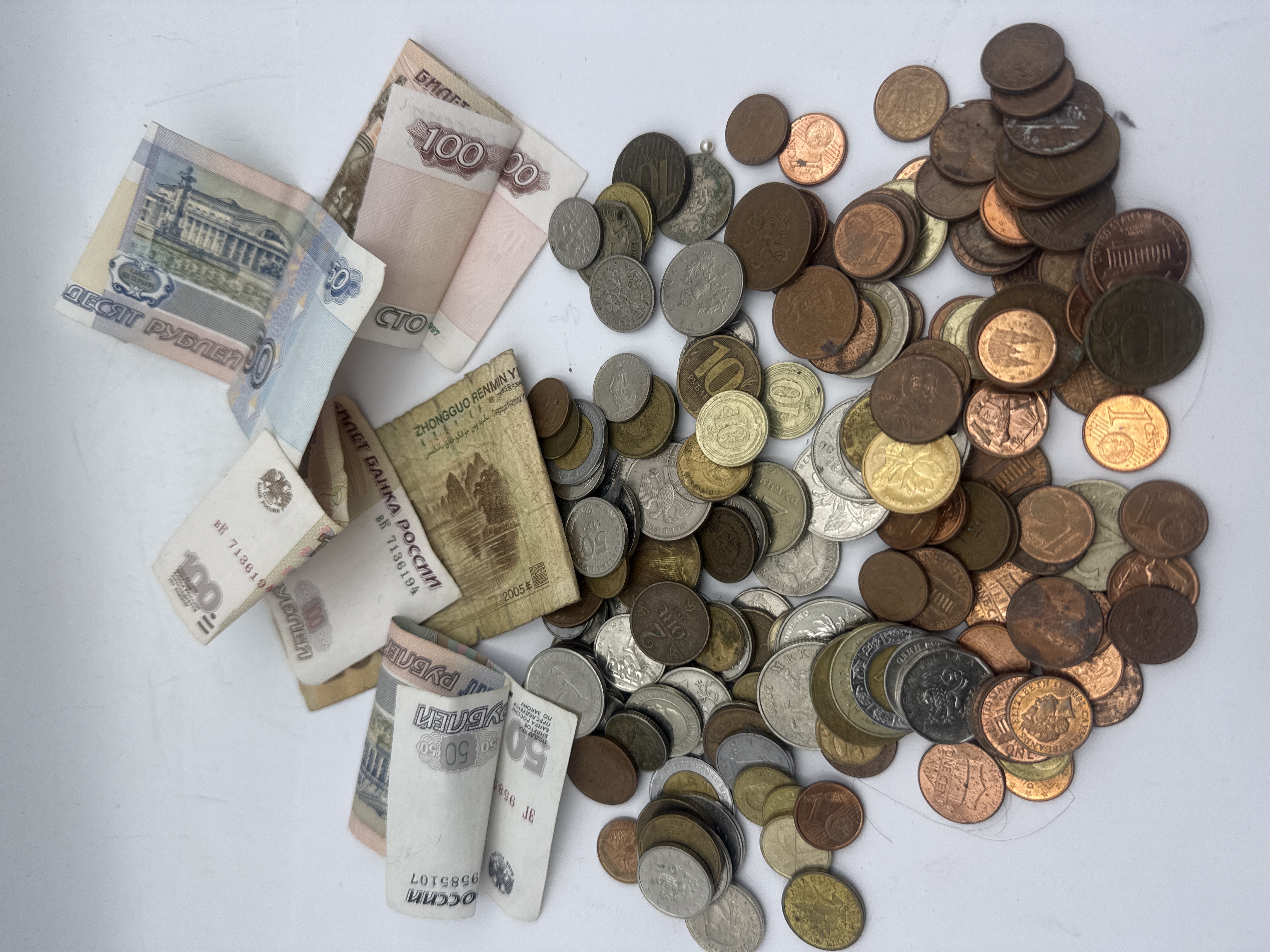A large assortment of numismatic items comprising eight paper banknotes and an estimated 180 metallic coins. The banknotes are predominantly Russian Rubles, including visible denominations of 50, 100, 500, and 1000 Rubles, suggesting post-Soviet era circulation. One older, brown banknote is visible, identified as Zhongguo Renmin Yin (Chinese Yuan). The collection of coins consists of a substantial quantity of mixed world coinage from various countries and eras. Visible currency includes US cents, Euro cents, UK pence, UAE dirhams, and various older European and Soviet-era coins, featuring mixed metals such as copper, bronze, and cupro-nickel. The collection is uncatalogued and sold as a bulk lot.