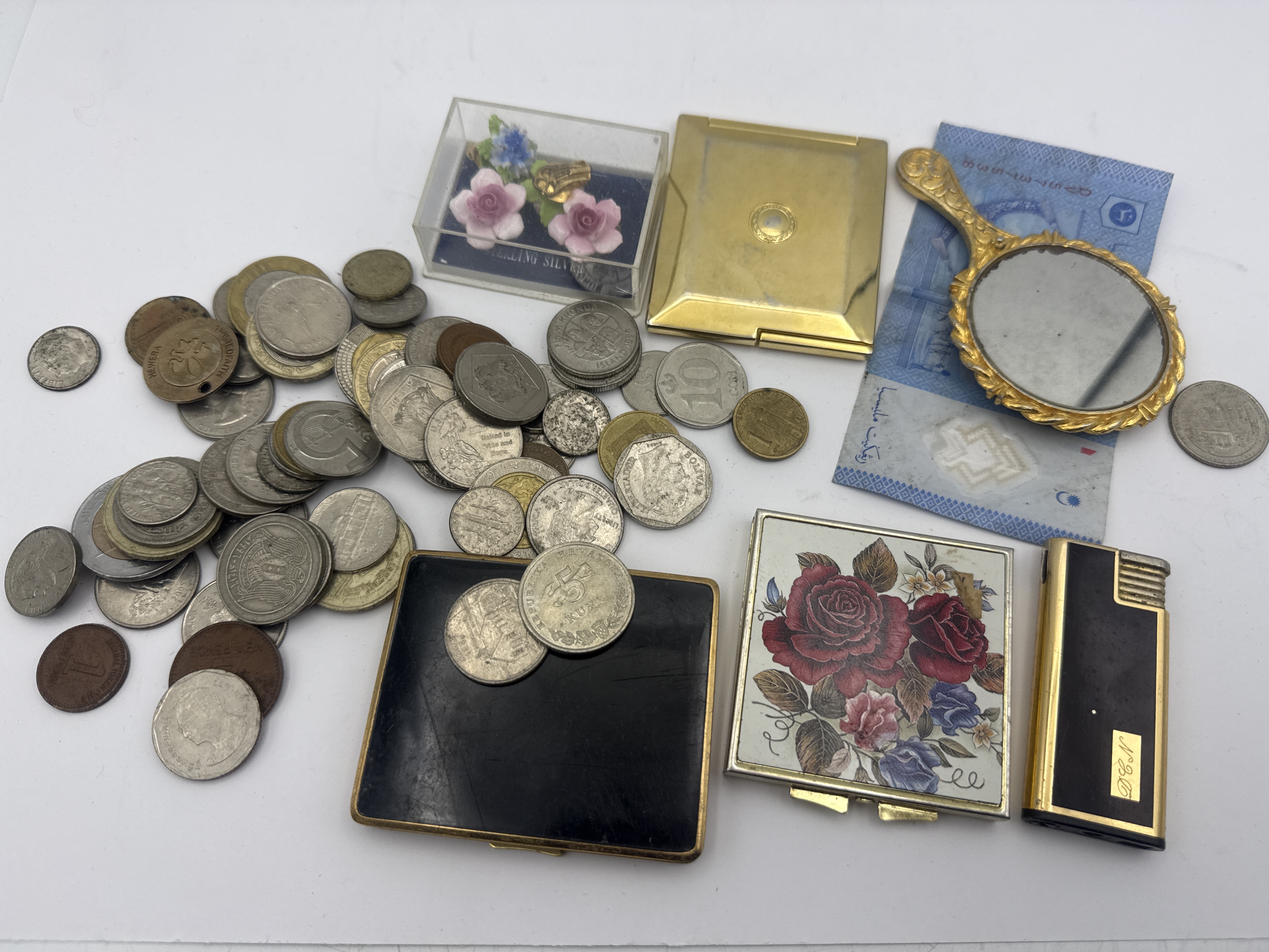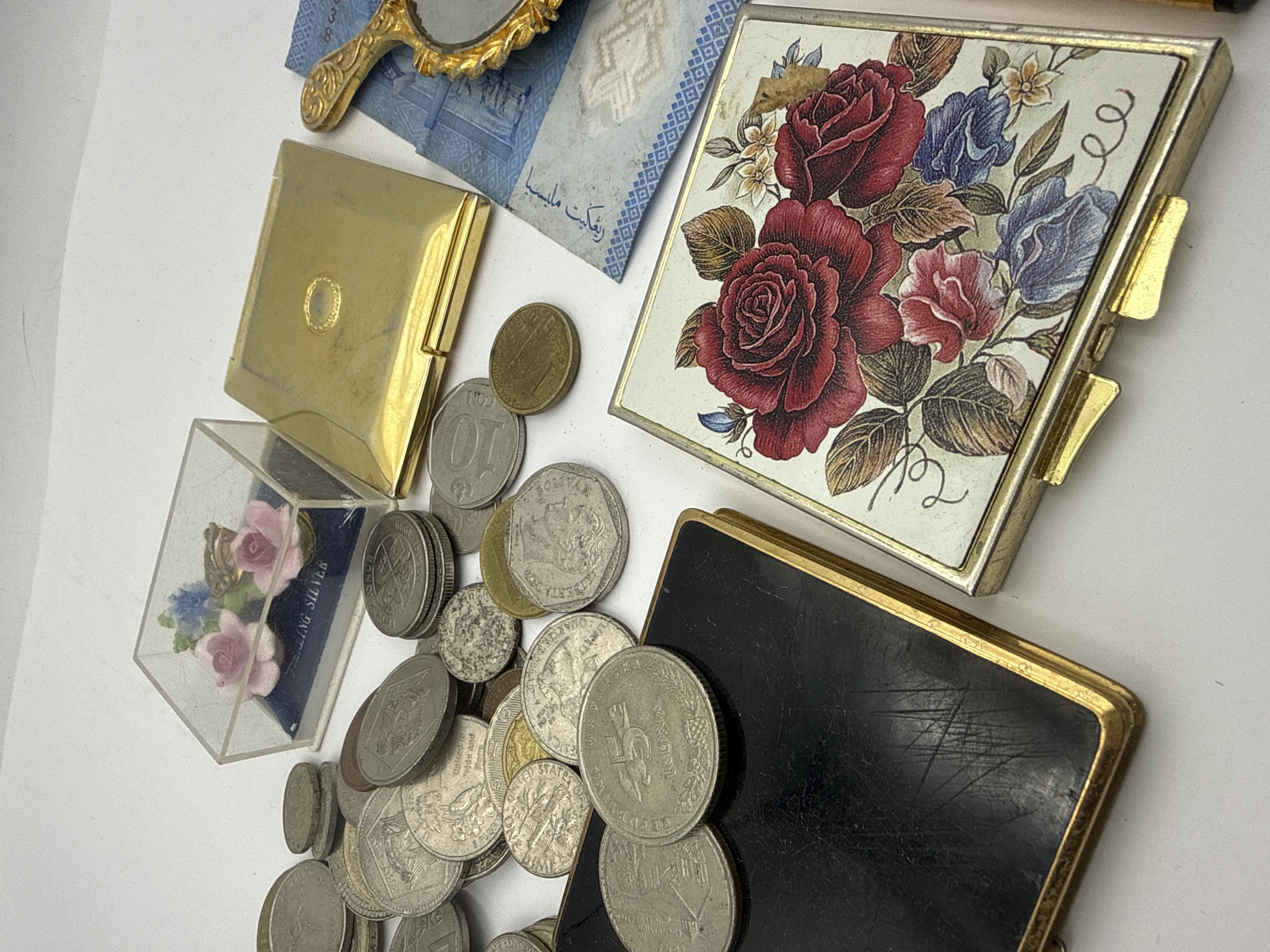 This mixed lot comprises a collection of 76 items. The primary components are four vintage cosmetic compacts/cases, 69 pieces of assorted circulating coinage, one folded Malaysian Ringgit banknote, and two miscellaneous accessories. The compacts include a heavily scratched rectangular black and gold-toned metal compact, a second square compact featuring a polychrome decal of red roses and blue flowers, and a plain polished rectangular gold-toned case. Also included is a small clear plastic display box containing decorative floral elements, with the inner insert marked STERLING SILVER. The miscellaneous items consist of a black and gold-toned object marked DEN, appearing to be a lighter or cigarette case, and a small, ornate, gold-toned handheld mirror. The coinage is varied in metal composition, age, and denomination, including copper, brass, and nickel alloys, with specific pieces identified as Malaysian 10 Sen coins.