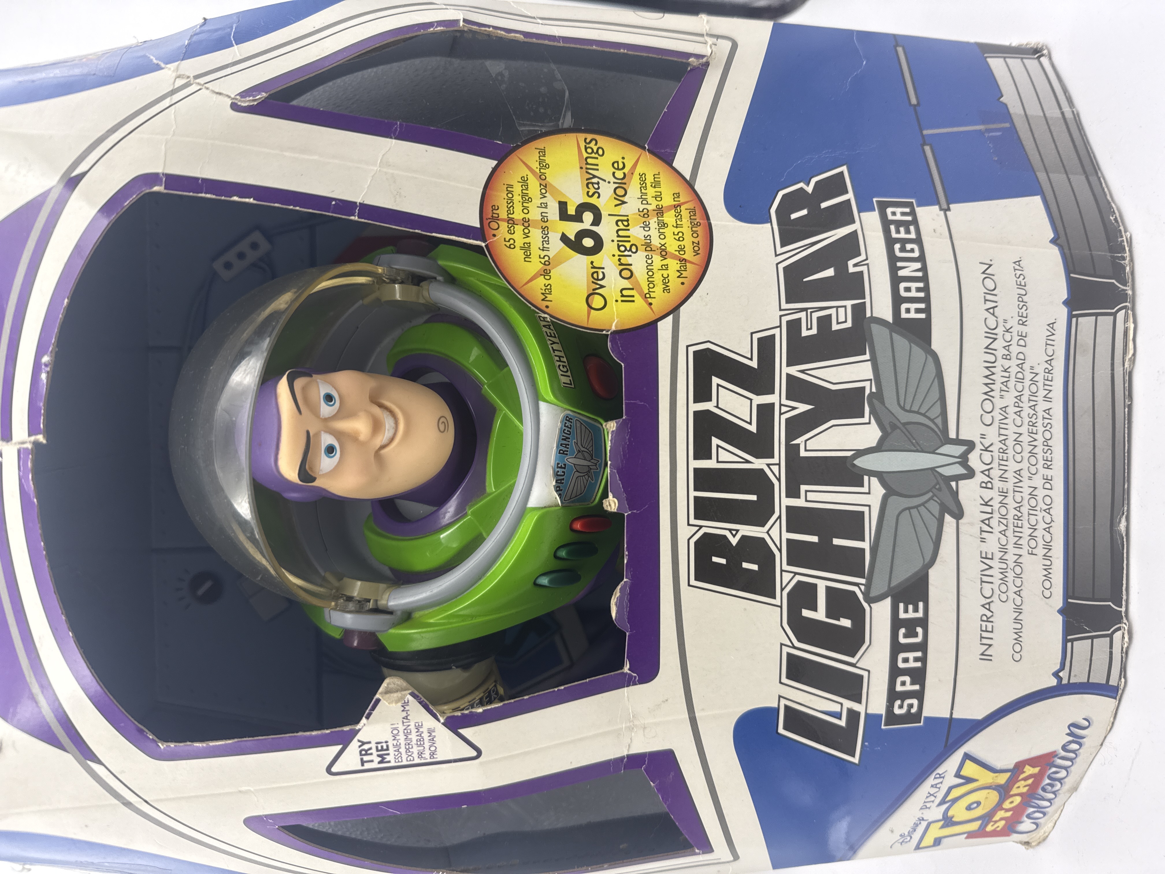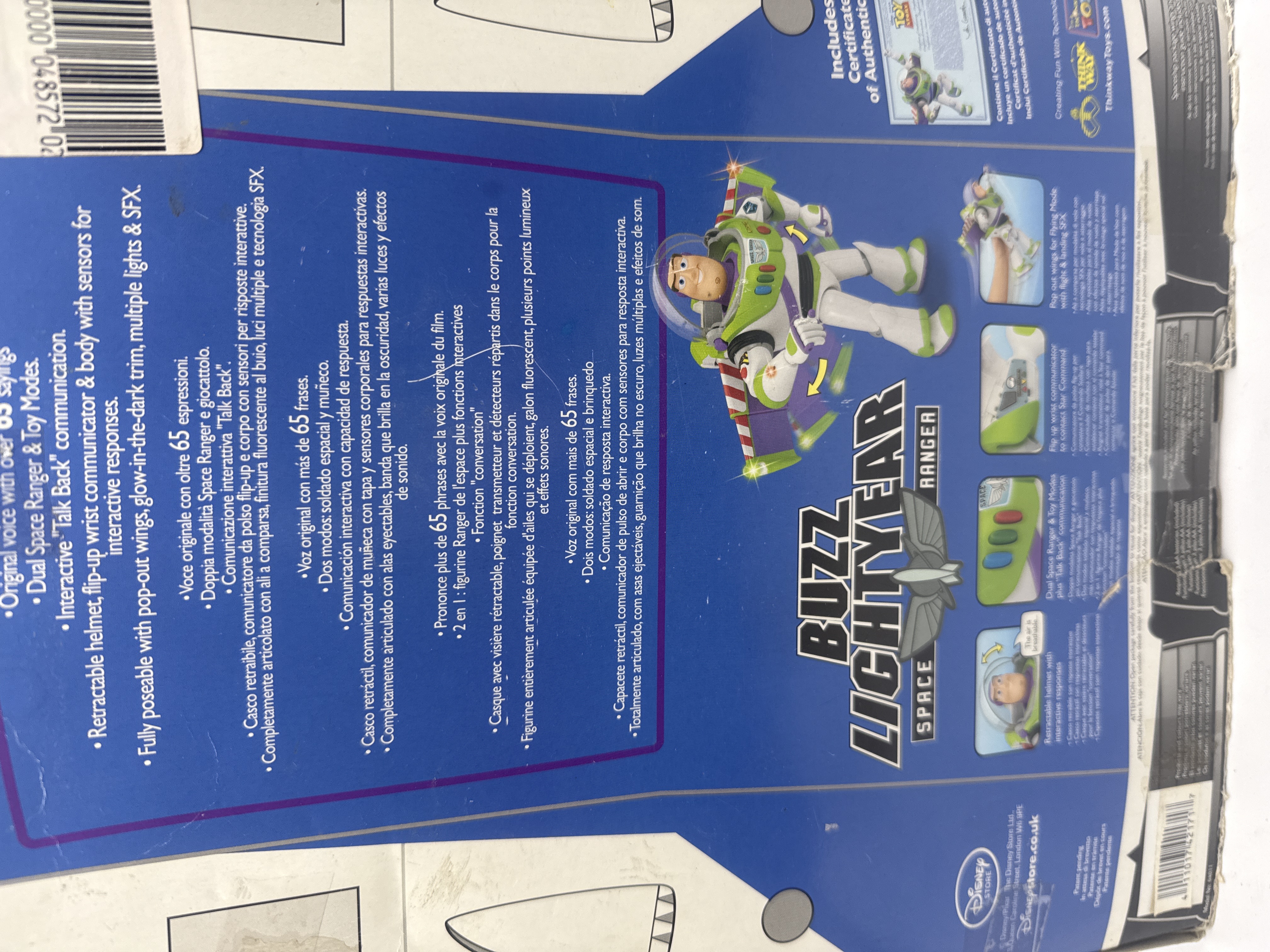 This lot contains a single Buzz Lightyear Space Ranger interactive action figure from the Disney/Pixar “Toy Story Collection.” The figure is constructed primarily of molded plastic and is retained within its original retail packaging. The packaging highlights interactive features including “‘TALK BACK’ Communication” and “Over 65 sayings in original voice.” Key text on the box is presented multilingually, including English, Italian, Spanish, and French, indicating an international release model. The figure features a retractable helmet and pop-out wings. The reverse of the packaging details the figure’s capabilities, including dual Space Ranger and Toy Modes, fully poseable limbs, and glow-in-the-dark trim with lights and SFX.