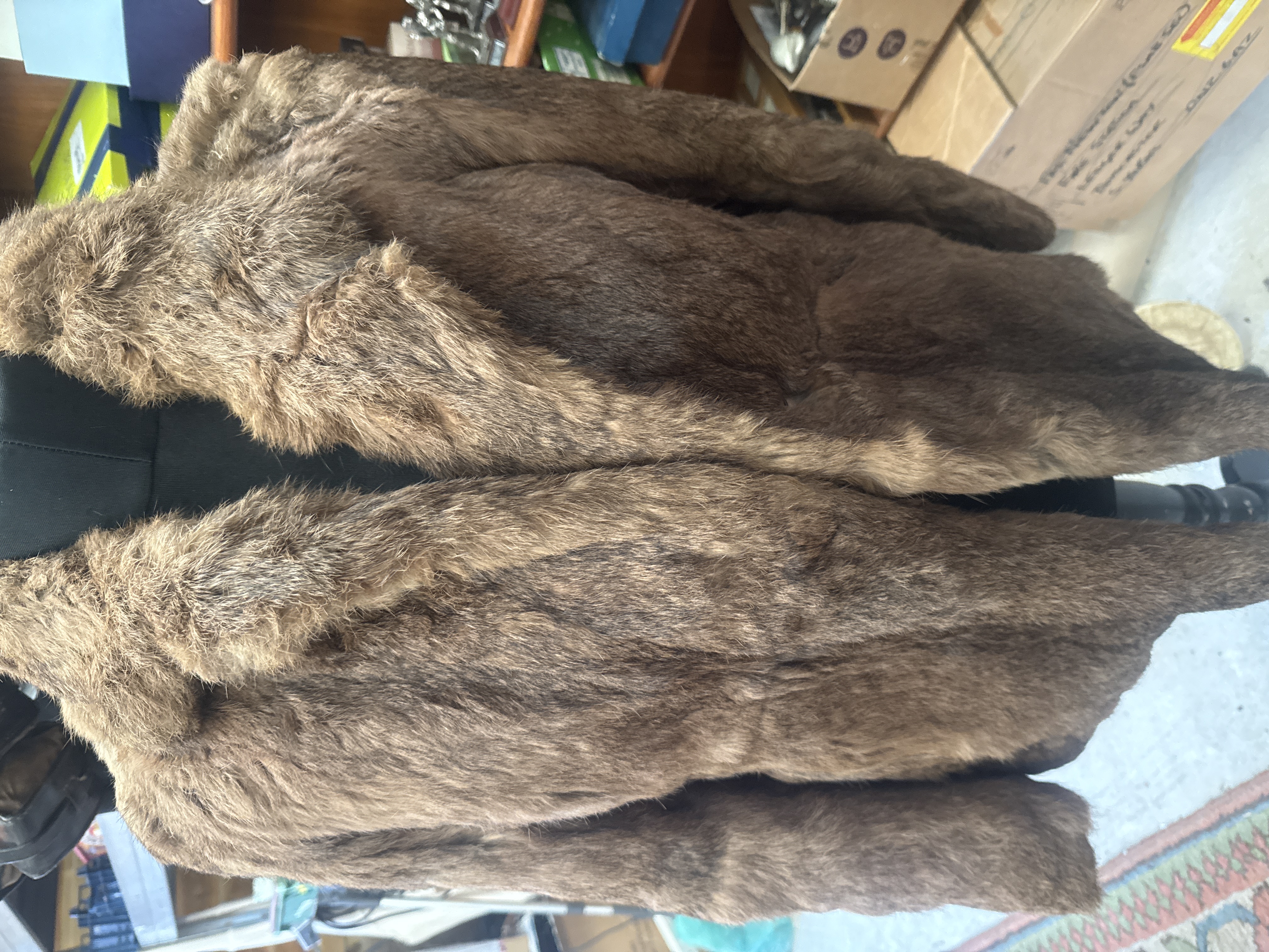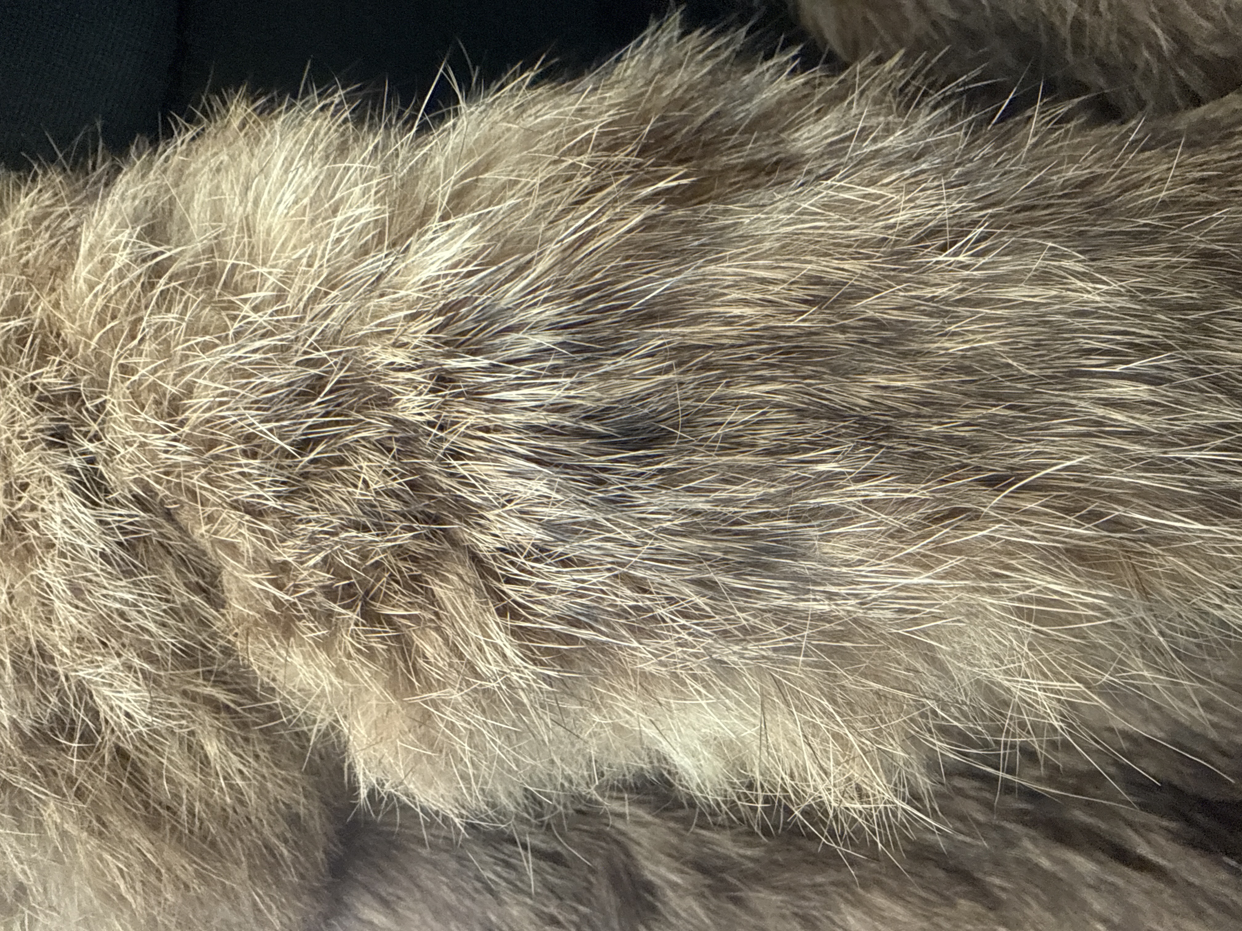 A single vintage short coat or jacket constructed from natural animal fur, identified through web intelligence as Raccoon. The garment is composed of pelts featuring long guard hairs in varied tones of medium brown, reddish-brown, and tan. The design includes a notched lapel collar, consistent with mid-20th century outerwear styling. No manufacturer labels, linings, or specific markings are visible.