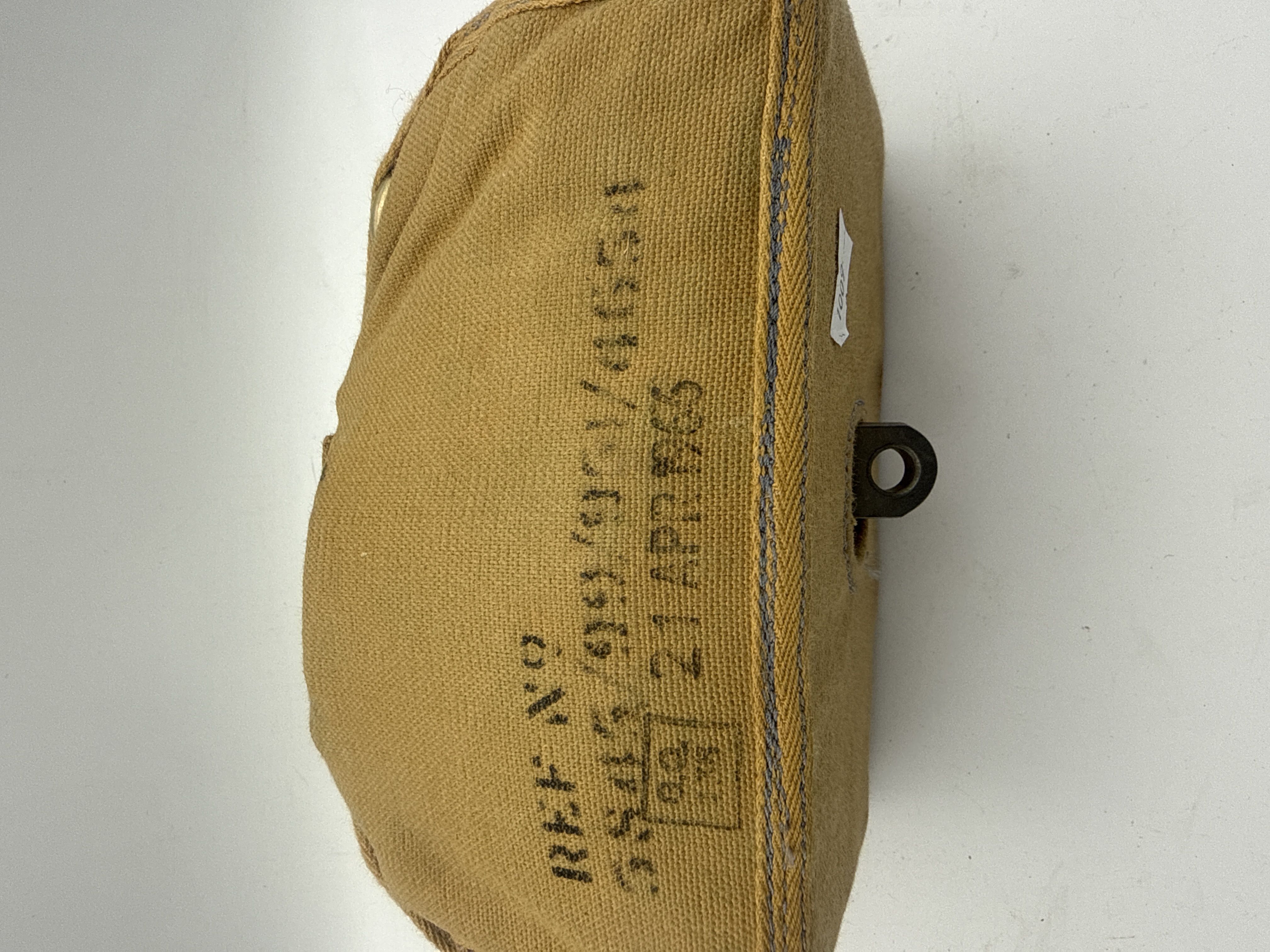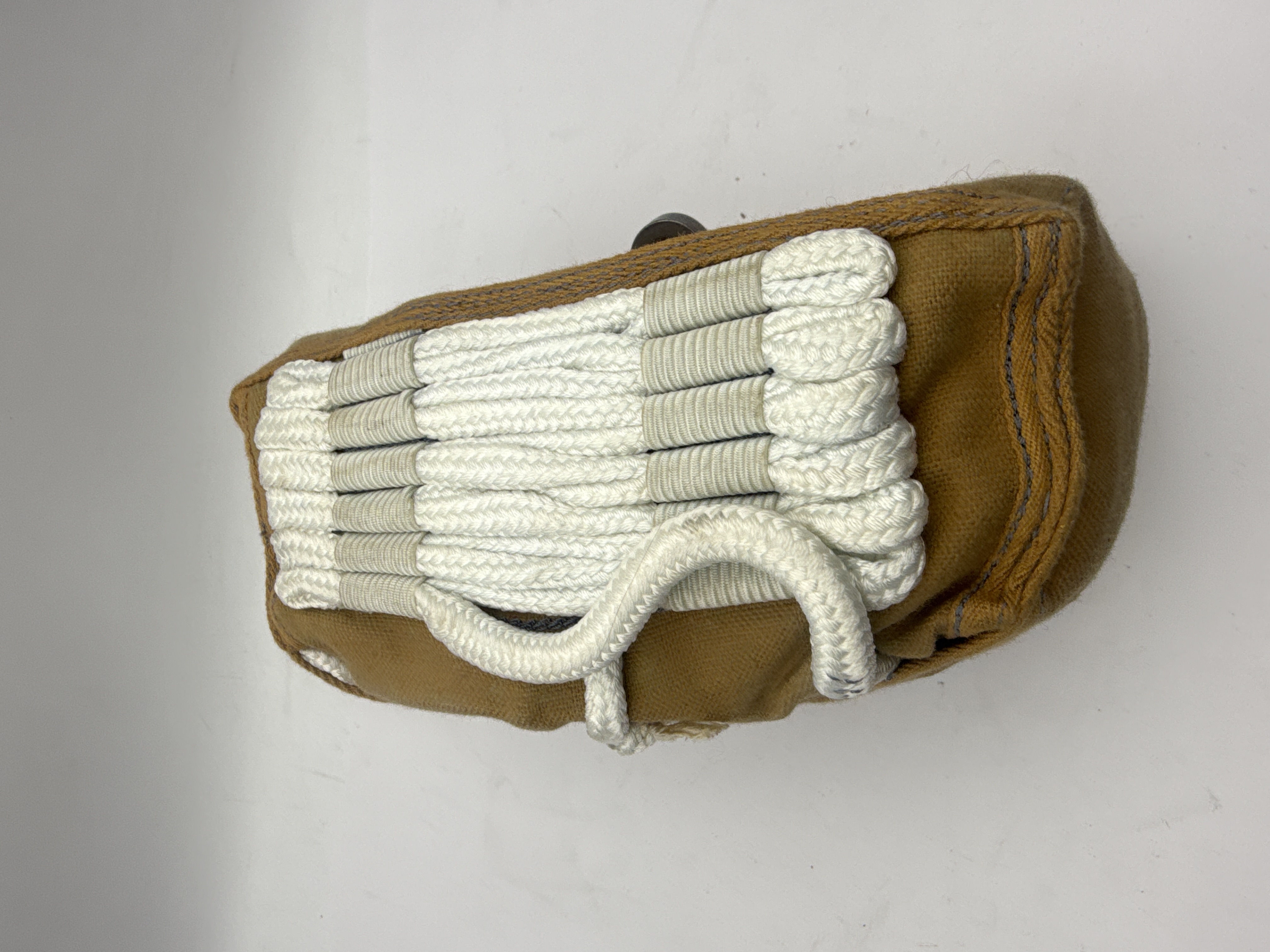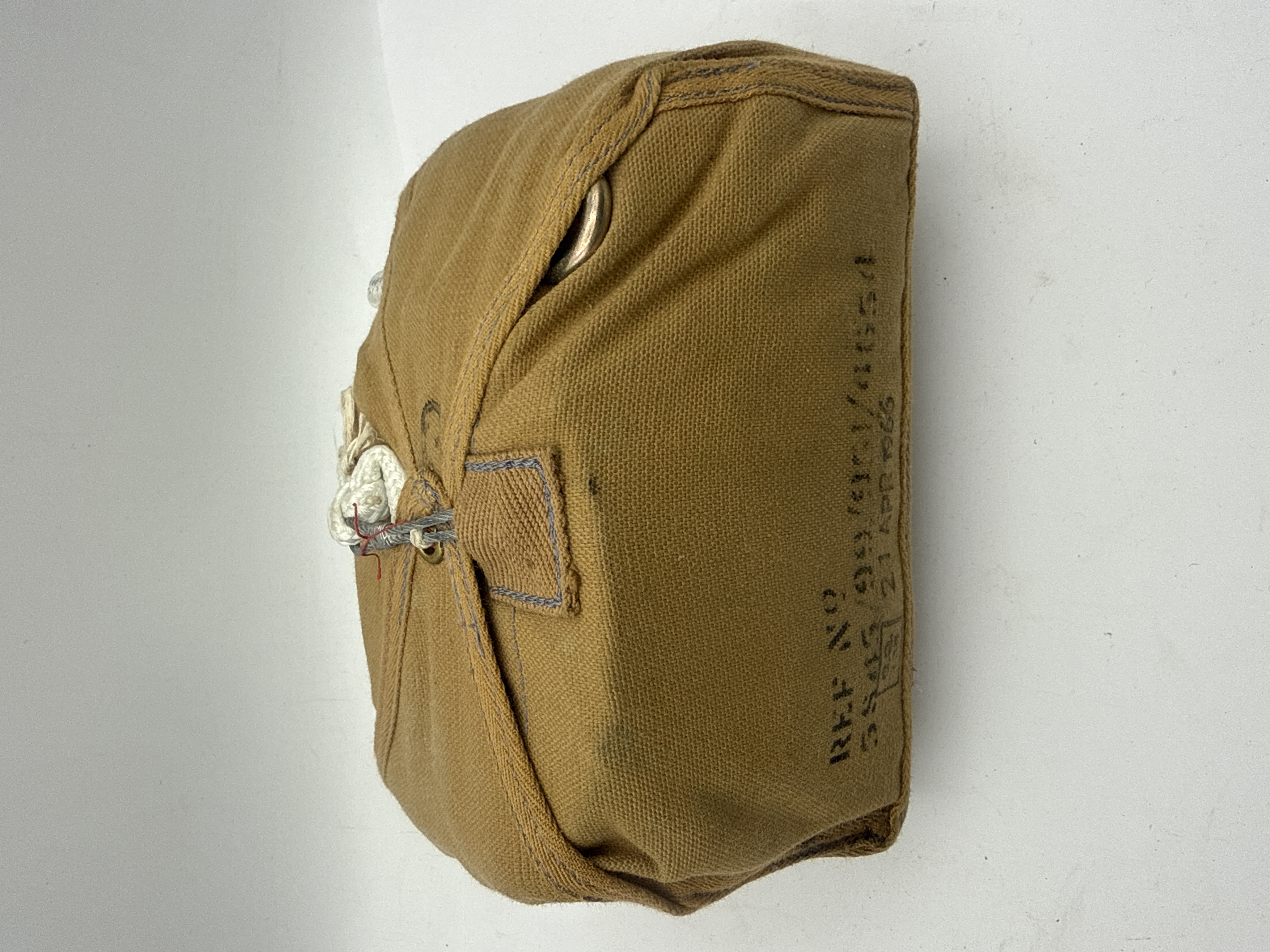 A singular vintage military parachute pack or utility bag, dating to the mid-20th century. The item is constructed from heavy tan/khaki canvas in a robust, roughly cuboid form, secured at the top with a white drawstring closure. The pack is presented in an apparently unopened state, containing a length of thick white braided rope, portions of which are coiled and secured externally to the canvas using multiple grey/tan textile bindings. A metal attachment loop or D-ring is affixed to the underside seam, consistent with military field gear or cargo deployment apparatus. Stenciled identification marks on one side include the reference number “REF NO 3845/99/951/4654,” and a manufacturing or inspection date reading “21 APR 1965.”