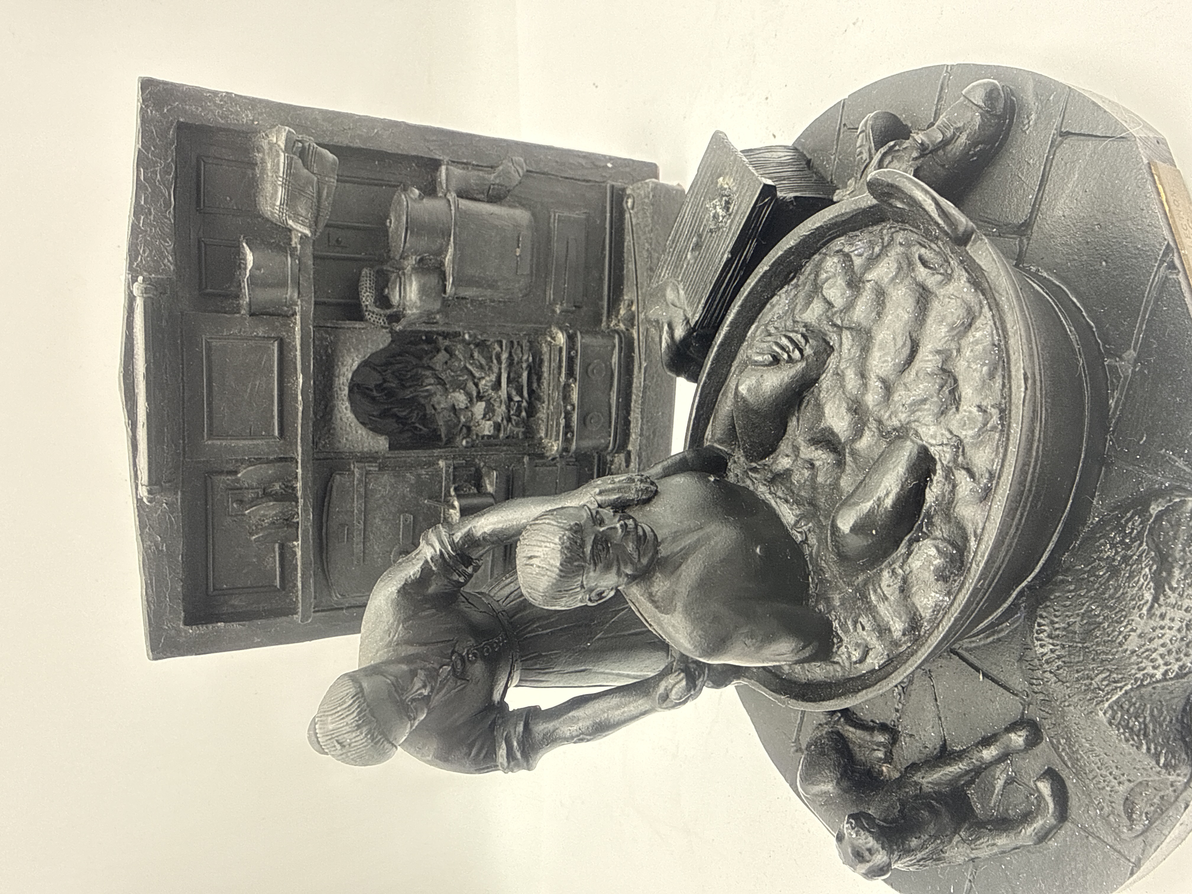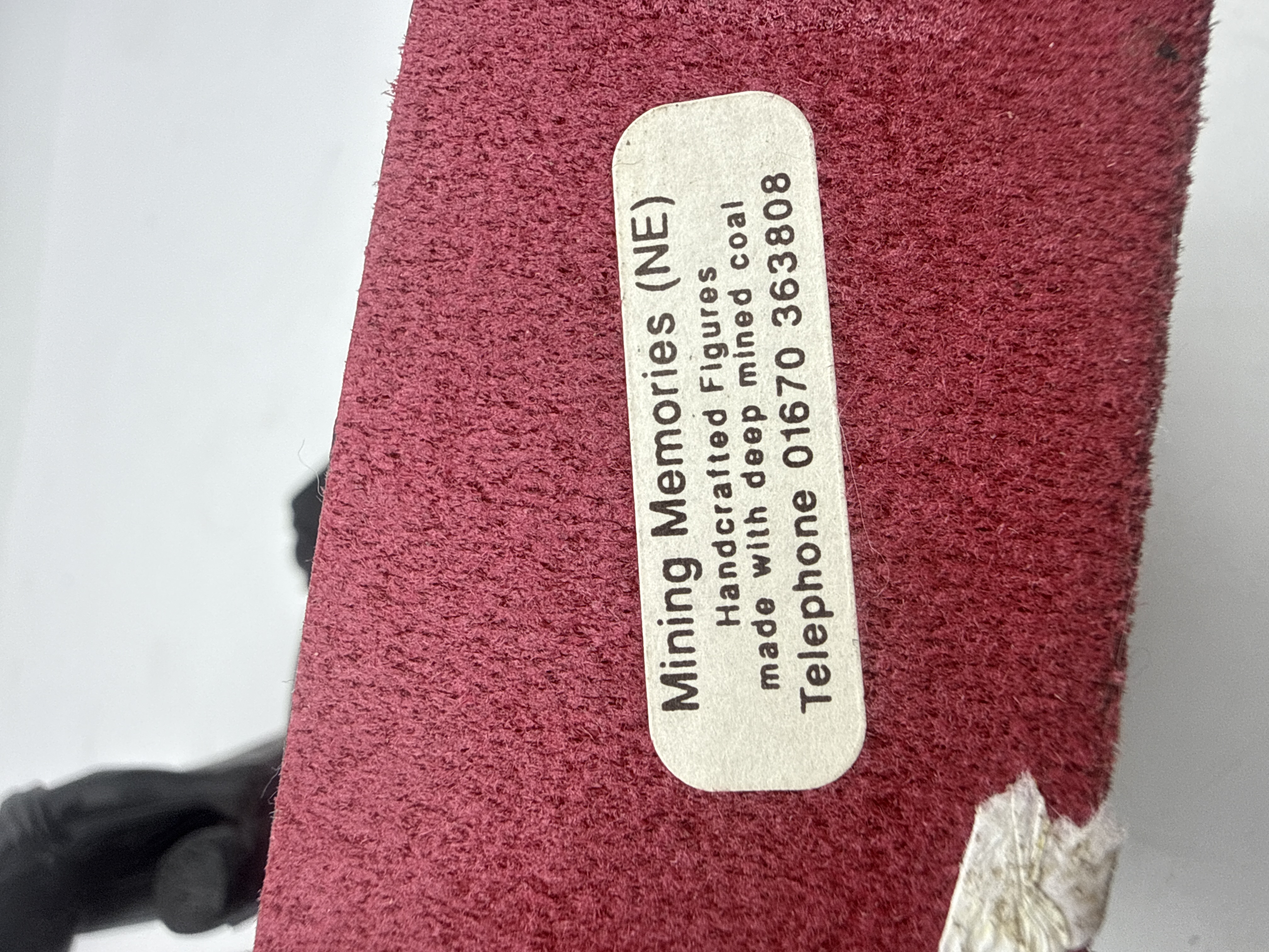 A sculptural tableau produced by Mining Memories (NE), crafted from deep mined coal. The piece depicts a figural genre scene of a domestic interior, specifically a washhouse or kitchen. A woman is shown assisting a man bathing in a large, round tub. The base features a small dog and a textured area suggesting a rug or cat. A tall, detailed background panel depicts a kitchen setup, including a central fireplace or stove surrounded by cookware and cabinets. The underside of the base contains the original manufacturer’s label marked “Mining Memories (NE) Handcrafted Figures made with deep mined coal Telephone 01670 363808.” A faint handwritten number, possibly 3050, is visible on the top edge of the background panel.