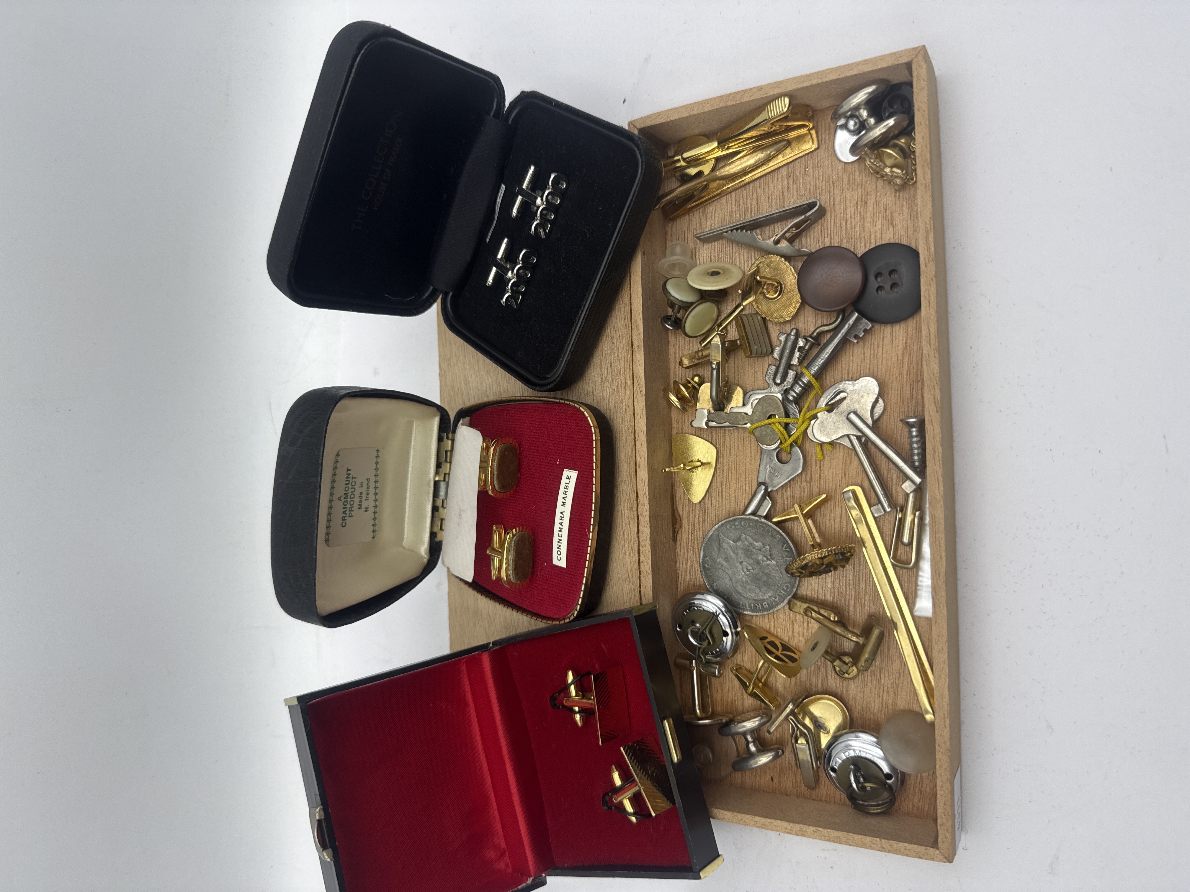 A large mixed lot comprising 42 individual items of men’s dress accessories and miscellaneous small objects, presented partially in three original boxes and loose in a shallow wooden tray. The lot primarily consists of cufflinks, tie clips, and tie bars executed in various mixed metals, including gold-tone and silver-tone finishes. Branded items include a pair of gold-tone cufflinks set with polished Connemara Marble, labeled internally as “A CRAIGMOUNT PRODUCT Made in N. Ireland,” housed in a red velvet-lined box. Also included is a pair of silver-tone novelty cufflinks featuring the design ‘2000’, housed in a black box marked “THE COLLECTION HOUSE OF FRASER.” Styles of cufflinks range from classic dumbbell and disc designs to textured and novelty motifs, including a golf club design. The loose items in the tray include incomplete pairs of cufflinks, five assorted tie clips/bars/tacks, eight assorted keys (some bundled with yellow string), two large resin/wood buttons, one metal coin (appearing to be a British denomination), one screw, and various small metal charms or fobs. The collection represents a variety of mixed vintage and modern manufacture.