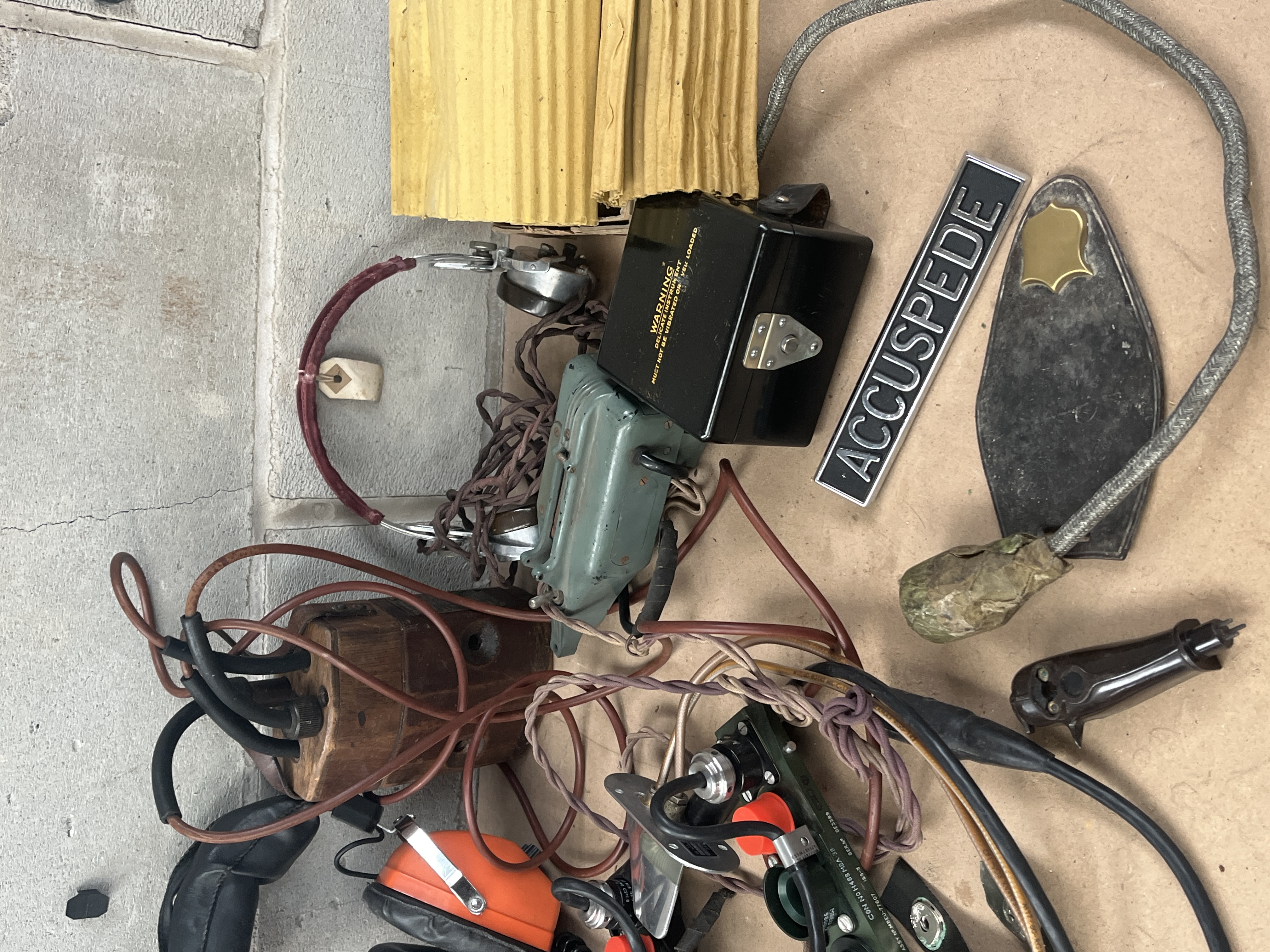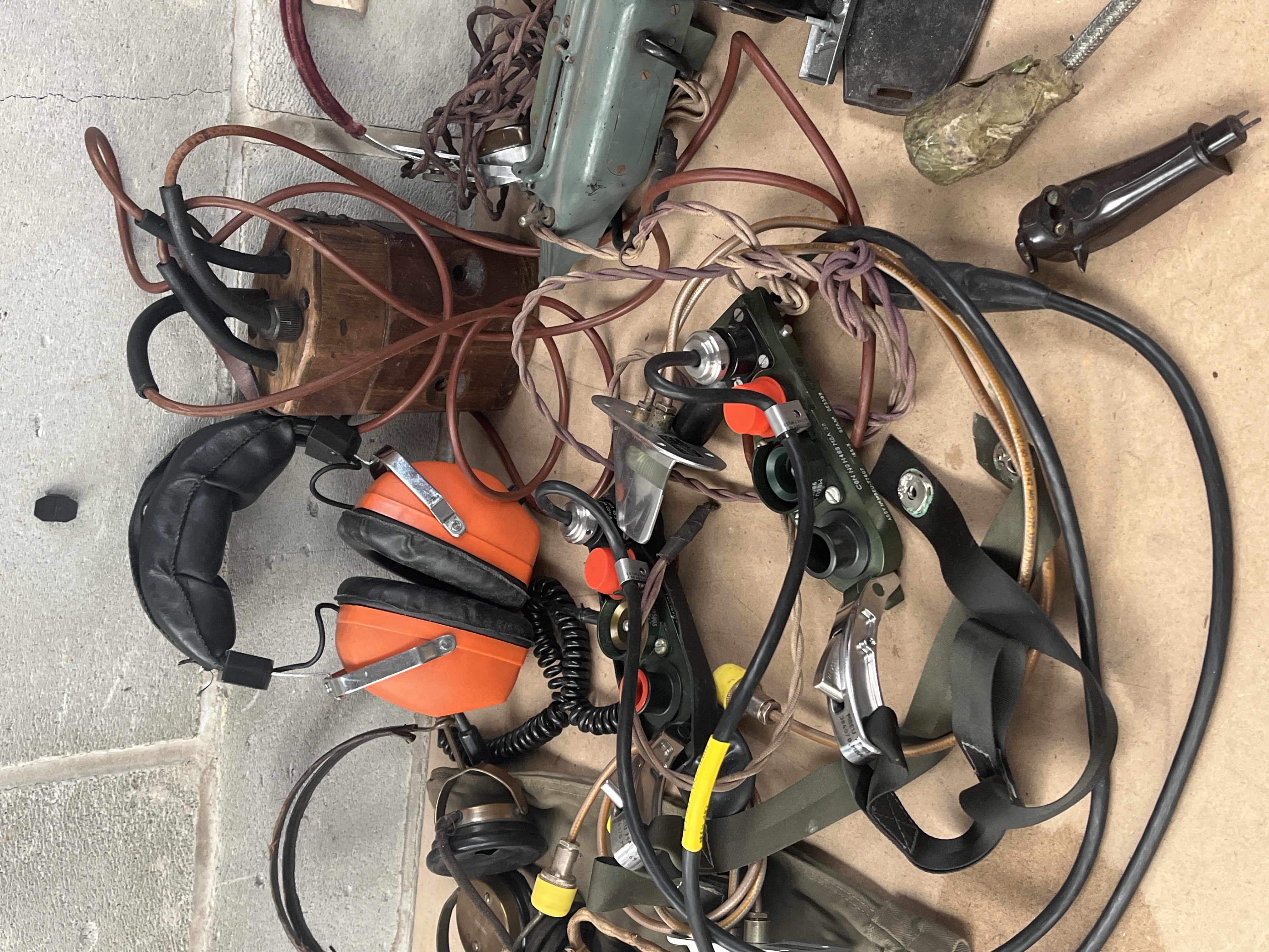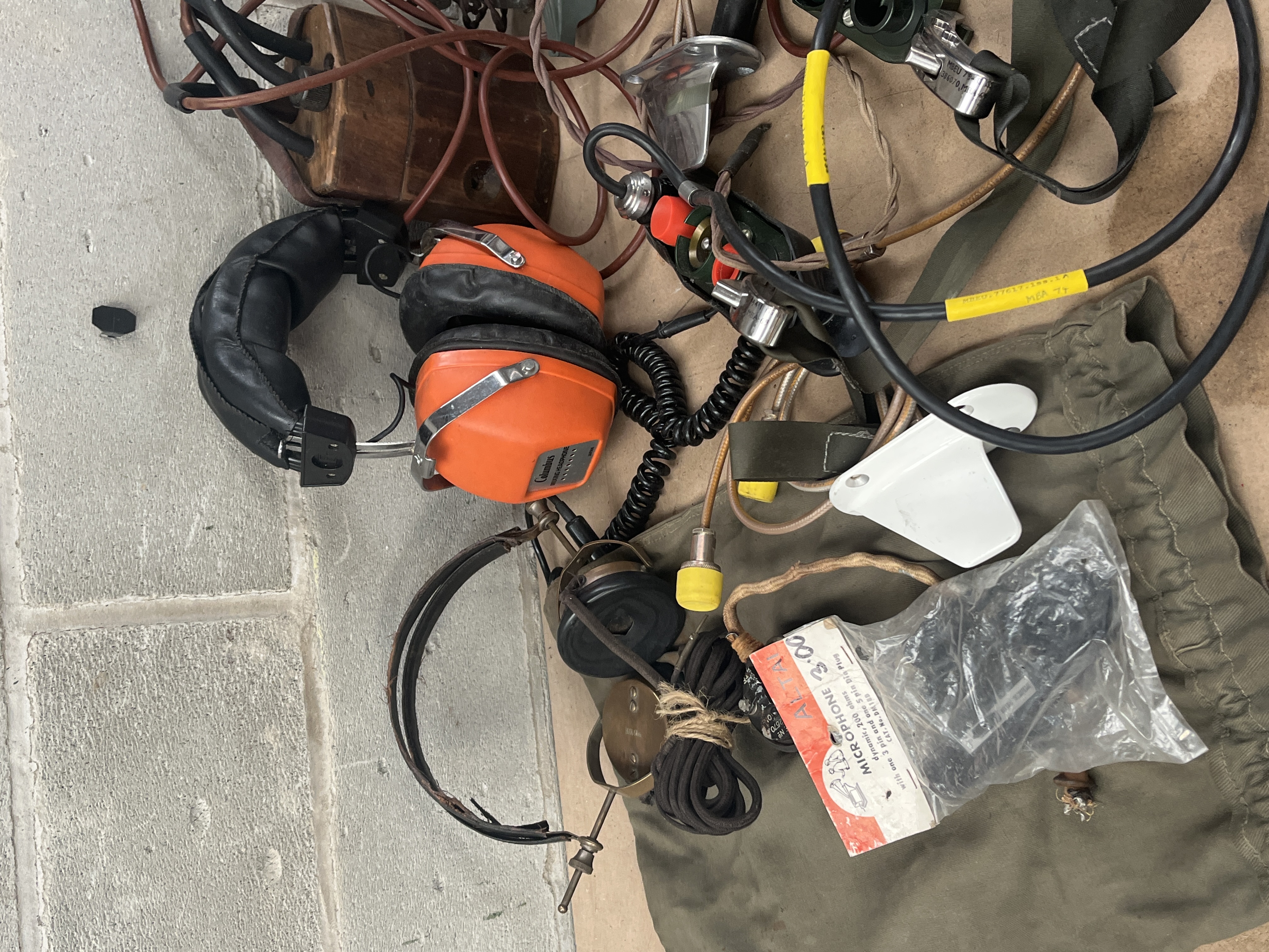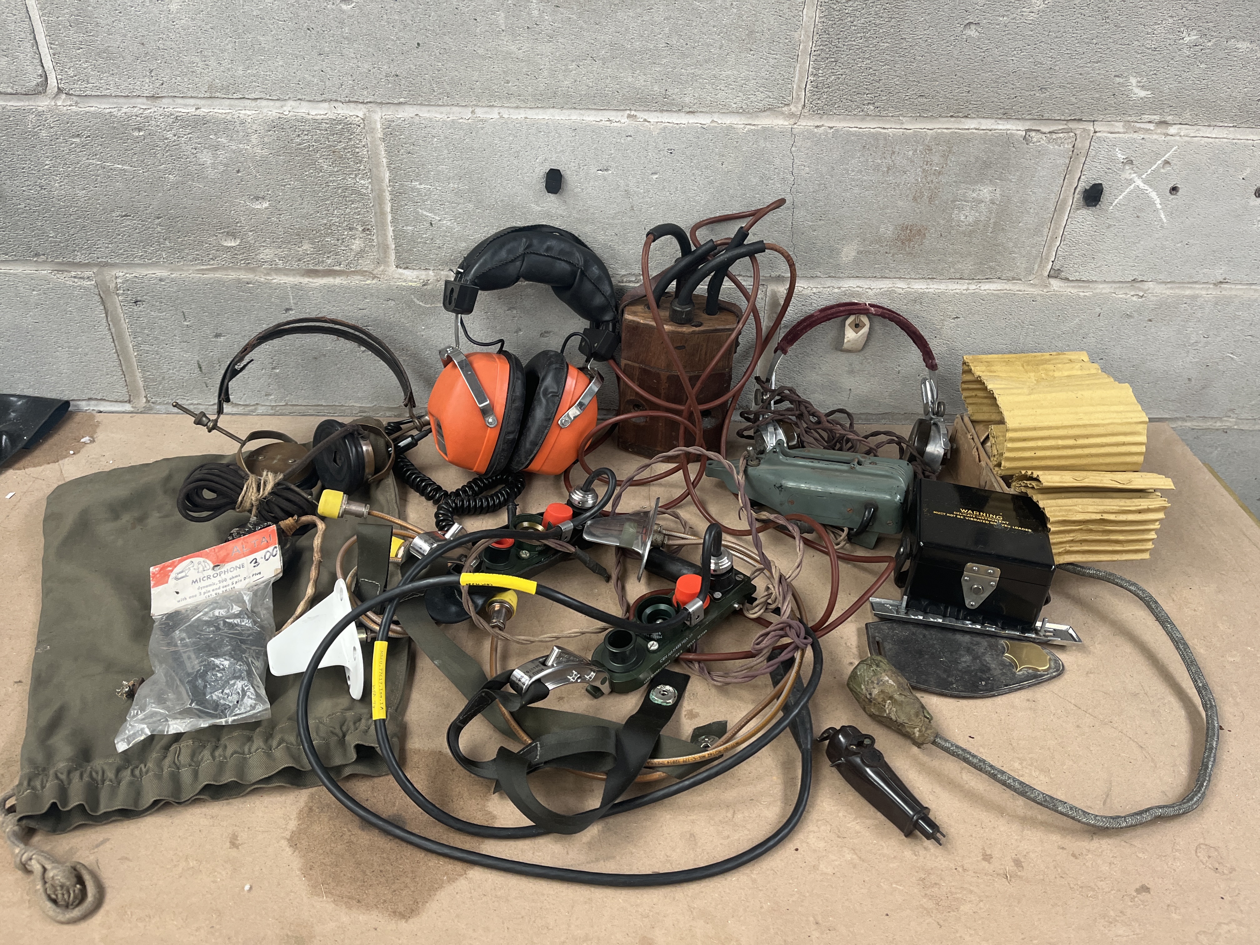 A collection of pieces of mixed communication, audio, and industrial equipment, primarily consisting of vintage military and aviation surplus components. The lot includes two complete headsets: one vintage style featuring thin ear cups and leather padding, consistent with WWII-era US military radio headphones, and one modern industrial ear defender set marked “Peltor” in bright orange. Also present is an olive drab canvas carry bag containing a packaged set of new microphone parts labeled “MICROPHONE 3.00.” The collection features multiple electronic control units and components, including two olive green metal switch boxes (one partially marked “CSC-HCH-100-30…”), a wooden block appearing to function as an electrical hub with multiple wiring connections, and a small black hinged box bearing a “WARNING” label advising “DO NOT OPERATE WHILE LOADED.” Additional items include a tangle of various wiring harnesses and connectors, a maroon-banded headset frame, a stack of yellow corrugated material, a black and silver nameplate reading “ACCUSPEDE,” a small grey-green metal box, and a flat blackened metal plate adorned with a brass star or shield insignia.