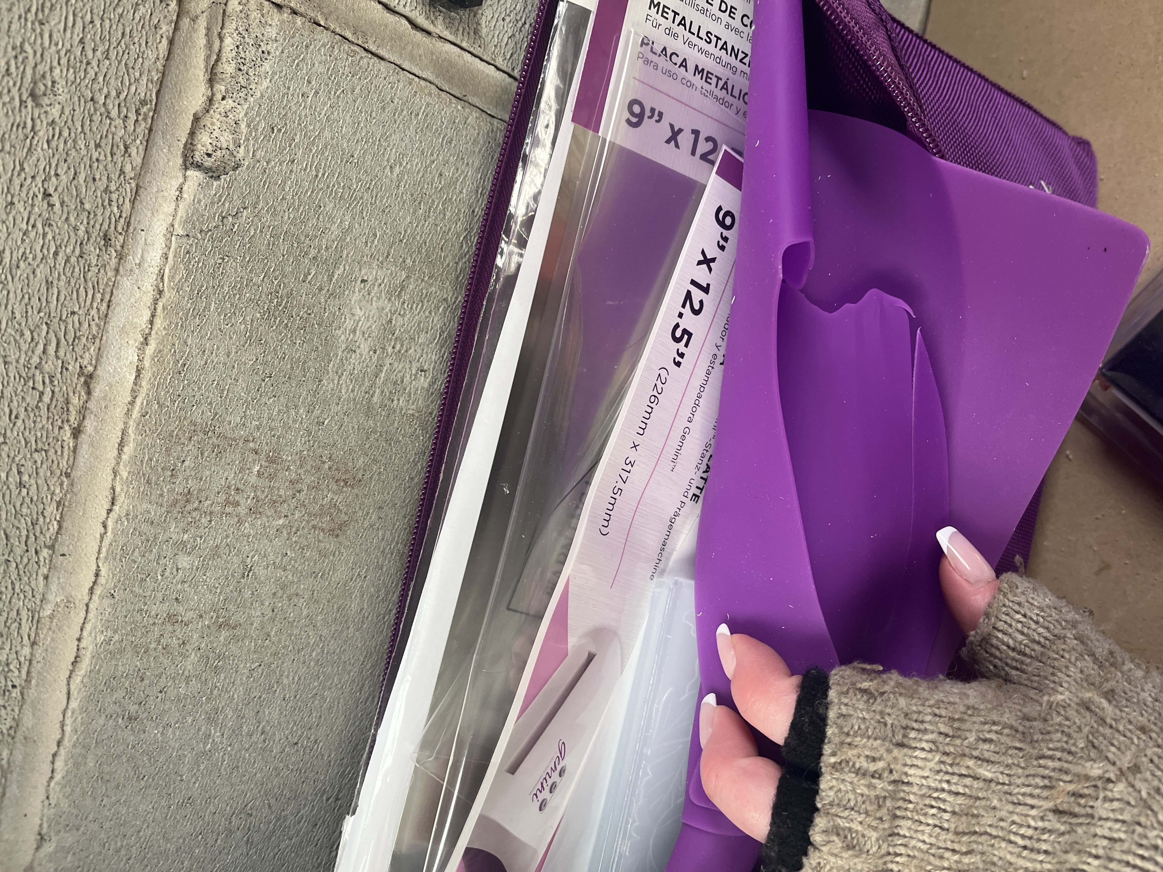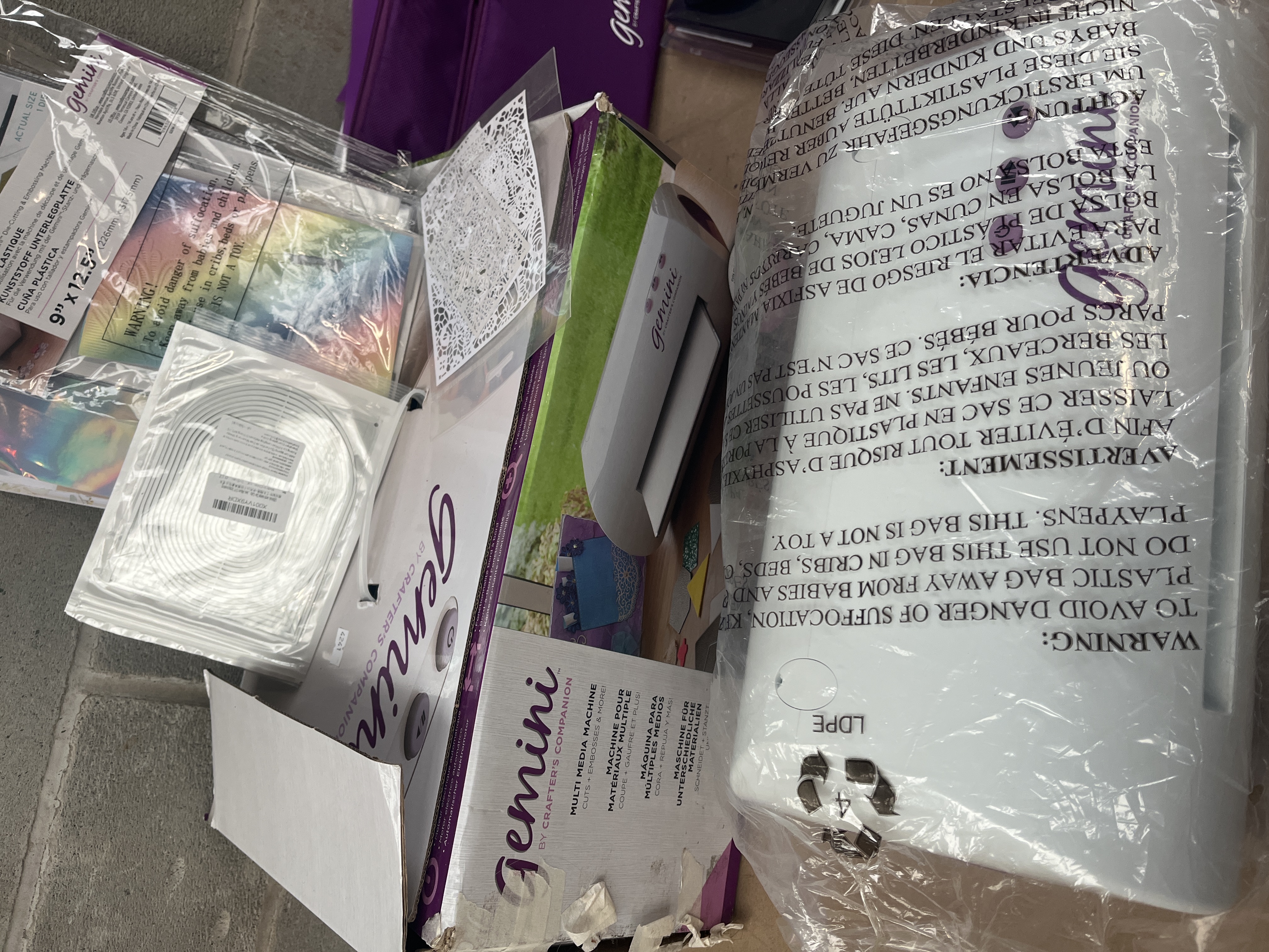 A collection of items centered around a Crafter’s Companion Gemini Junior Die Cutting and Embossing Machine. The machine, designed for multi-media crafting, is constructed of white plastic and remains sealed in its original protective plastic bag. The lot includes the main unit, power cords and adapters, and a large purple nylon zippered carrying case branded ‘Gemini’. Accessories include a large purple rubber cutting mat/plate, multiple packs of clear plastic cutting plates (marked 9″ x 12.5″), packaged holographic/foil sheets, and packaged coils of white crafting material or tape. The machine is housed within its original cardboard box labeled ‘Multi Media Machine’ and ‘CUTS + MORE’.