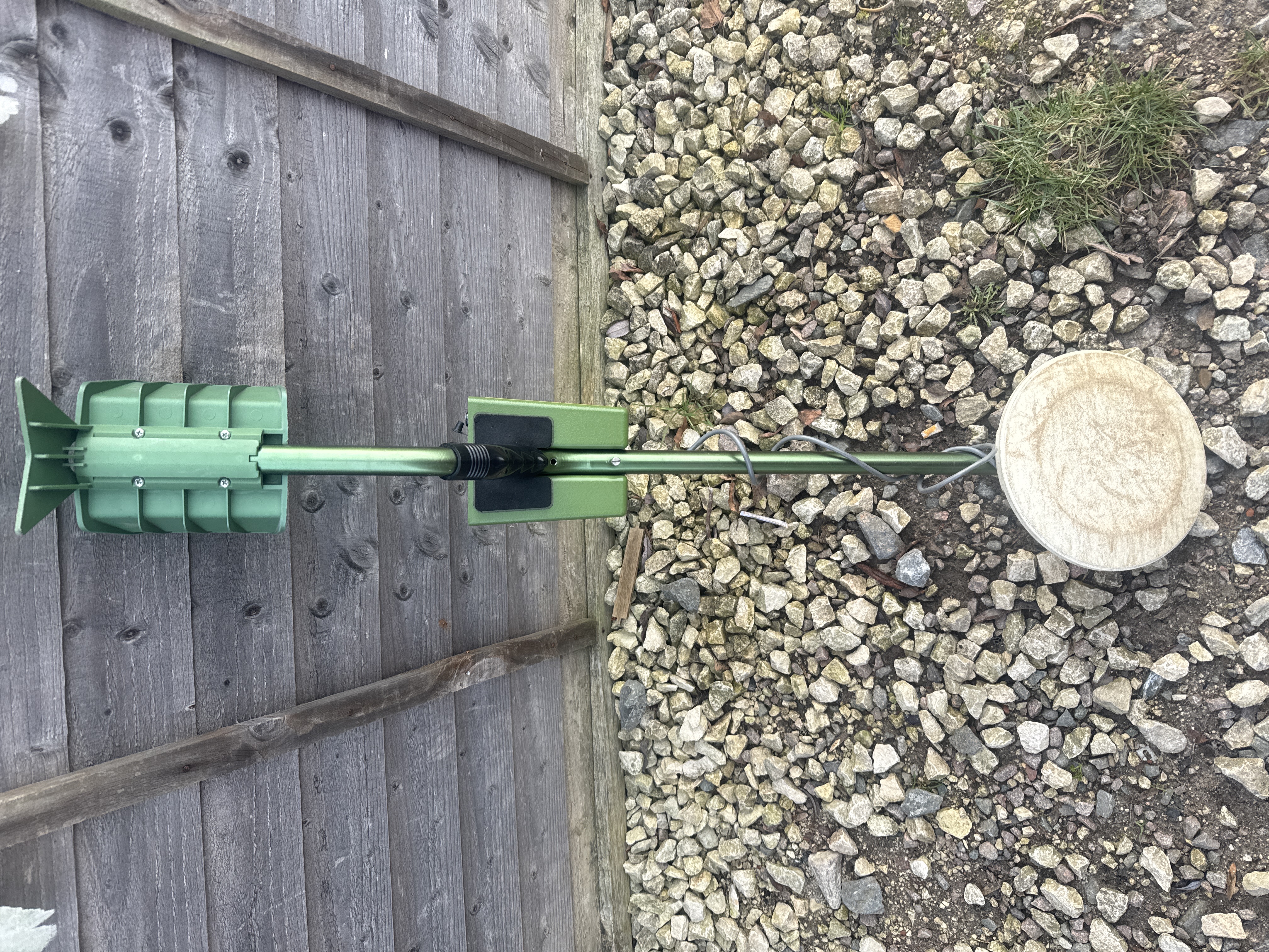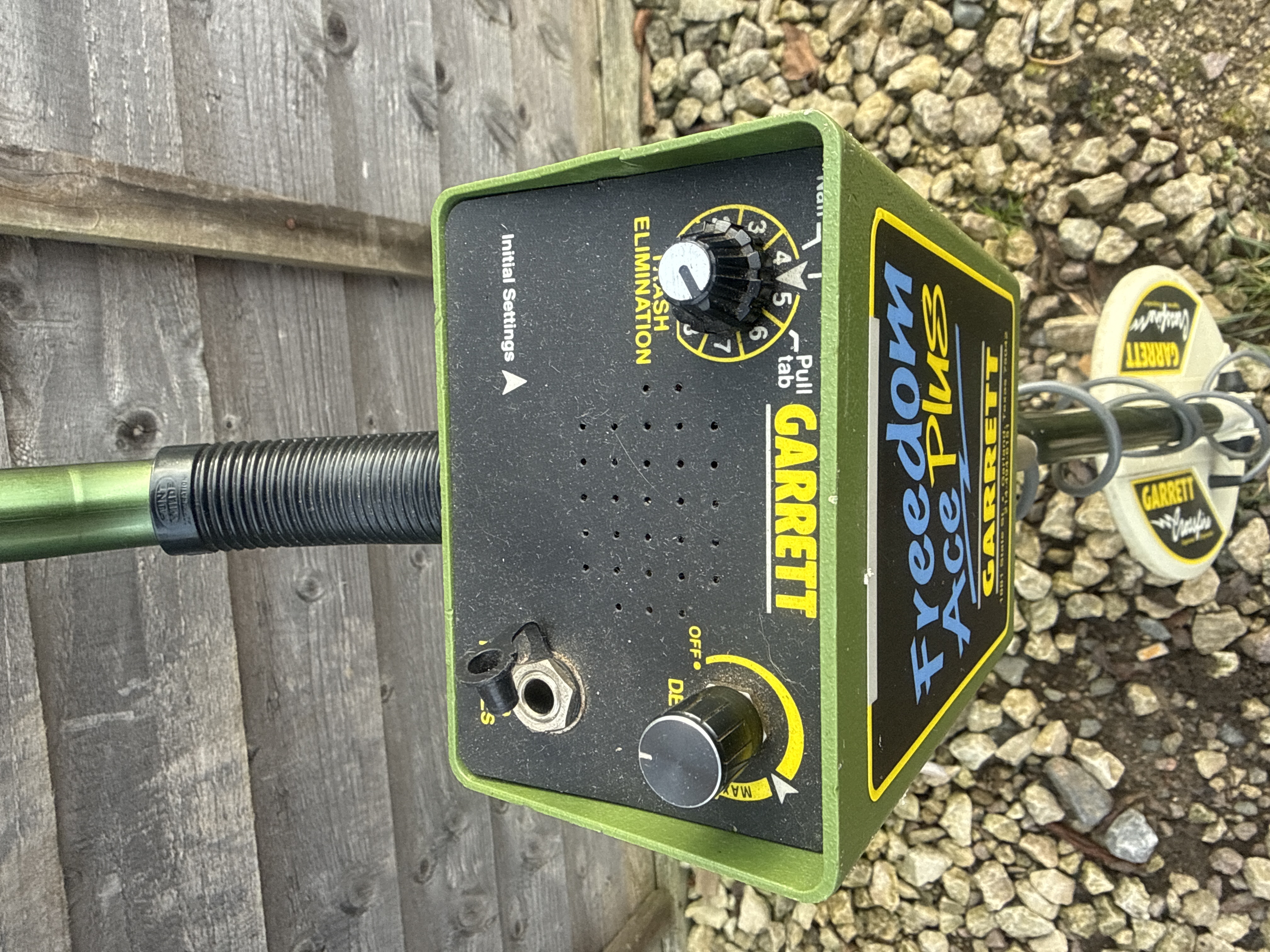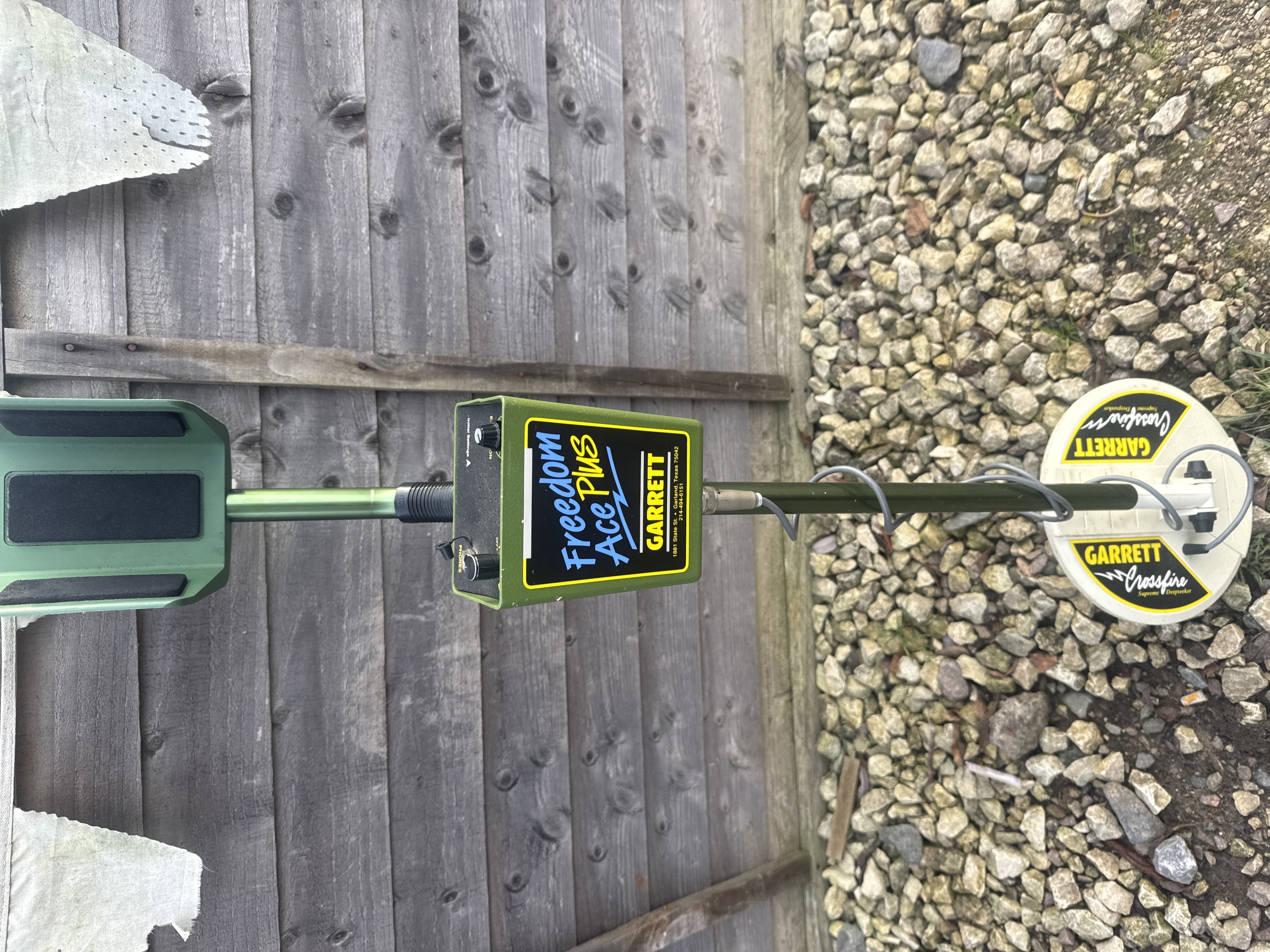 One complete hobbyist metal detector, identified as the Garrett Freedom Ace Plus model. The device is constructed primarily of olive green plastic and metal components, featuring an adjustable telescopic shaft and a green molded arm cuff. The control box is olive green with a black faceplate, prominently displaying the model name “Freedom Ace Plus” in stylized blue and yellow text, along with the manufacturer “GARRETT.” Additional printed text provides a partial address indicating the manufacturer is based in Garland, Texas 75042. The control panel includes various black control dials and jacks labeled for functions such as “Initial Settings” and “Elimination.” The detector is fitted with a round white search coil labeled “GARRETT Deepseeker.”