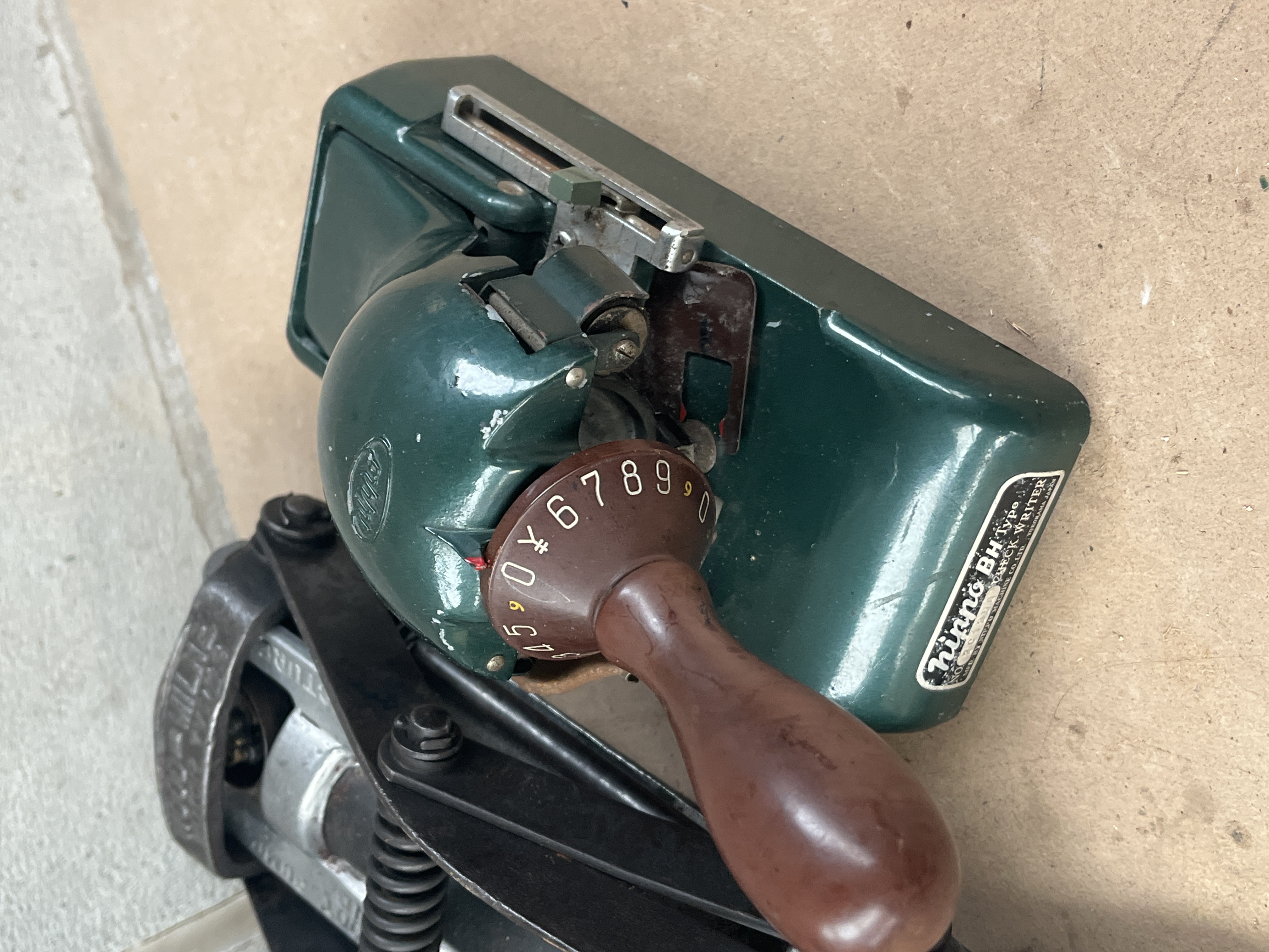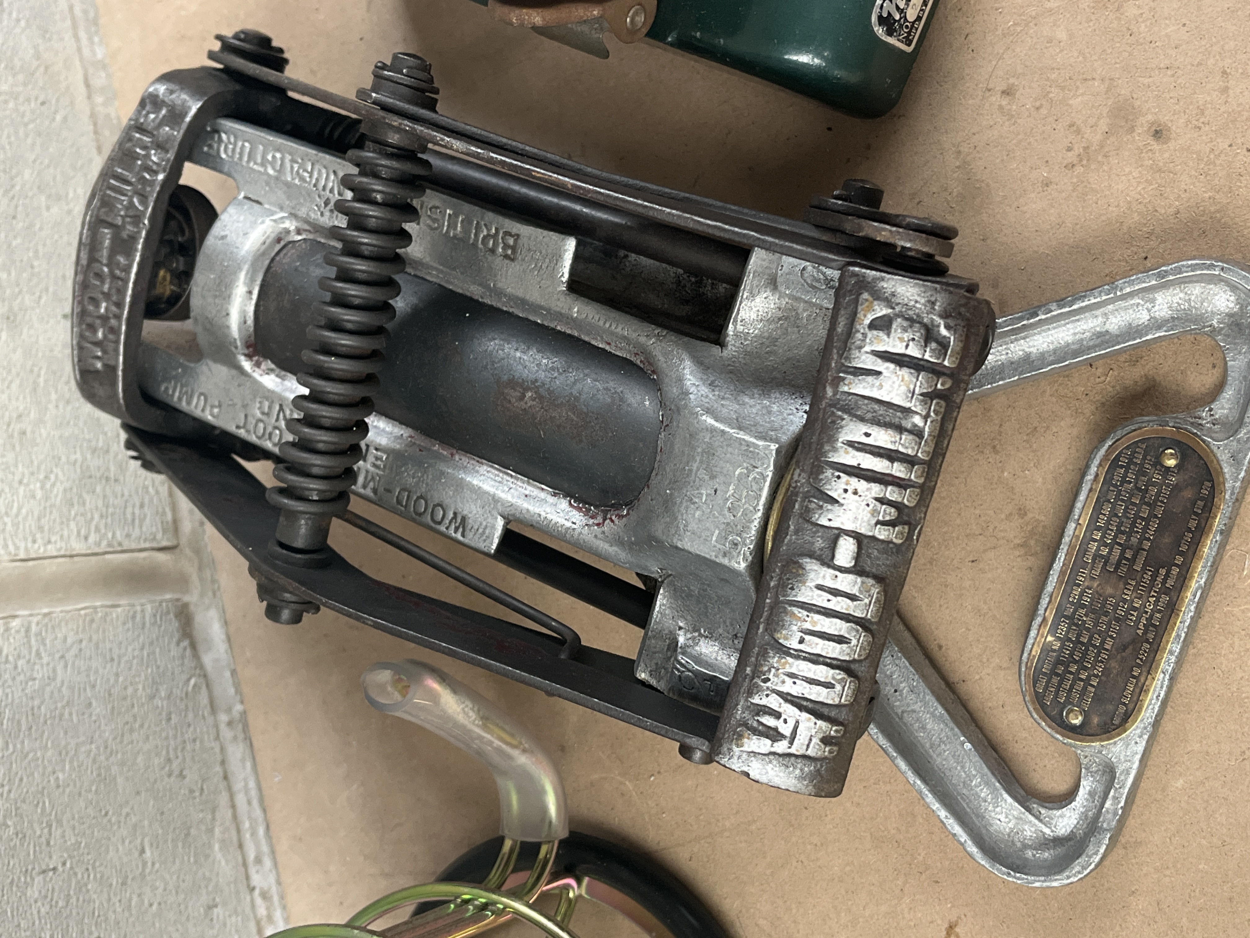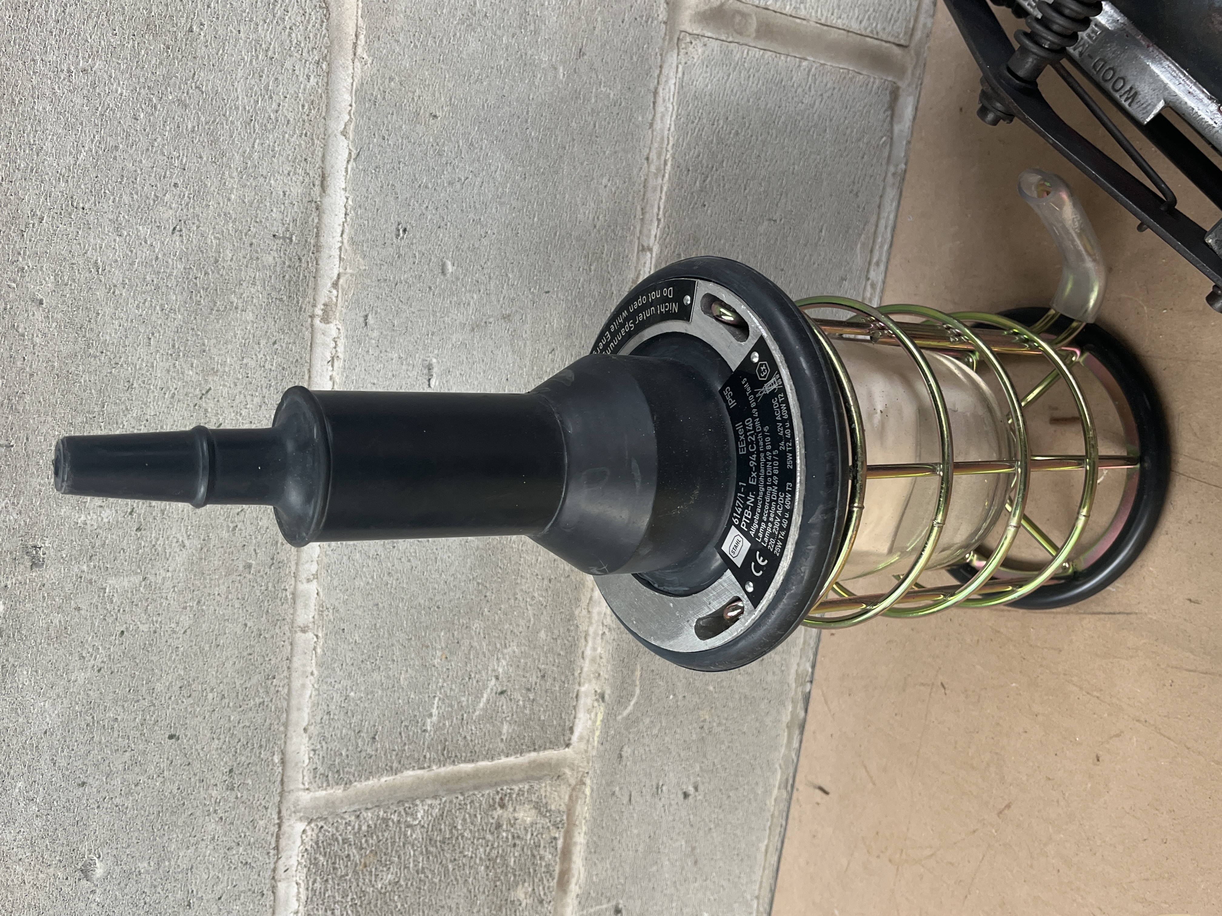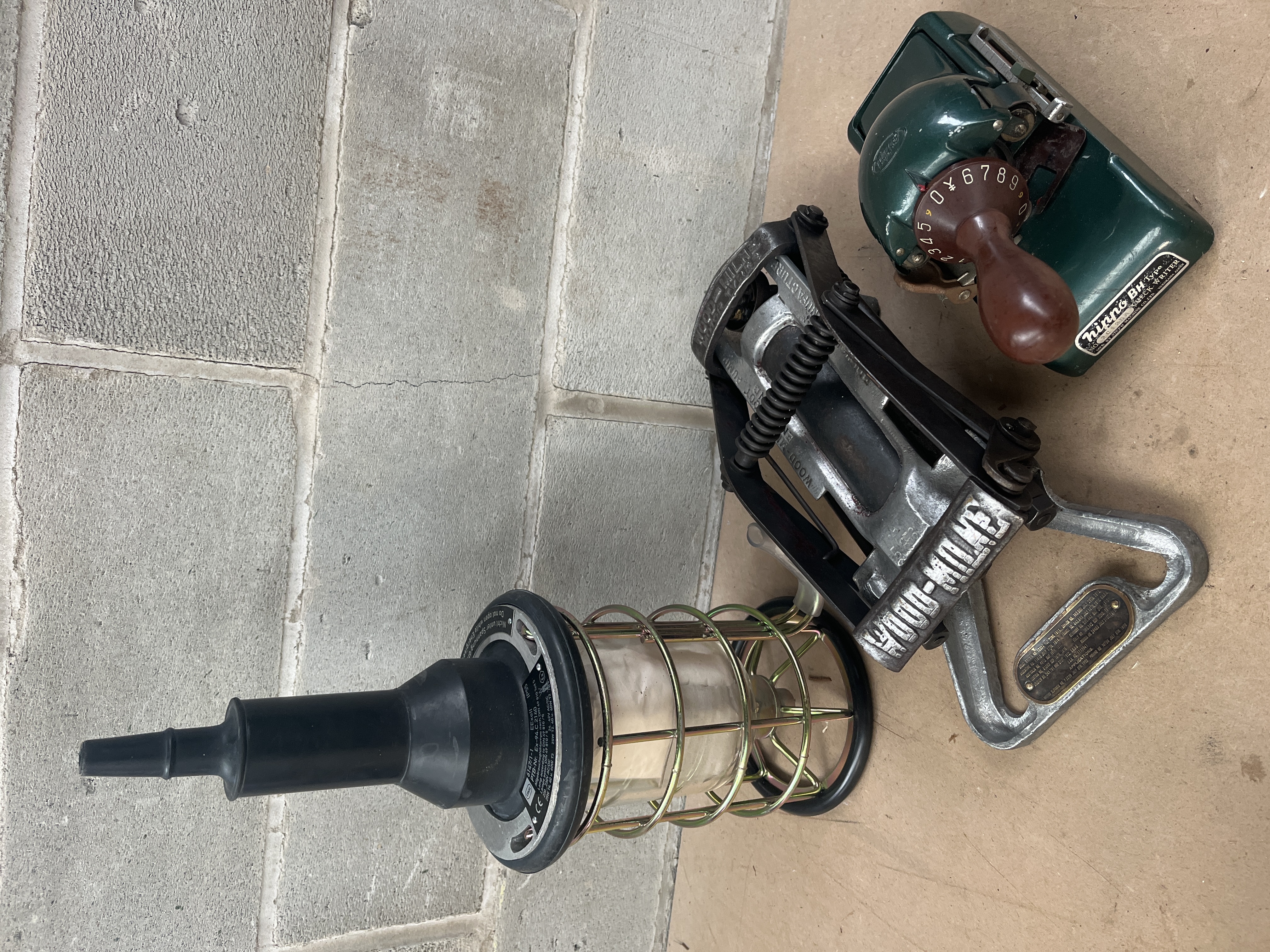 This lot comprises three distinct utility and industrial items. The first is a modern industrial work light featuring a black rubberized upper housing, a clear glass lens, and a yellow-green protective wire cage. Visible regulatory marks include CE, IP55, and PTB-No. Ex-9A.C.3140. The second item is an early 20th-century foot-operated mechanical device, likely a pump, constructed of cast aluminum alloy and steel. It is clearly marked “WOOD-MILNE” and “BRITISH MANUFACTURE.” A plaque on the base lists patent dates from 1917 and 1928. The third item is a small, dark green enameled metal desk machine identified by a label as a “NiNNO BH Type QUICK SETTER.” This machine features a brown rotary handle and a dial displaying numerals (0-9) and the Japanese Yen symbol (¥).