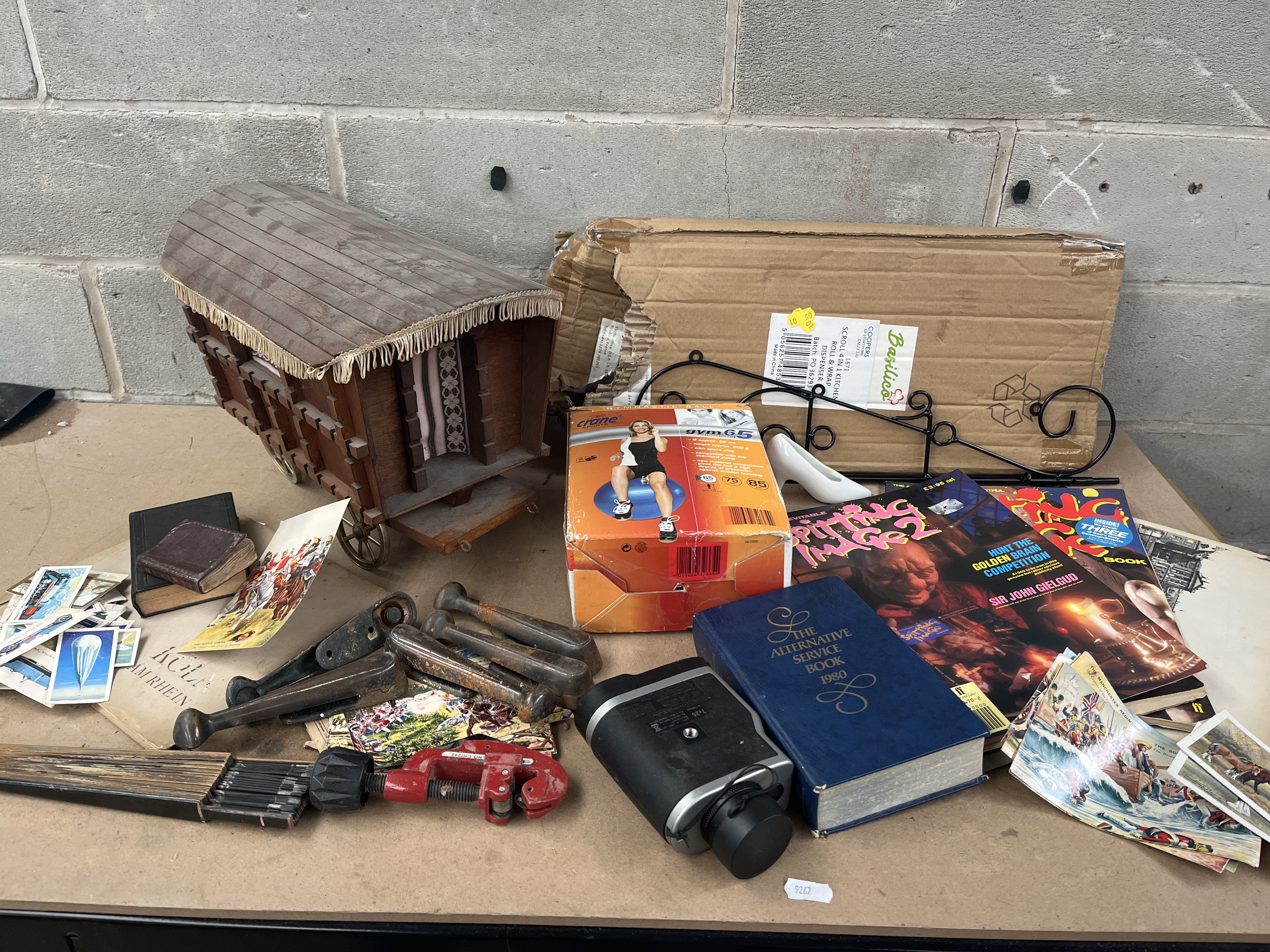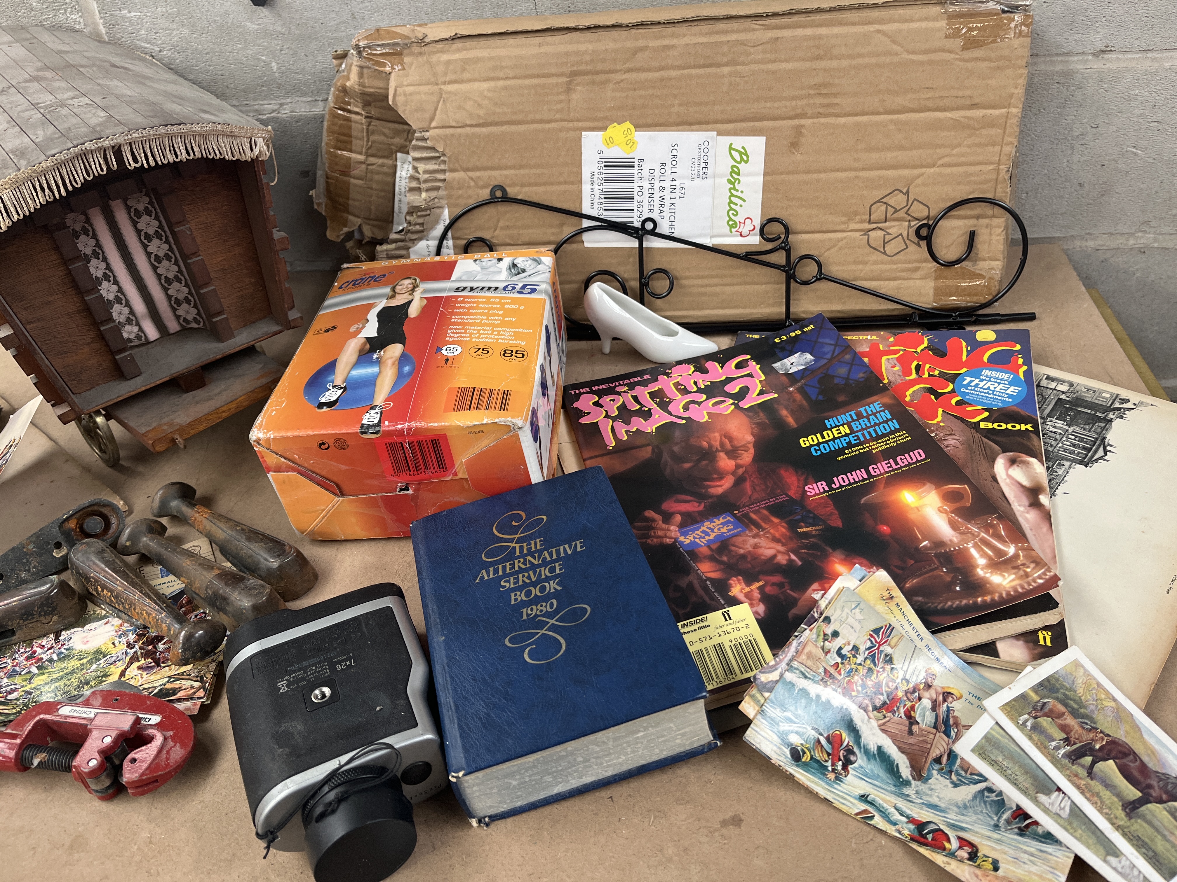 The lot contains four heavy cylindrical metal weights, exhibiting surface rust and wear, and a red-handled pipe cutter. Literature includes a dark blue hardback book titled “The Alternative Service Book 1980,” a smaller black hardback book, and three magazines including *The Spitting Image 2*. Ephemera includes a quantity of loose postcards and small cards, and a sheet of paper marked “KÖLN AM RHEIN” (Cologne on the Rhine).