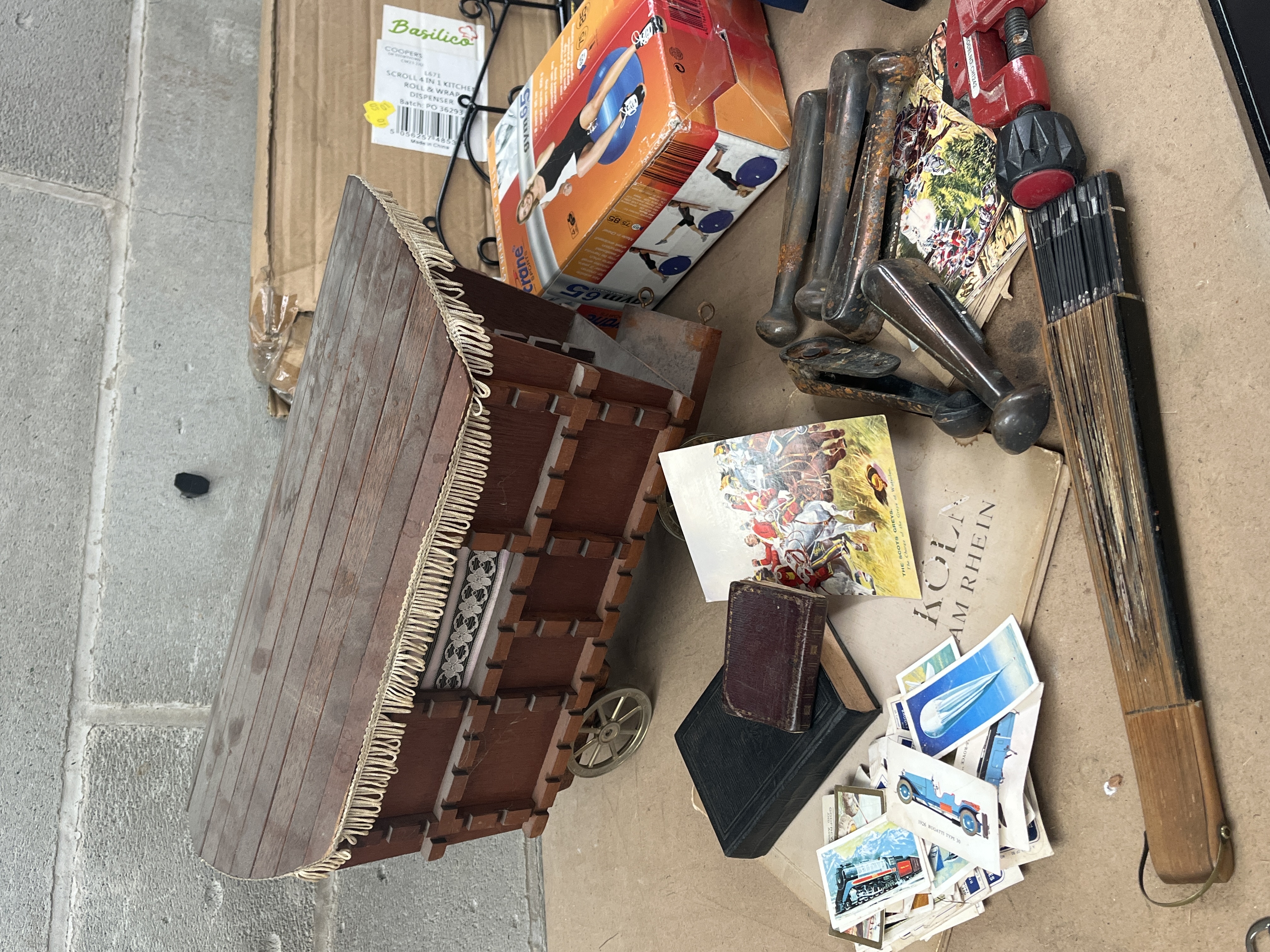 Other items include a partially damaged cardboard shipping box, an orange and white retail box for a “CRANE GYM 65” item, a black wrought iron scrollwork stand, a white ceramic high-heeled shoe decoration, a small brown leather wallet, and a collapsible wooden object, possibly a fan or measuring stick.