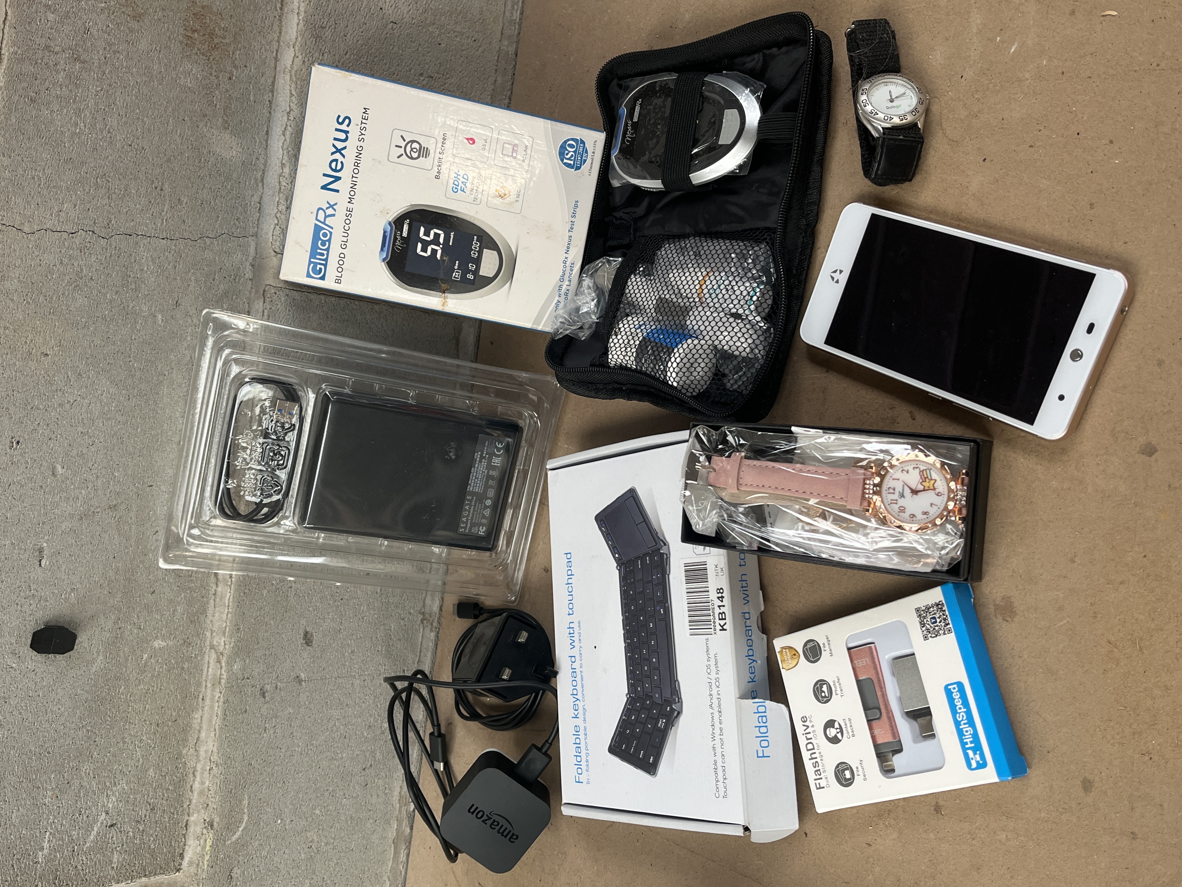 The collection comprises distinct items or sets of modern consumer electronics, personal accessories, and medical equipment. Key items include a Gluco/Rx Nexus Blood Glucose Monitoring System, packaged in its original box, accompanied by a black zipped carrying case containing the meter and associated supplies. Data storage devices include a boxed FlashDrive Dual Storage unit and a Seagate Portable Drive packaged in clear plastic casing. Charging and connectivity components include an Amazon branded wall adapter and a separate UK-style plug component. A boxed foldable keyboard with touchpad, labeled KB148, is included; this design is consistent with models such as the Nillkin or AUSDOM Foldable Bluetooth Keyboard designs identified through web research. Personal accessories include two wristwatches: one new in box with a pink strap and rose gold-toned casing labeled “Geneva,” and one loose analog watch with a black textile strap labeled “Qunqia.” The collection is completed by a loose white and rose gold-toned smartphone or similar touchscreen device.
