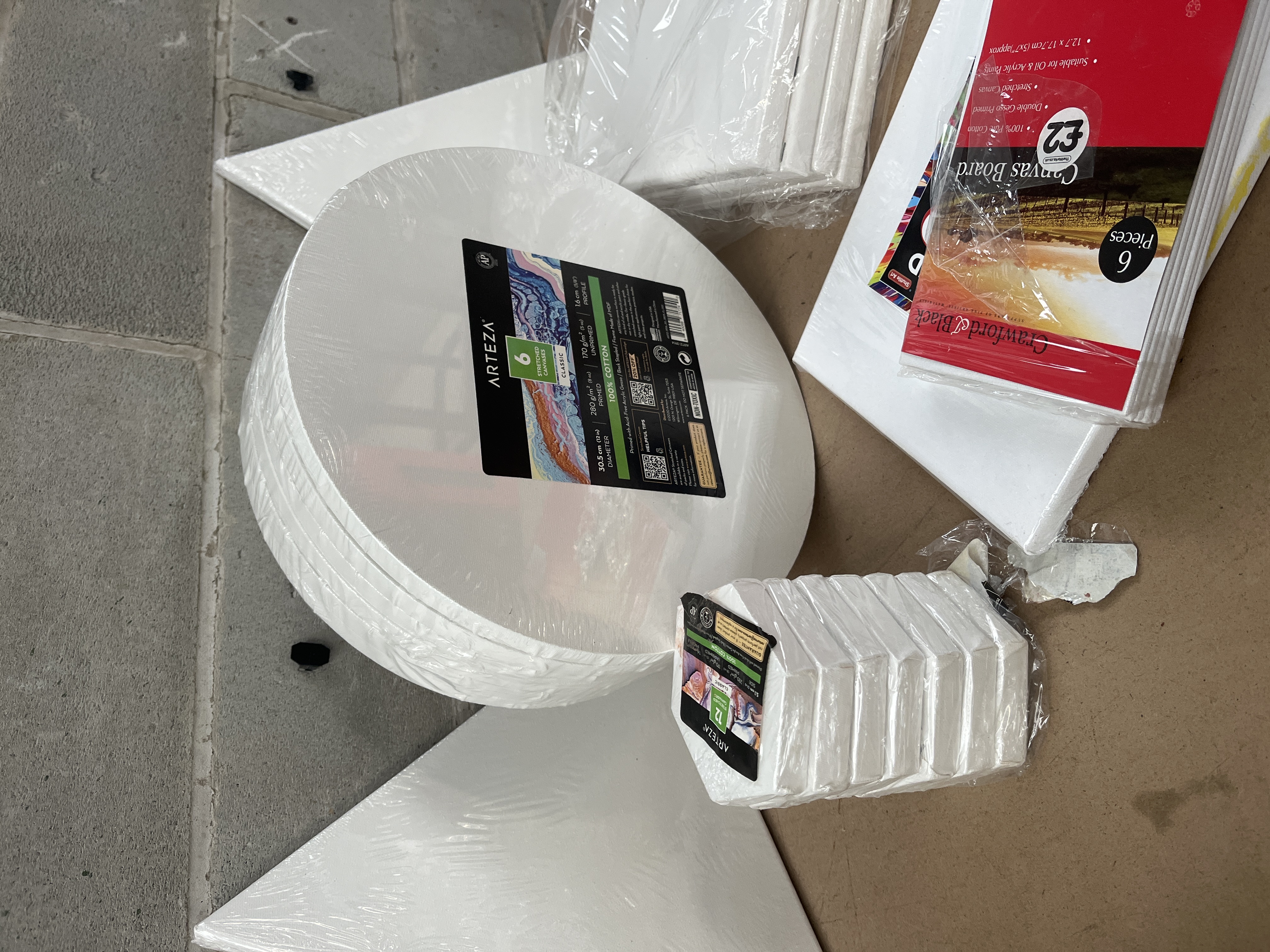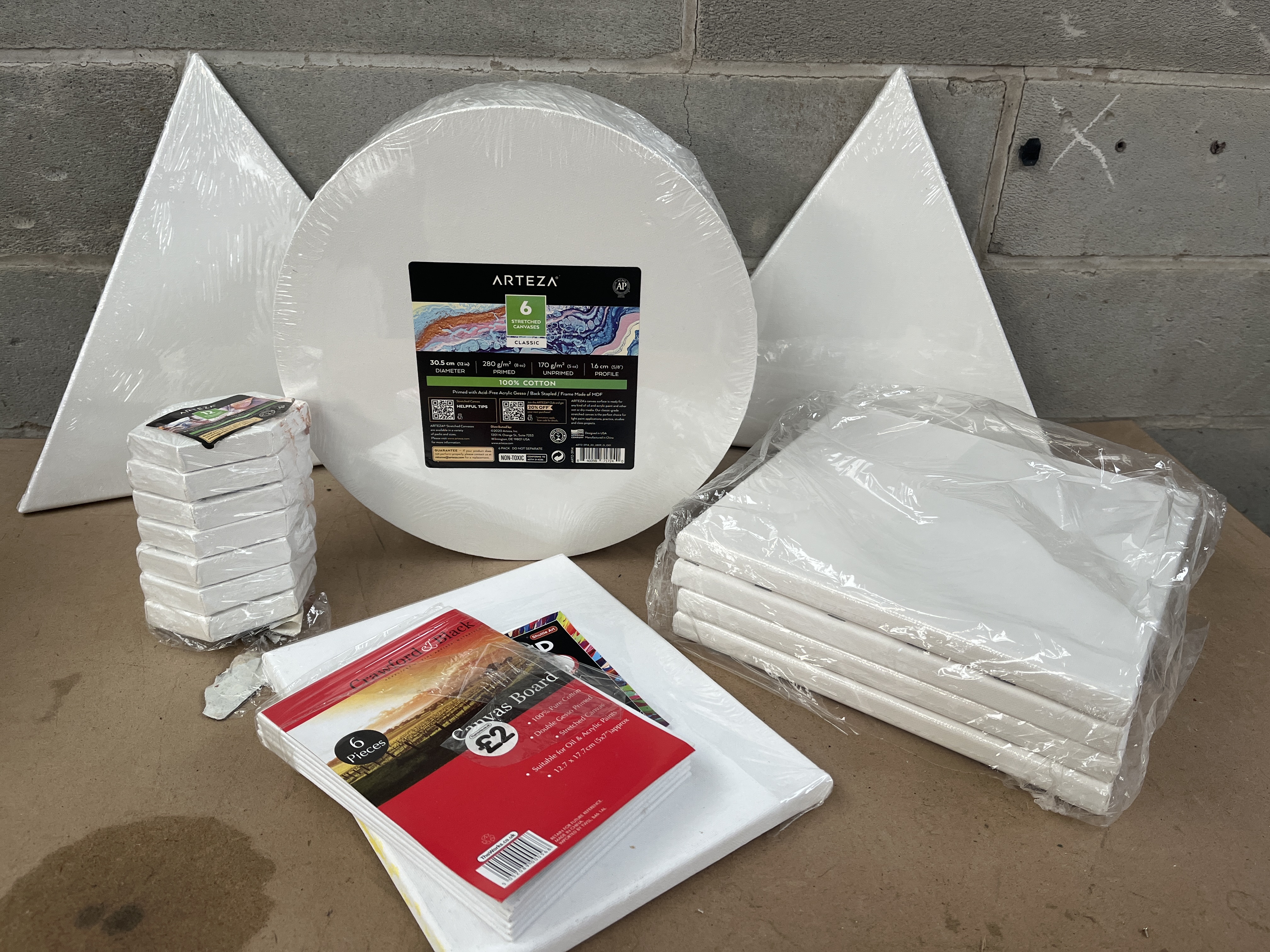A collection of new and unused art canvases and canvas boards, suitable for various painting media including acrylics and oils. The lot comprises a mix of pre-stretched canvases and flat canvas panels in various shapes and sizes, predominantly white and sealed in clear plastic packaging. Key components include a factory-sealed set of six ARTEZA circular canvases, labeled as 100% Cotton, and a stack of eight smaller hexagonal or octagonal mini-canvases, also branded ARTEZA. The collection further includes two large triangular pre-stretched canvases, five stacked rectangular stretched canvases, and several flat canvas boards. The boards include one retail package labeled “Canvas Board” specifying six pieces, resting atop two unwrapped boards. Web intelligence suggests comparable items are often associated with brands such as CONDA and Studio 71.