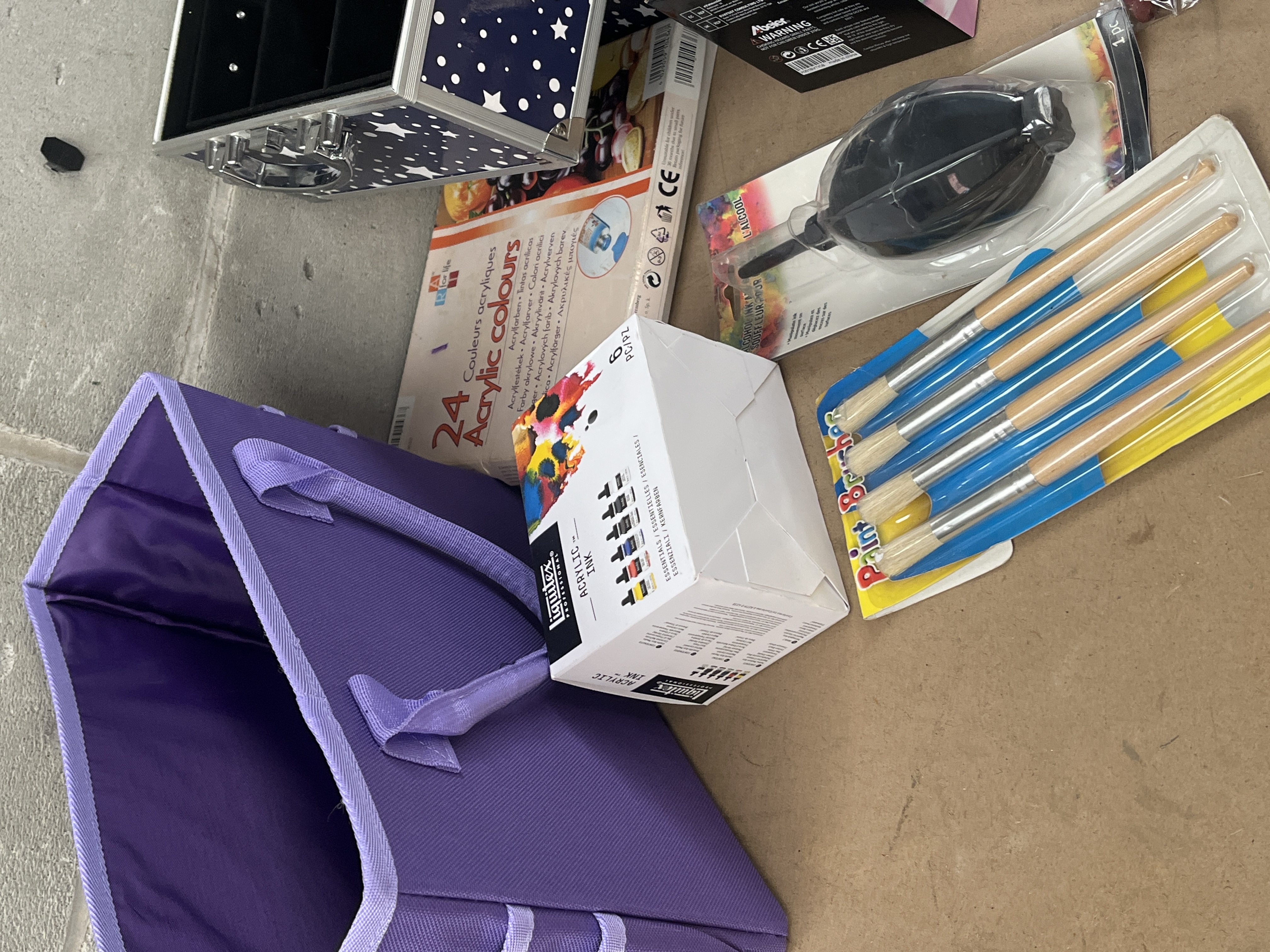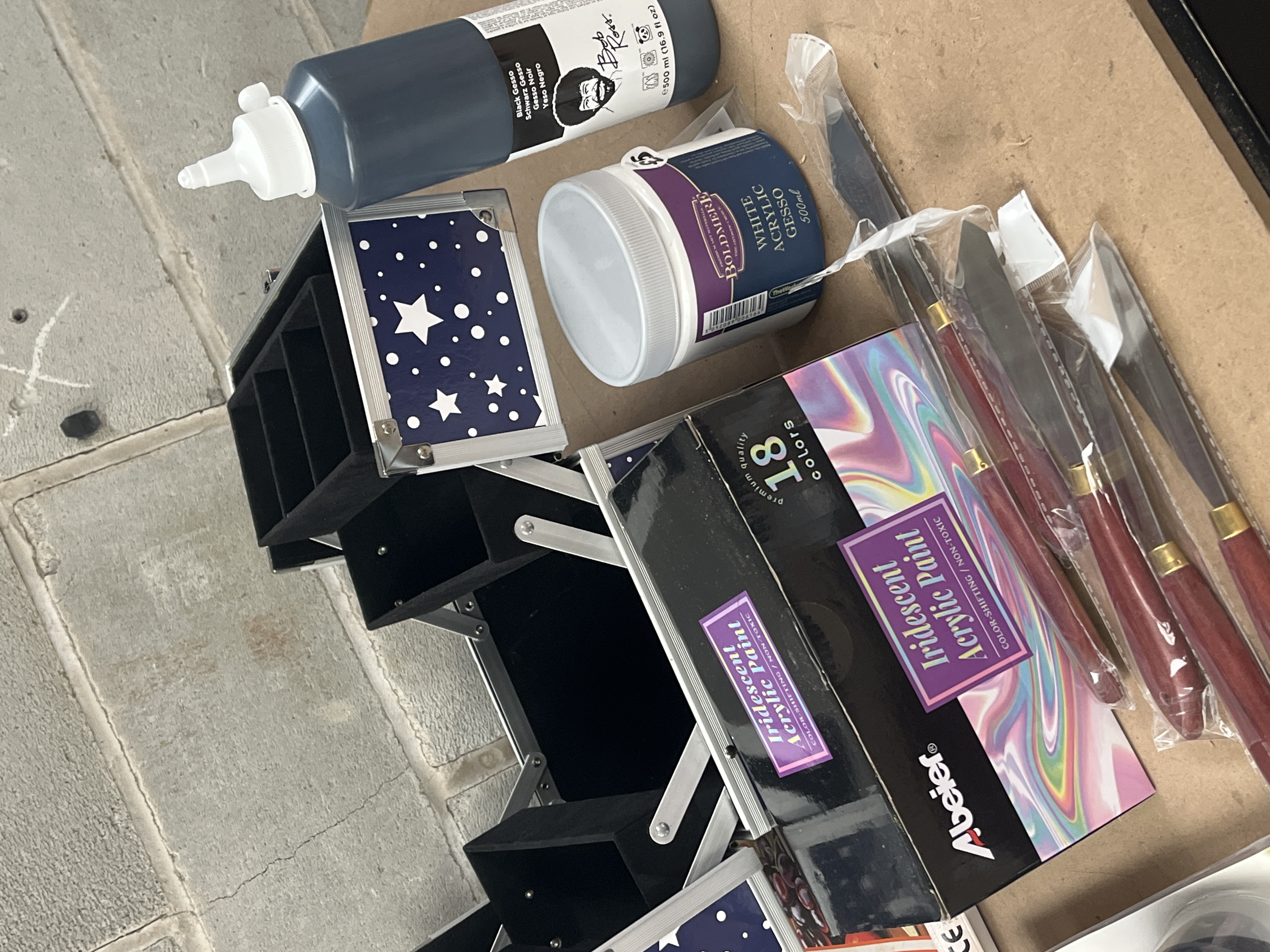 This lot comprises a collection of distinct art supply and storage items, primarily appearing as new stock. The centerpiece is a boxed set of ABEIER Iridescent Acrylic Paint, identified by web consensus as an 18-color chameleon set. The collection of painting media also includes a box of Liquitex Acrylic Ink Essentials, a box labeled “24 Acrylic colours,” a 500ml container of Boldmeer White Acrylic Gesso, and a 500ml bottle of Bob Ross Black Gesso. Storage items consist of one collapsible purple fabric tote bag and one open aluminum/composite vanity-style case featuring a navy blue and white star pattern. Tools and accessories include a packaged set of four paintbrushes, a packaged black rubber air blower/dust cleaner, and seven individual palette/painting knives. Six of the knives feature dark handles and are individually packaged; one smaller silver knife is unpackaged.