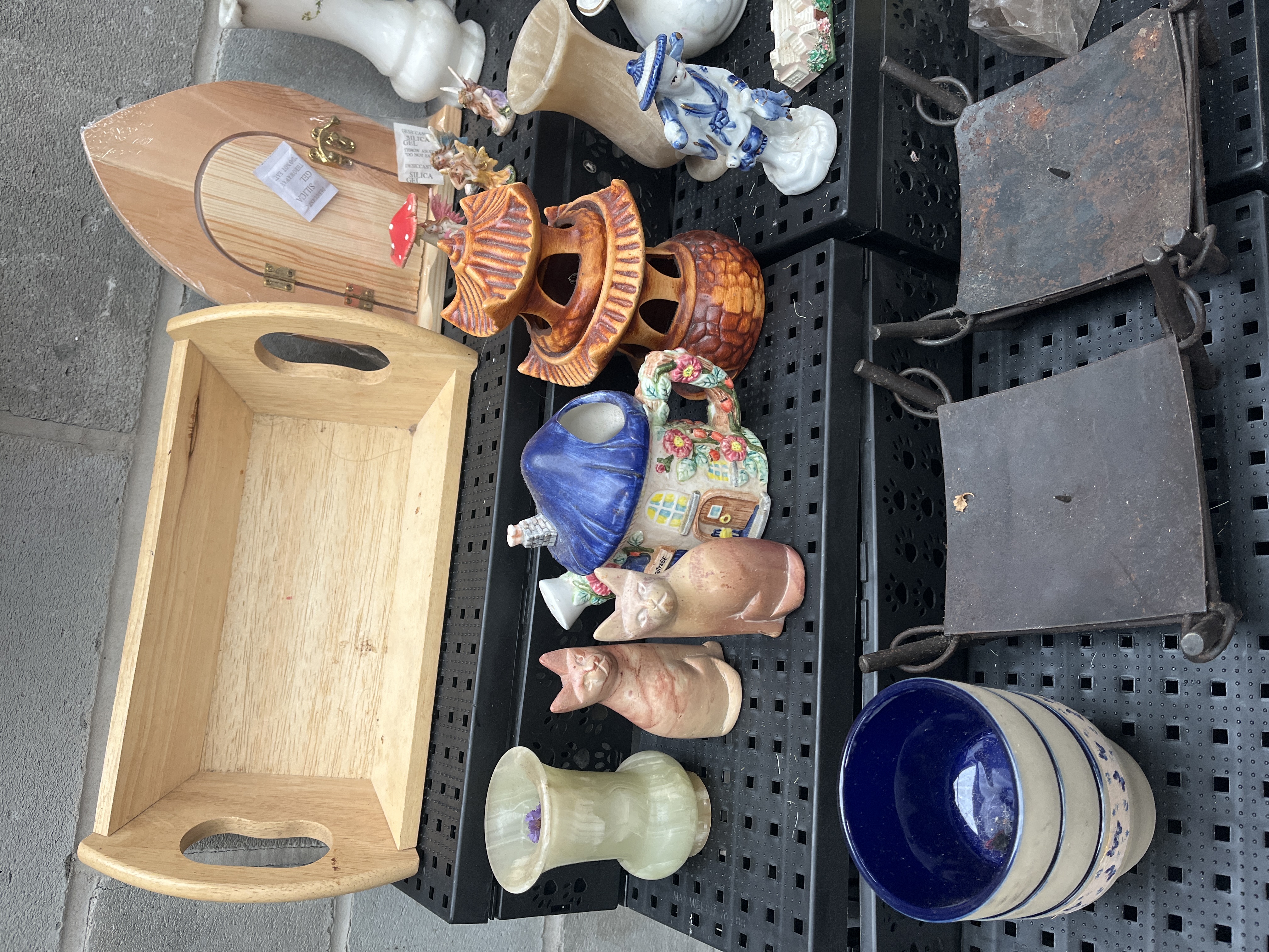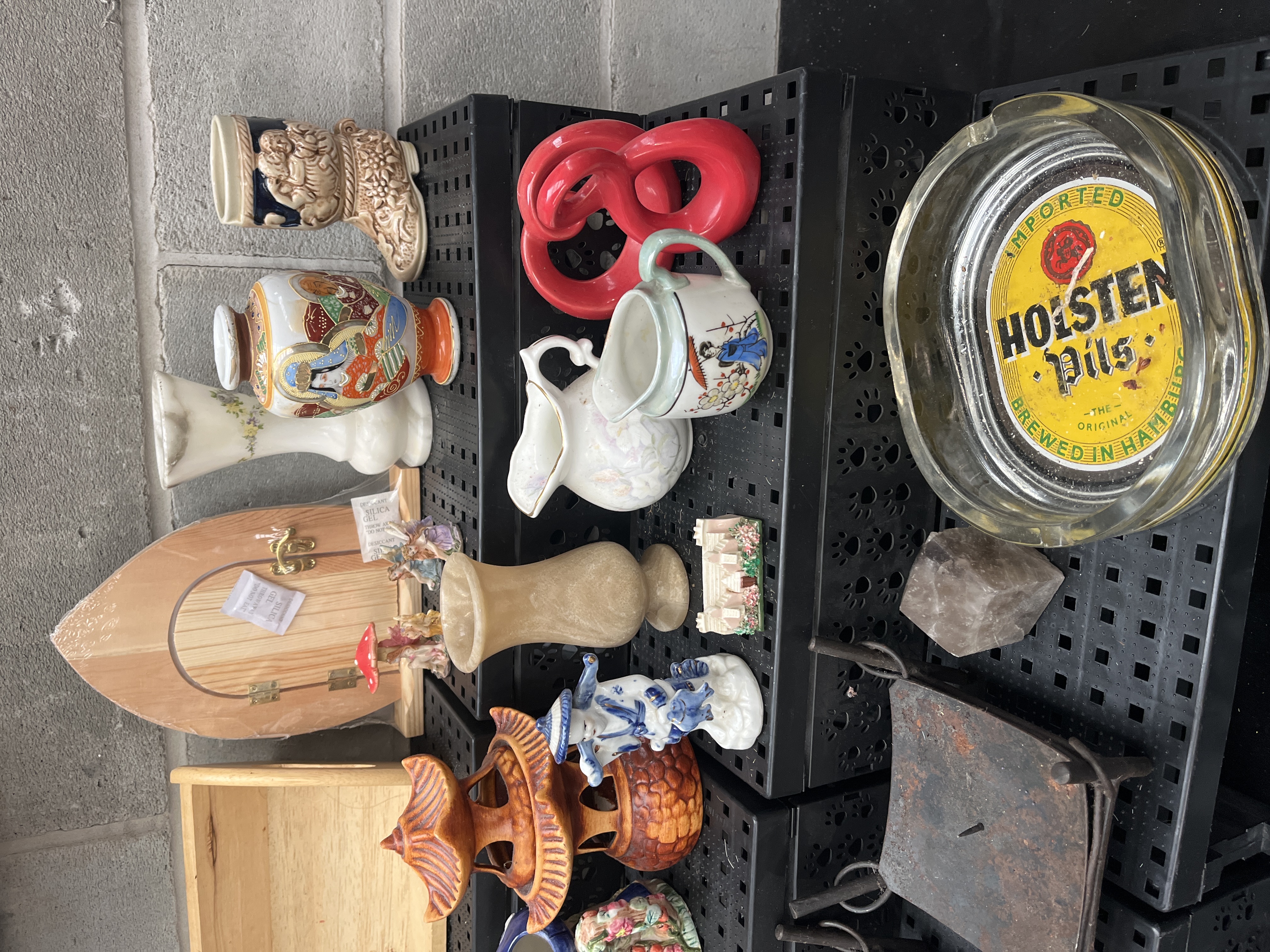 A collection of miscellaneous decorative and functional objects composed primarily of ceramics, glass, wood, and cast iron. The assortment includes various ceramic and porcelain vases, pitchers, and novelty items, such as a tall white fluted vase, a colorful Orientalist-style painted vase, a tan novelty boot-shaped stein, two pink ceramic cat figurines, a ceramic pagoda-style censer, and a blue and white ceramic figurine of a man. Other ceramic items include a house-shaped vessel, a red abstract looping sculpture, and a blue and white bowl. The collection also features a light wood rectangular carrying tray, a wood novelty door/plaque, a smoky quartz crystal specimen, and two square cast iron trivets/stands. Completing the lot is a clear glass ashtray containing a circular yellow paper advertisement marked HOLSTEN Pils, BREWED & BOTTLED IN HAMBURG.