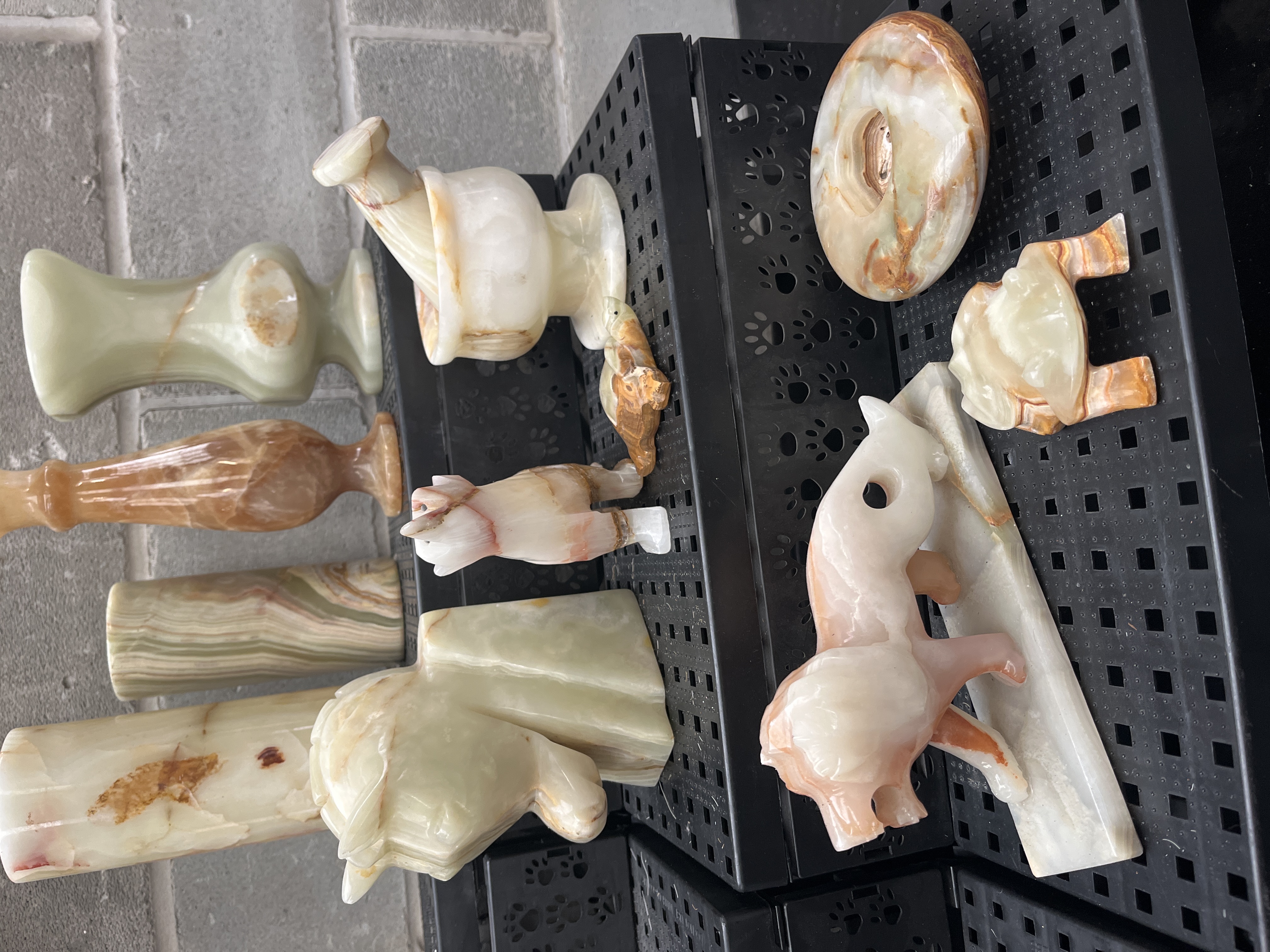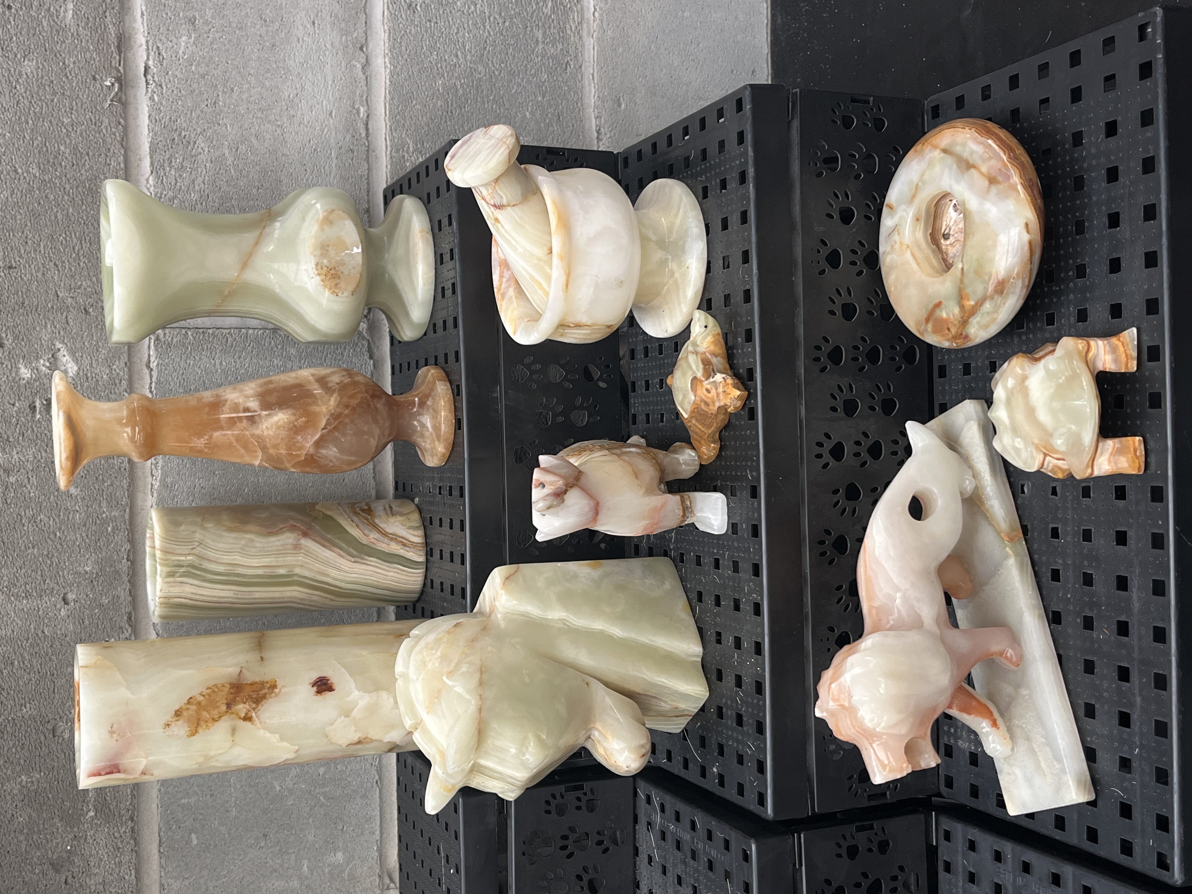 A collection of twelve decorative objects carved from banded calcareous stone, commonly identified in the market as Mexican onyx or alabaster. The pieces exhibit natural striations and veining in tones of creamy white, celadon green, rusty brown, and amber. The collection comprises four vases of varying height and silhouette, including two cylindrical forms and two footed urn-shaped vases. The remaining eight pieces include figural and utilitarian items: a stylized animal bust, two small turtle figures, a standing dog or cub figure, a reclining lion figure mounted on a base, a round disc or plate with a central depression, and a complete mortar and pestle set (two pieces). All pieces are hand carved and exhibit a high polish.