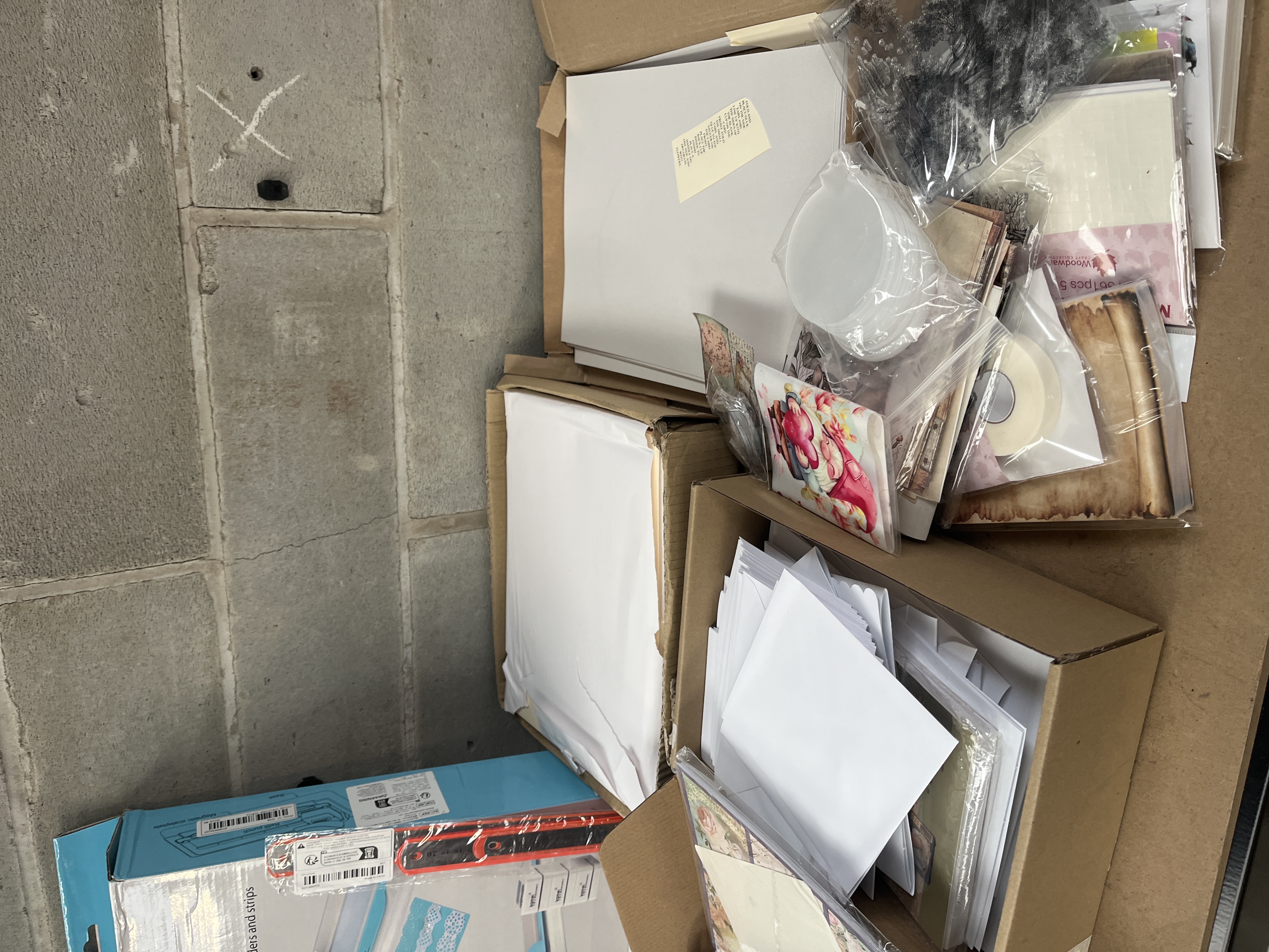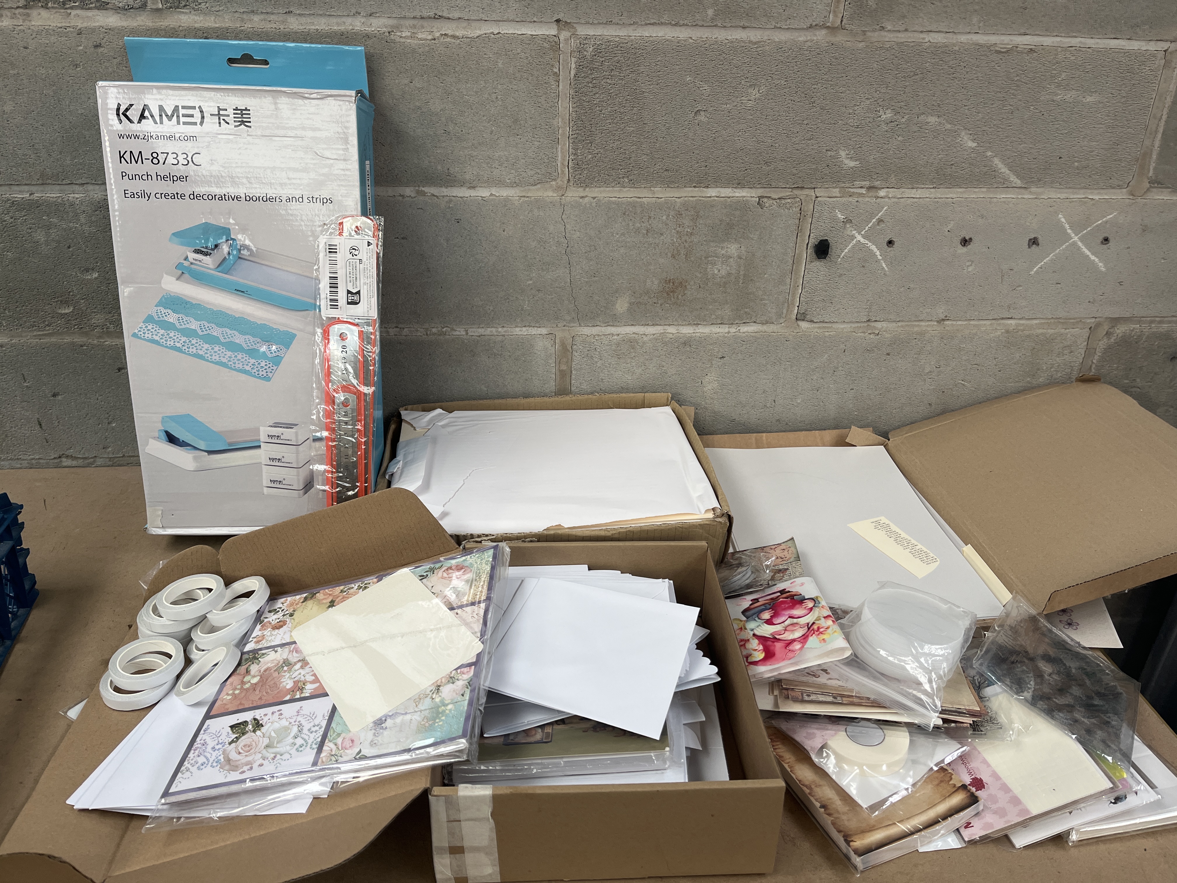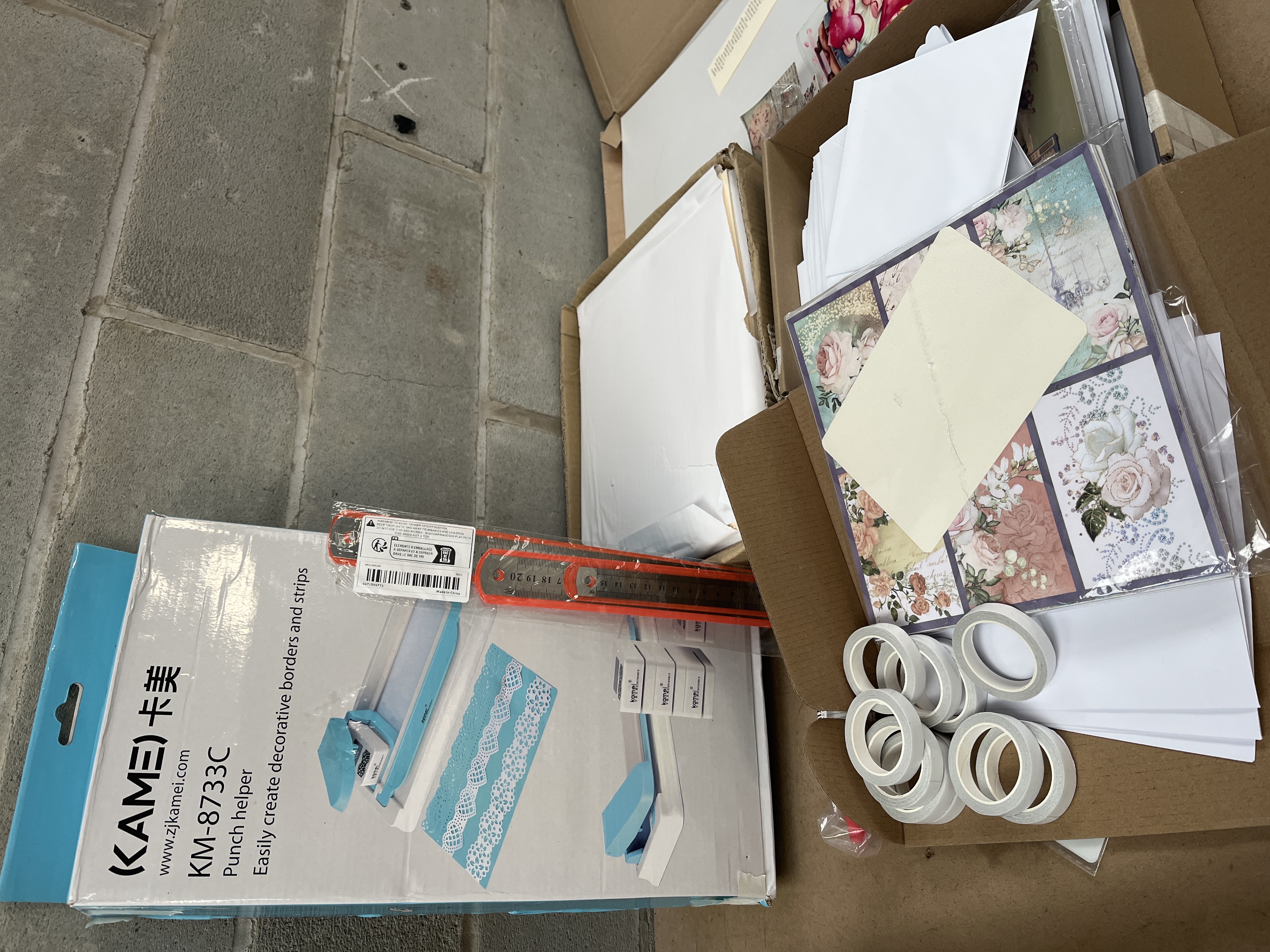 This lot comprises a large collection of contemporary paper crafting and scrapbooking materials, centered around one packaged KAMEI KM-8733C “Punch helper.” The punch helper is designed to easily create decorative borders and strips and is labeled with the Chinese characters “卡美.” Web intelligence confirms this is an interchangeable border punch system. The remaining supplies are stored loosely within three open cardboard containers. The contents include multiple stacks of white envelopes and cardstock sheets, assorted pads of floral and vintage-style patterned papers, and several clear packets containing small embellishments or materials, including aged-look paper and a dark, fluffy material. The collection also features approximately eight visible rolls of white adhesive tape and one packaged orange and metal ruler. The materials are suitable for DIY crafts, scrapbooking, and greeting card creation.