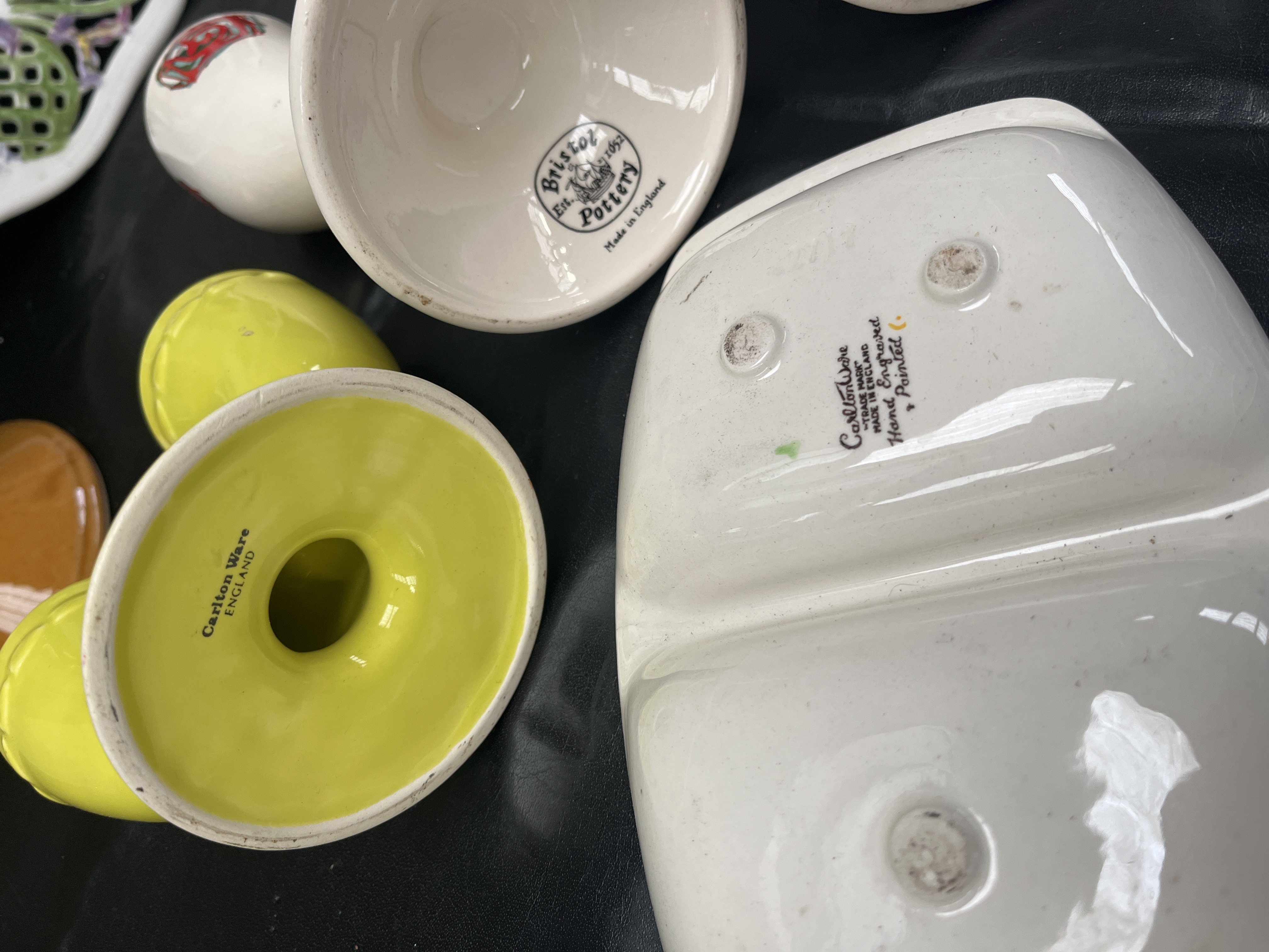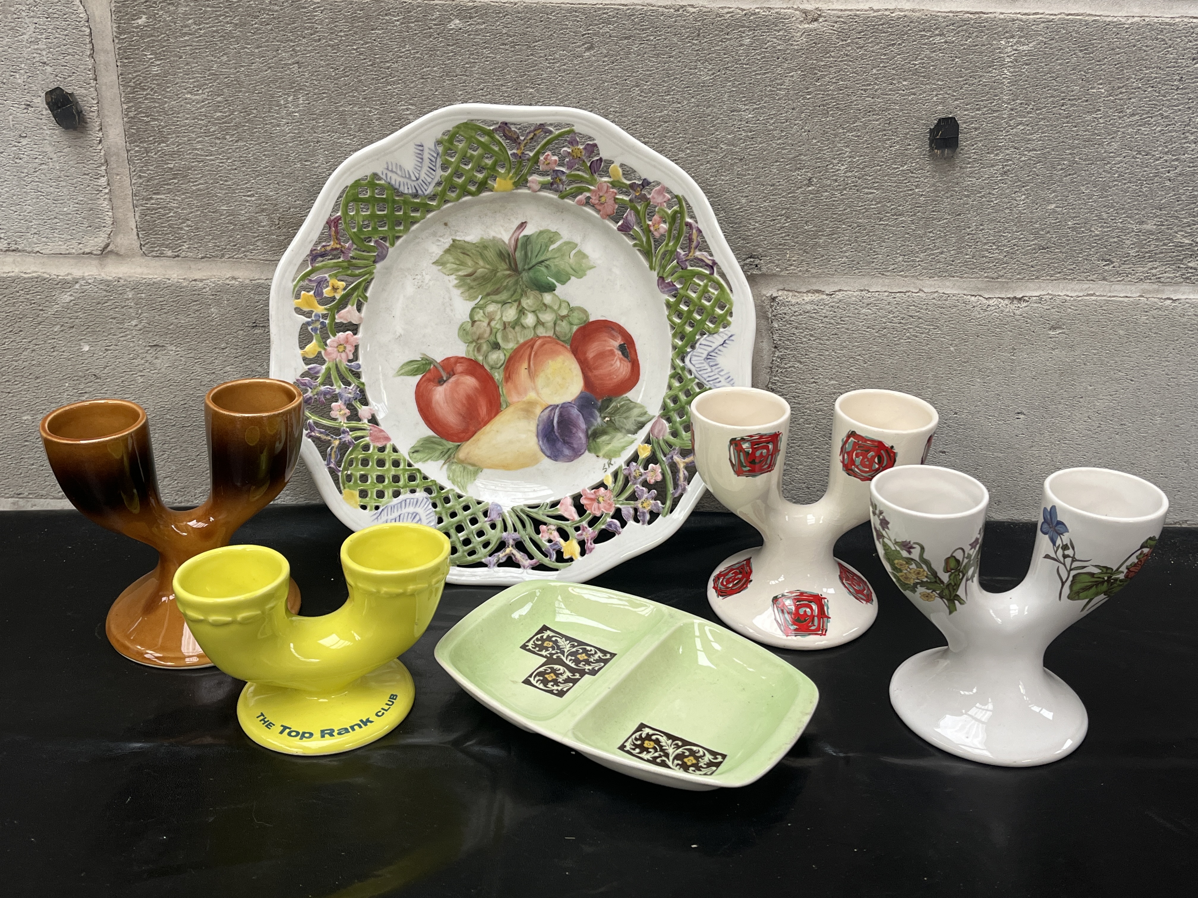 A collection of ceramic tableware, primarily dating from the Mid-Century period. The collection includes one large, scalloped earthenware plate, attributed to the style of Fitz & Floyd, featuring a reticulated border and a central hand-painted motif of various fruits (grapes, apples, peaches, plum), surrounded by colorful floral designs. The remaining six items consist of five ‘wishbone’ or U-tube shaped double egg cups and one rectangular two-compartment dish. The marked items include one bright lime-green glazed double egg cup stamped Carlton Ware ENGLAND on the base and bearing the decal The Top Rank Club. The light mint-green divided dish is stamped Carlton Ware TRADE MARK Made in ENGLAND Hand Engraved & Hand Painted on the reverse, featuring abstract black and gold detailing within the wells. One white glazed double egg cup decorated with painted floral sprigs bears a Bristol Pottery Made in England mark on the base. The lot is completed by two plain brown glazed double egg cups and one white glazed double egg cup with a red geometric pattern.