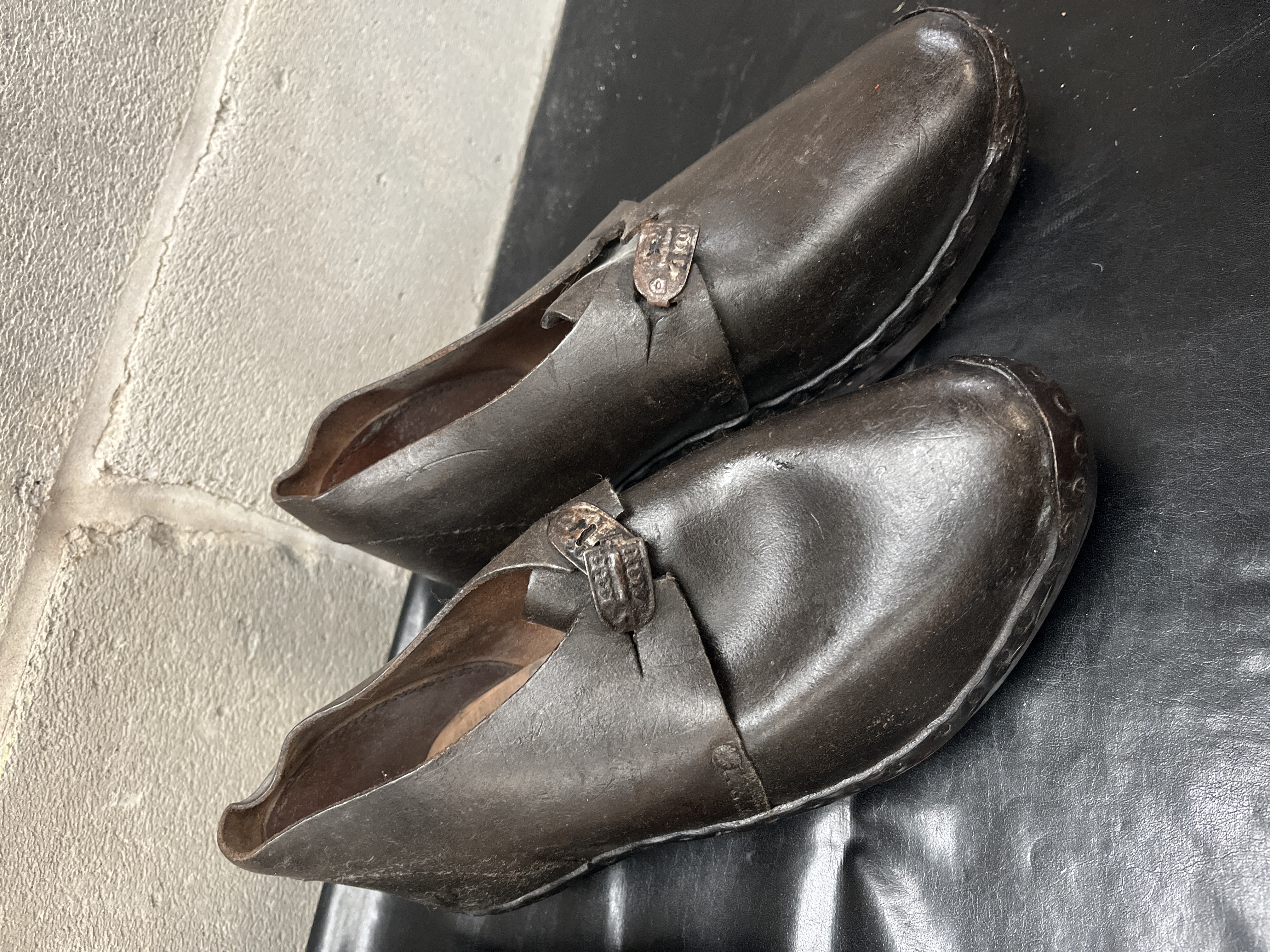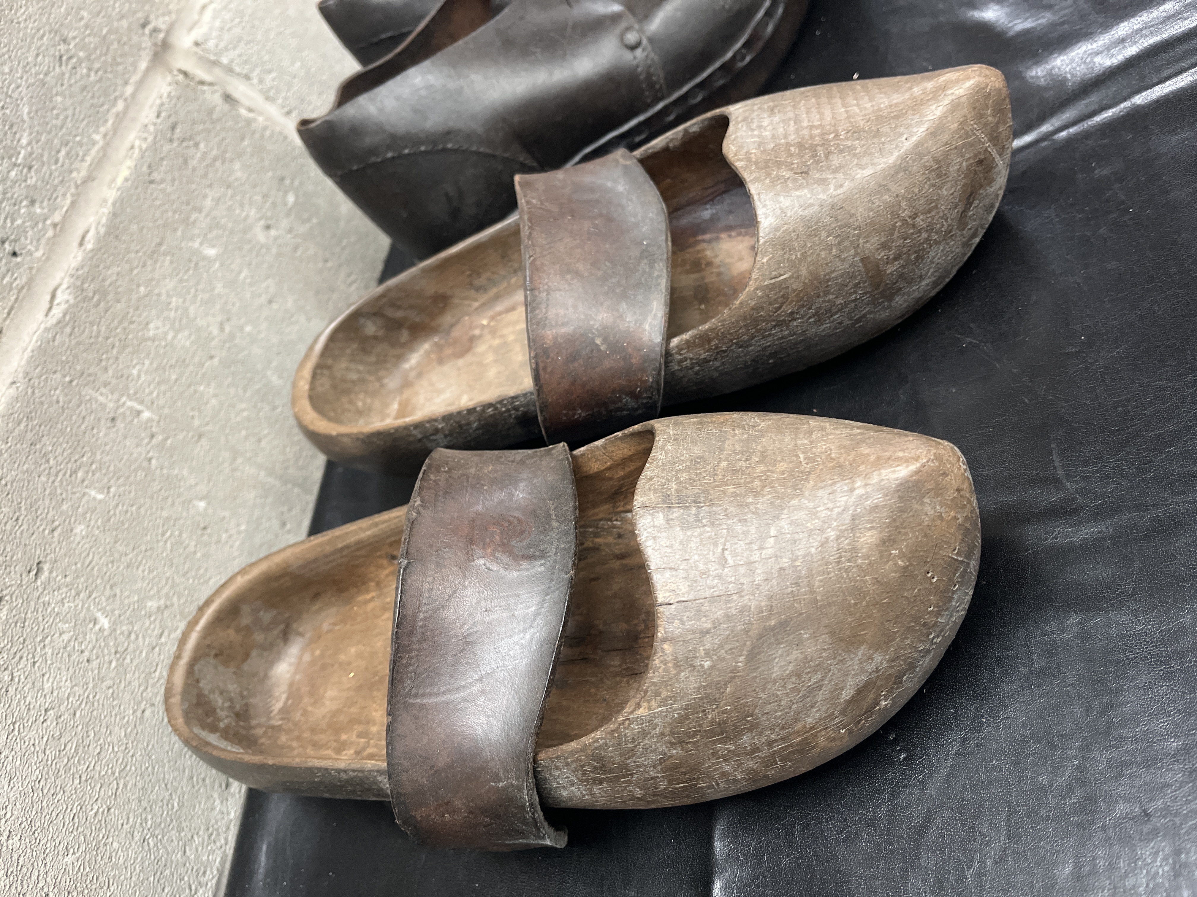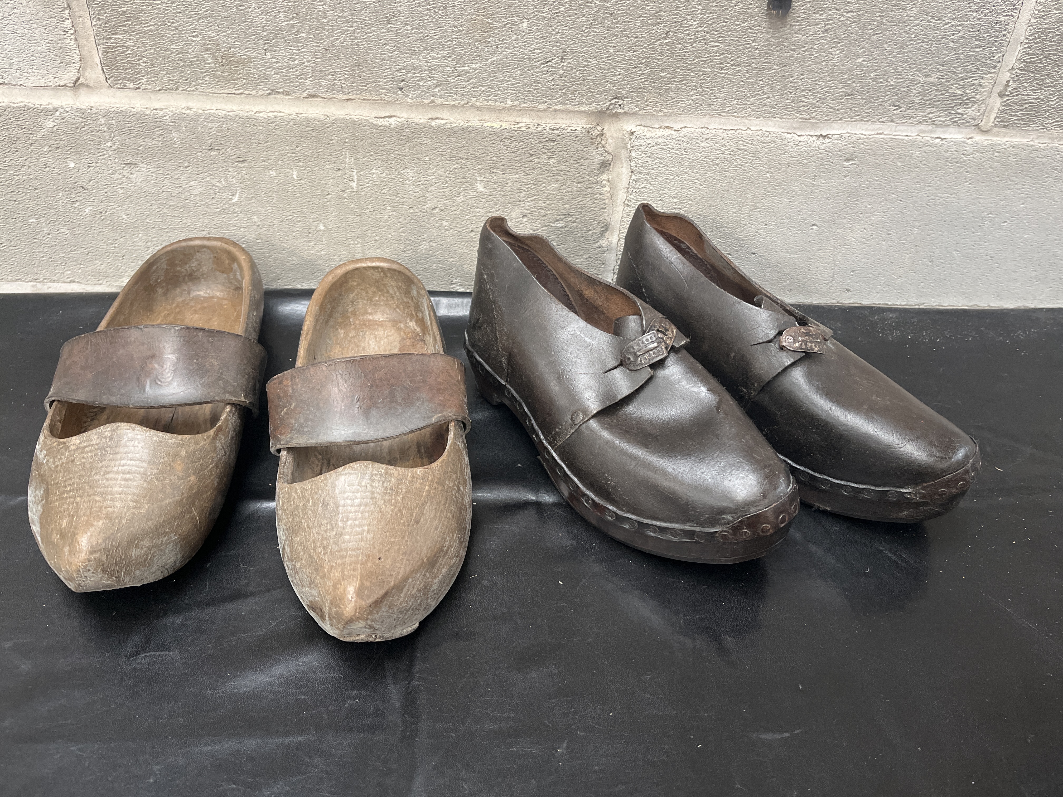 A collection of four pieces of antique working footwear, comprising two distinct pairs. The style is consistent with 19th and early 20th Century Lancashire Clogs, known for combining wooden soles with leather components. The first pair consists of traditional sabots featuring a carved light brown wood base with a wide, arched dark brown leather strap secured across the vamp. The second pair are low-cut, dark brown shoes, likely constructed of molded leather or treated material over a rigid base. This second pair is characterized by a smooth, dark surface and includes a small, decorative metallic clasp or buckle located near the instep of each shoe. No specific manufacturer markings or translatable text are visible on either pair.