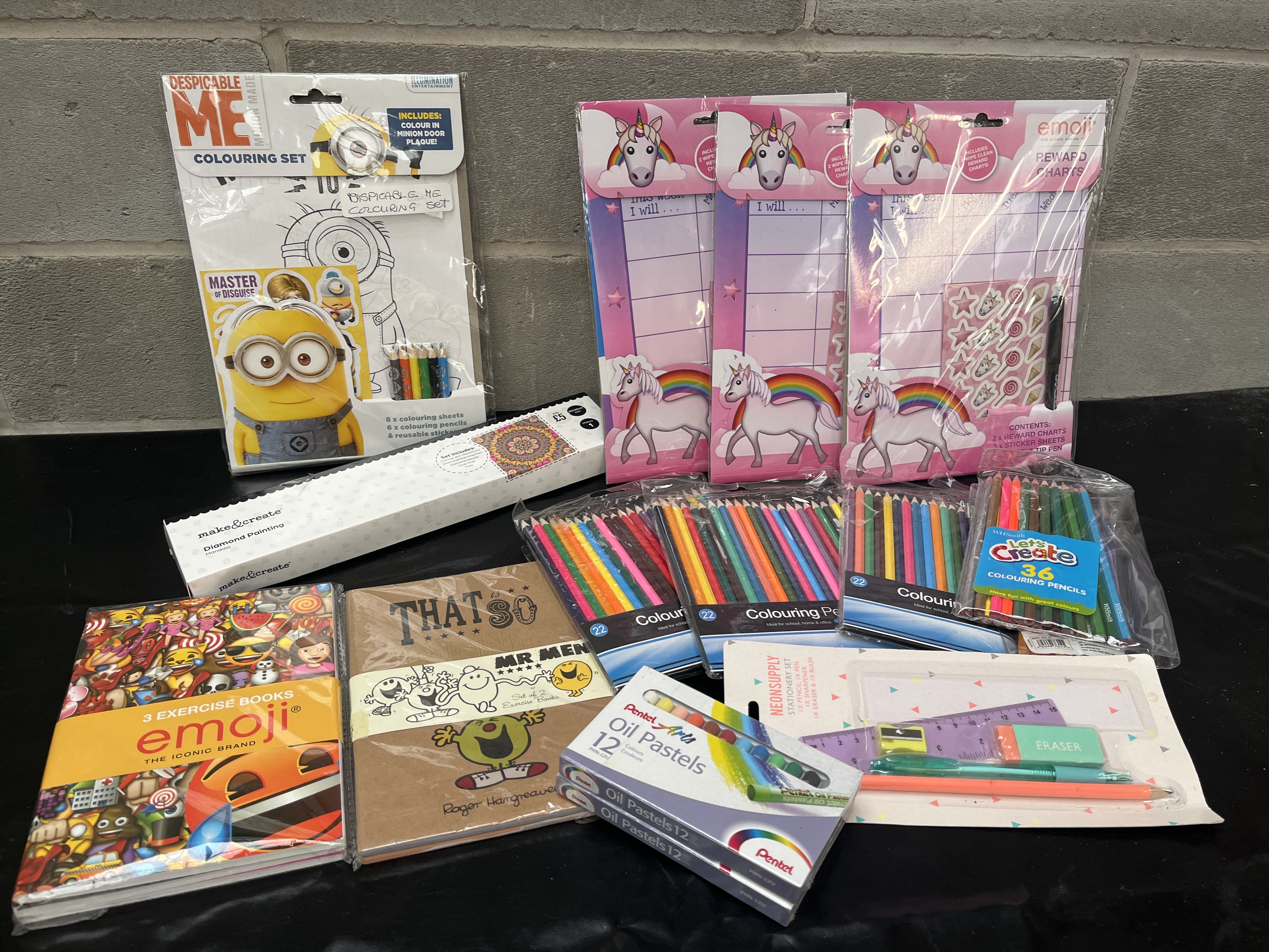 The collection comprises distinct, commercially packaged stationery and activity sets featuring modern licensed themes such as Minions (Despicable Me), Emoji, Unicorns, and Mr. Men/Roger Hargreaves characters. All items appear new and sealed in their original retail packaging. The lot includes three Paper Projects style Unicorn reward charts/sticker packs, one Despicable Me colouring set, one “Make & Create” Diamond Painting set, one box of Pentel Arts 12 Oil Pastels, and one Neon Supply stationery set (including ruler, eraser, and pencil). Also included are two separate packs of 22 assorted colouring pencils, one pack of 36 coloured pencils, one set of three Emoji-themed exercise books, and one set of three Mr. Men/Roger Hargreaves exercise books. Materials consist primarily of various plastics, paper, cardboard, and wooden pencils.