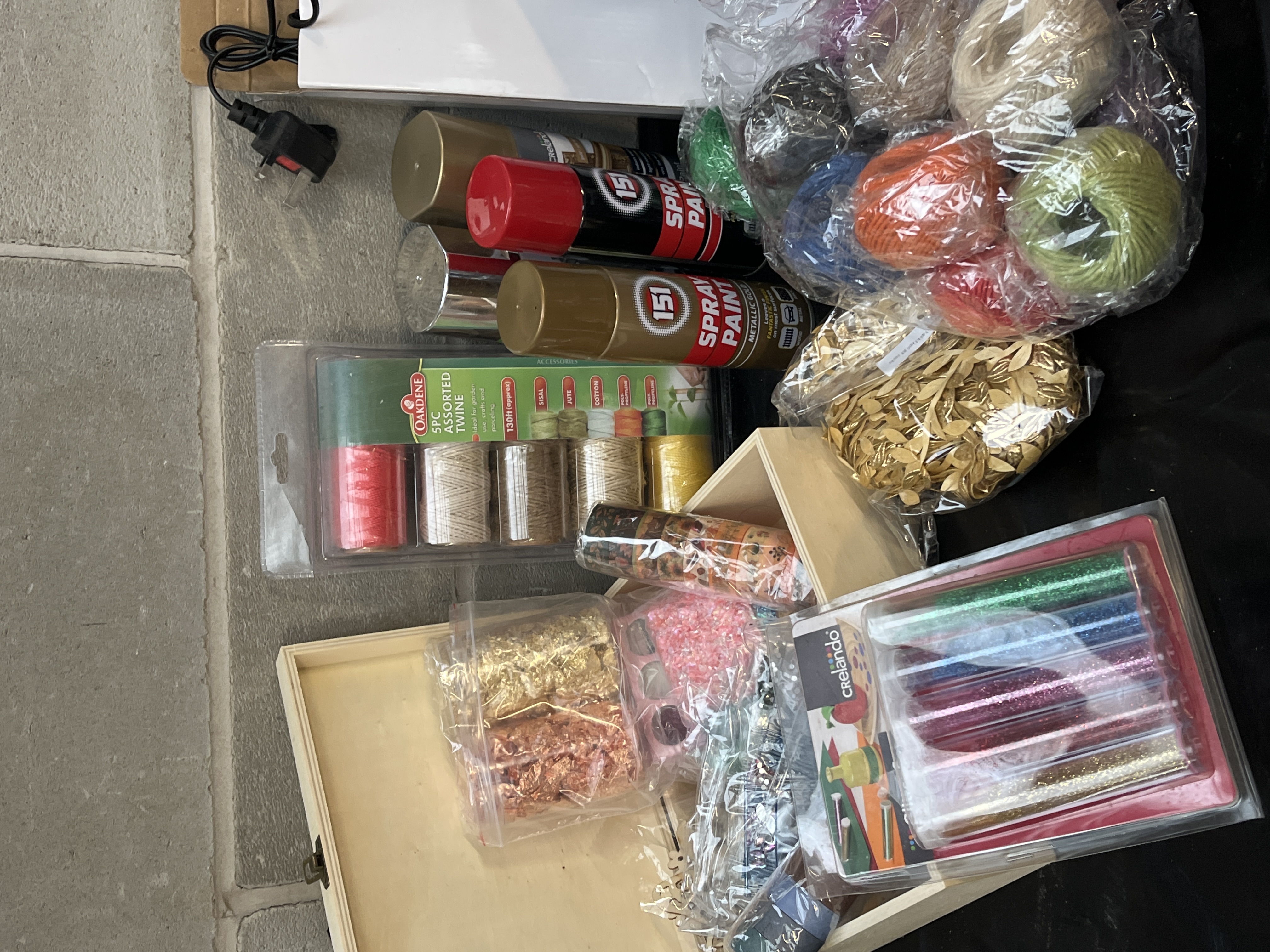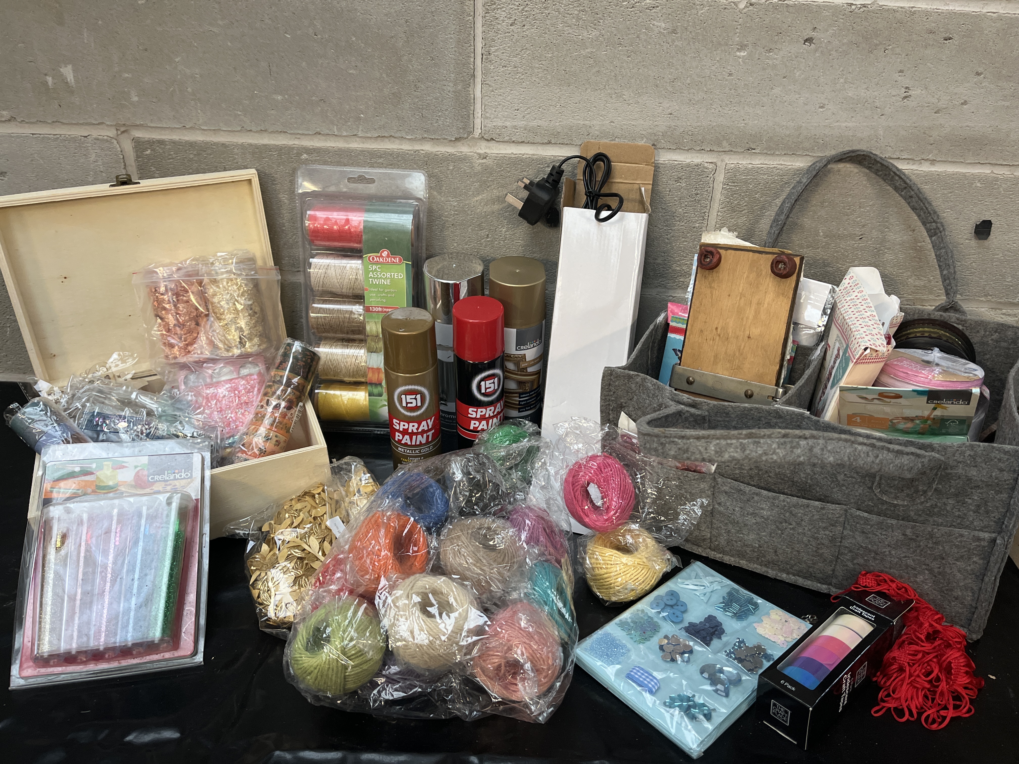 A collection of individually packaged sets and loose items of contemporary craft materials and hobby supplies, primarily focused on yarn, thread, and embellishments, consistent with lots found on major online marketplaces. The collection includes a variety of components for knitting, crocheting, and general crafting. Notable items include four cans of 151 Spray Paint in red, metallic gold, and bronze finishes. The lot also features an Oardene packaged set of assorted twines (Sisal, Hemp, Jute, Cotton), numerous individual balls and bags of colored twine and yarn, a crelando set of colored glitter tubes, packages containing metallic foil pieces and sequins, a sealed package of small blue and clear craft embellishments, and a black box labeled “6 Pcs. Fabric Craft Tape.” Storage solutions include an open, light-toned wooden hinged box containing smaller embellishments and a multi-pocket gray fabric felt tote containing additional materials such as a wooden block tool and assorted spools of ribbon and tape.