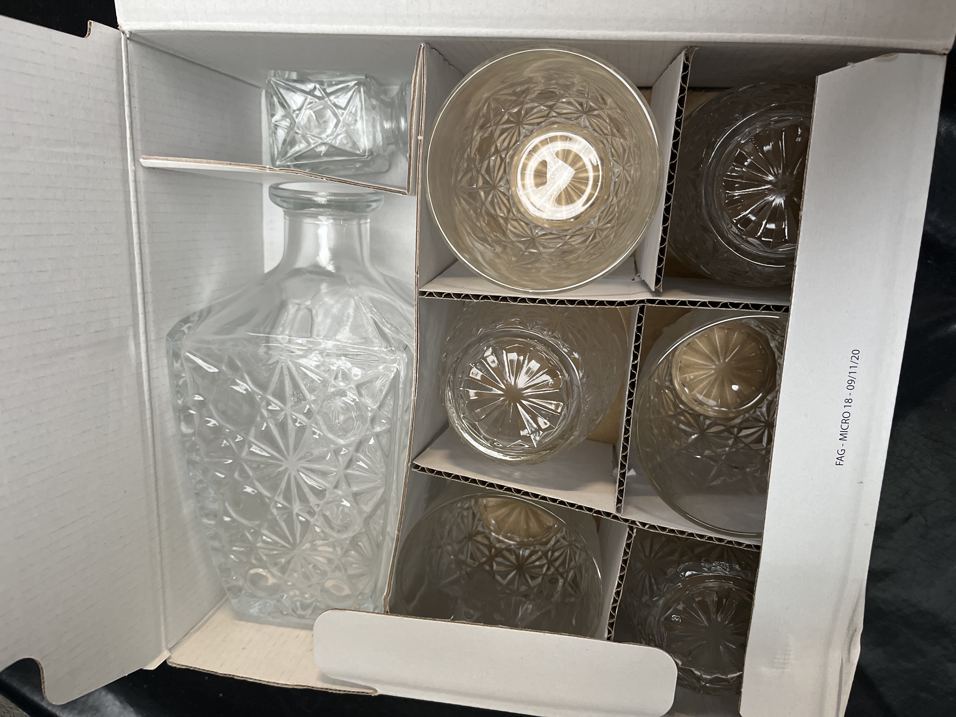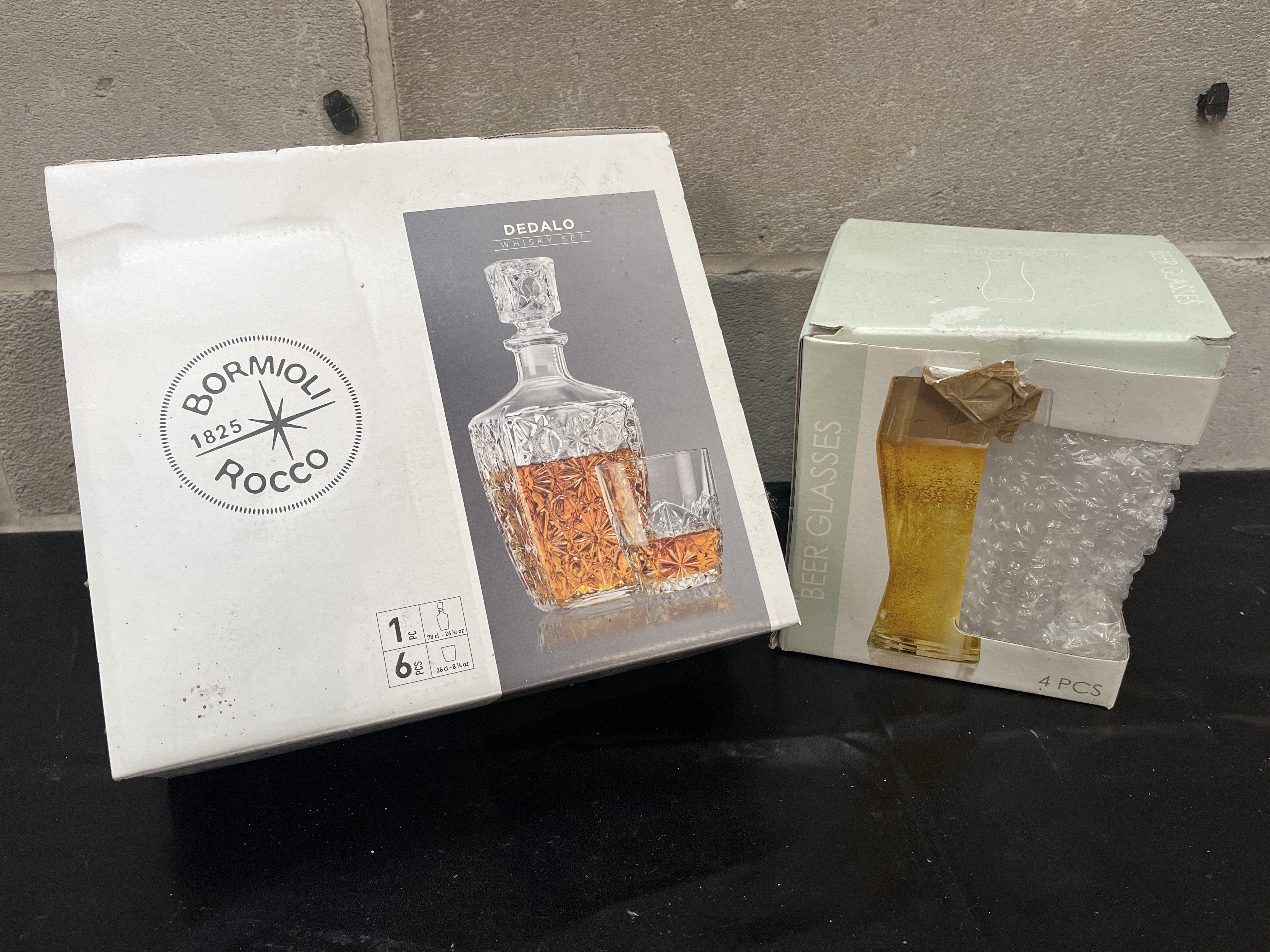 A collection of pieces of commercially packaged clear pressed glassware comprising two distinct sets. The primary set is the Bormioli Rocco “Dedalo” 7-piece whisky set, housed in its original box labeled “BORMIOLI ROCCO 1825” and “DEDALO WHISKY SET.” This set consists of one decanter with a stopper and six short tumblers or rocks glasses. All seven pieces feature a molded geometric, starburst, or diamond-cut pattern consistent with the Dedalo line, which is widely marketed as a whiskey or liqueur set. The second set included in the lot consists of four tall beer glasses, housed in a separate box labeled “BEER GLASSES” and “4 PCS.” The glassware appears to be new, unused stock.