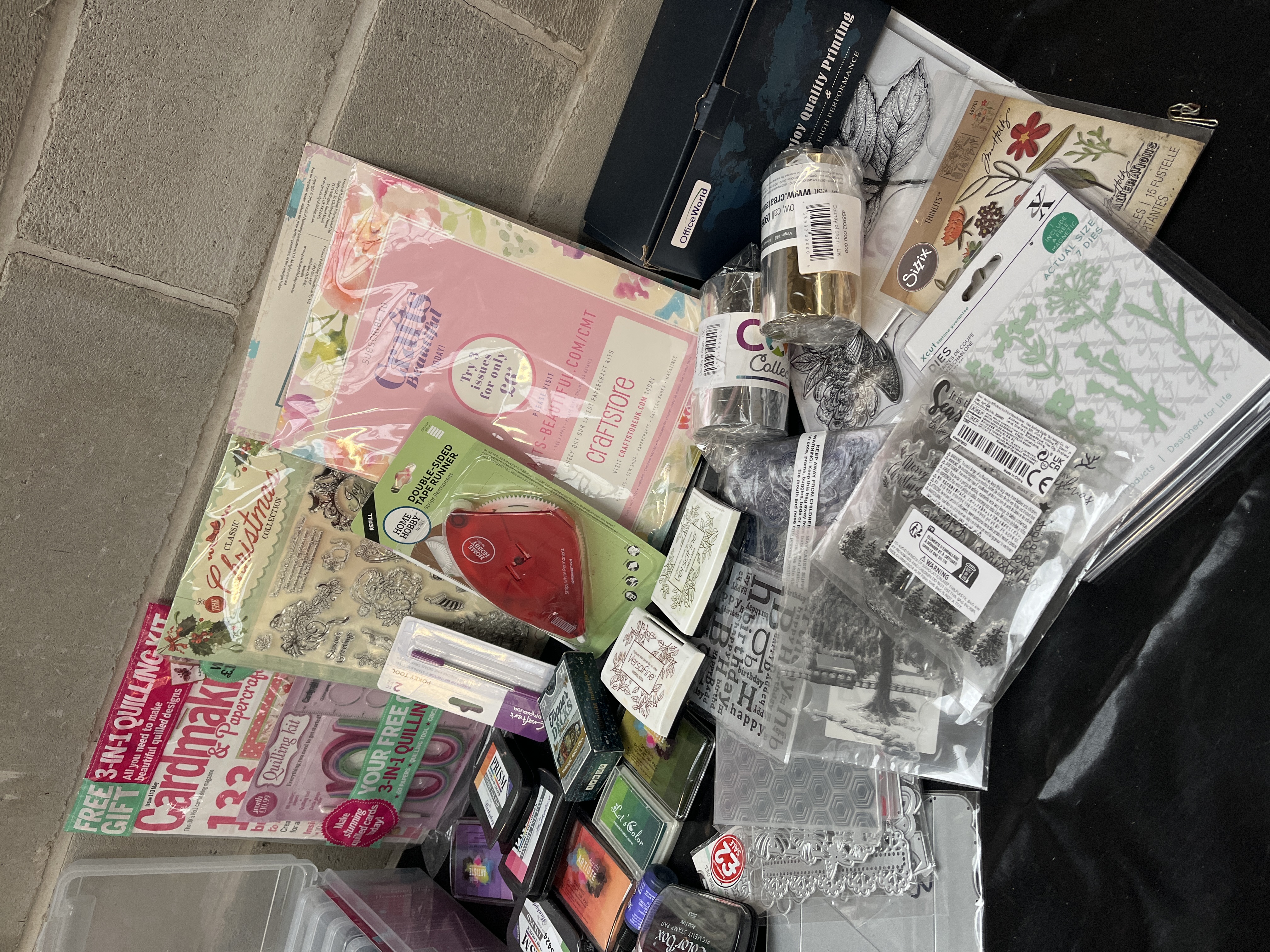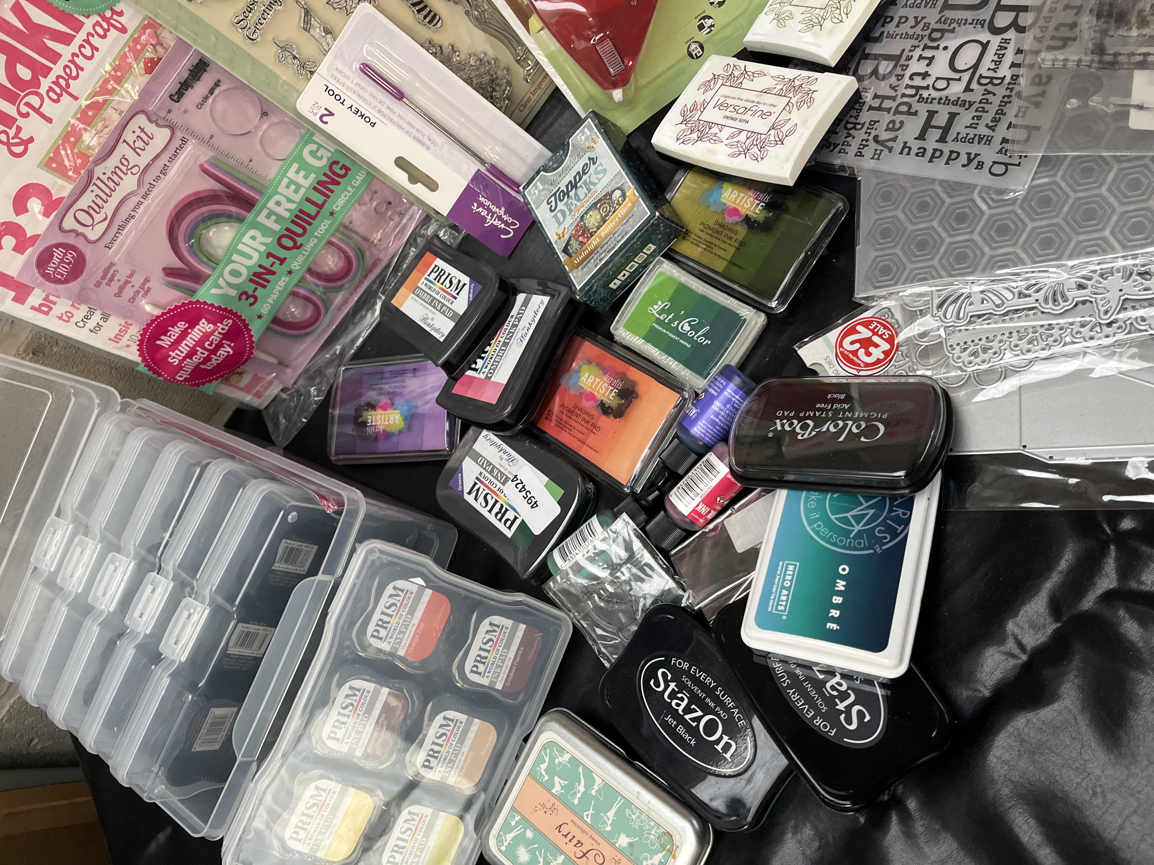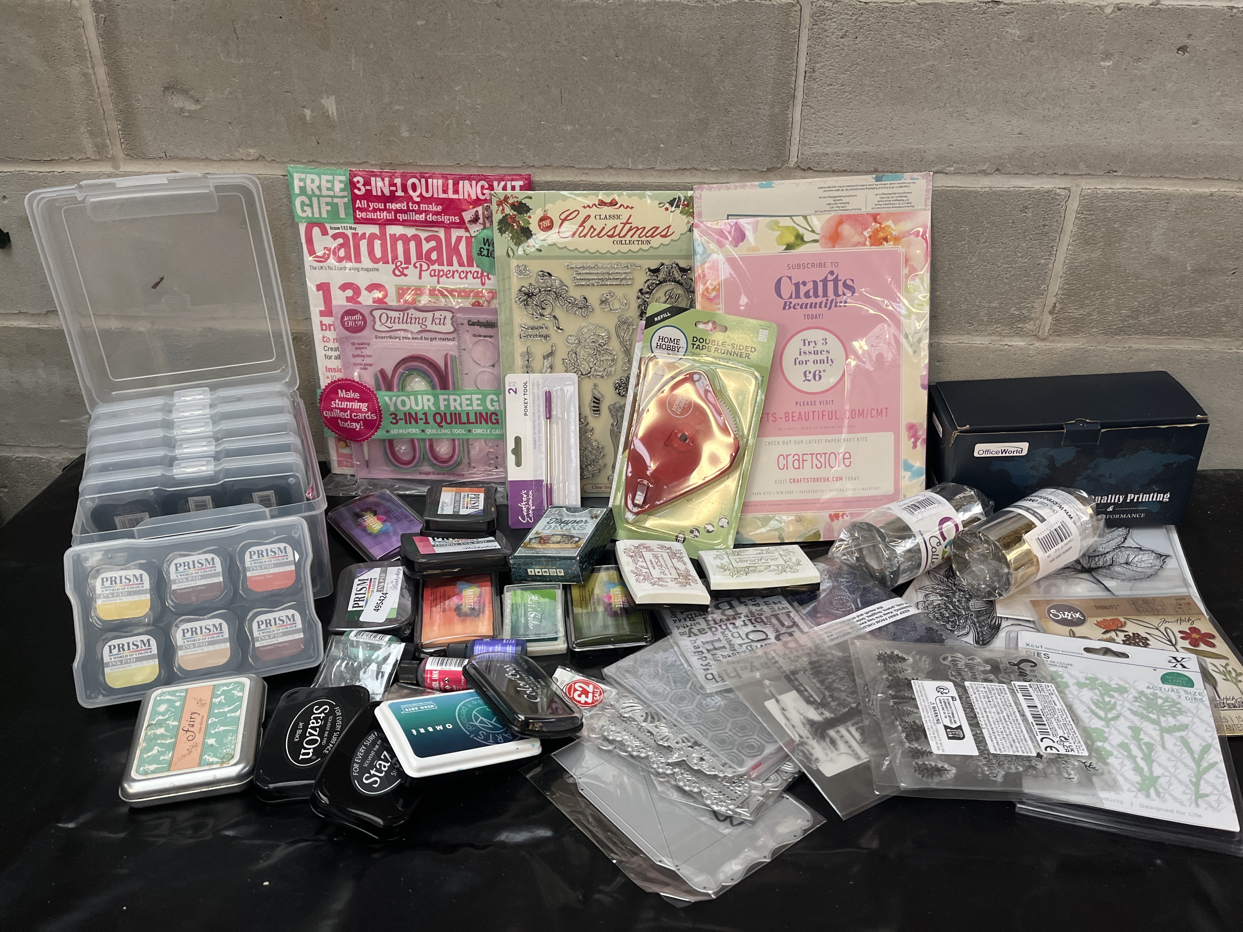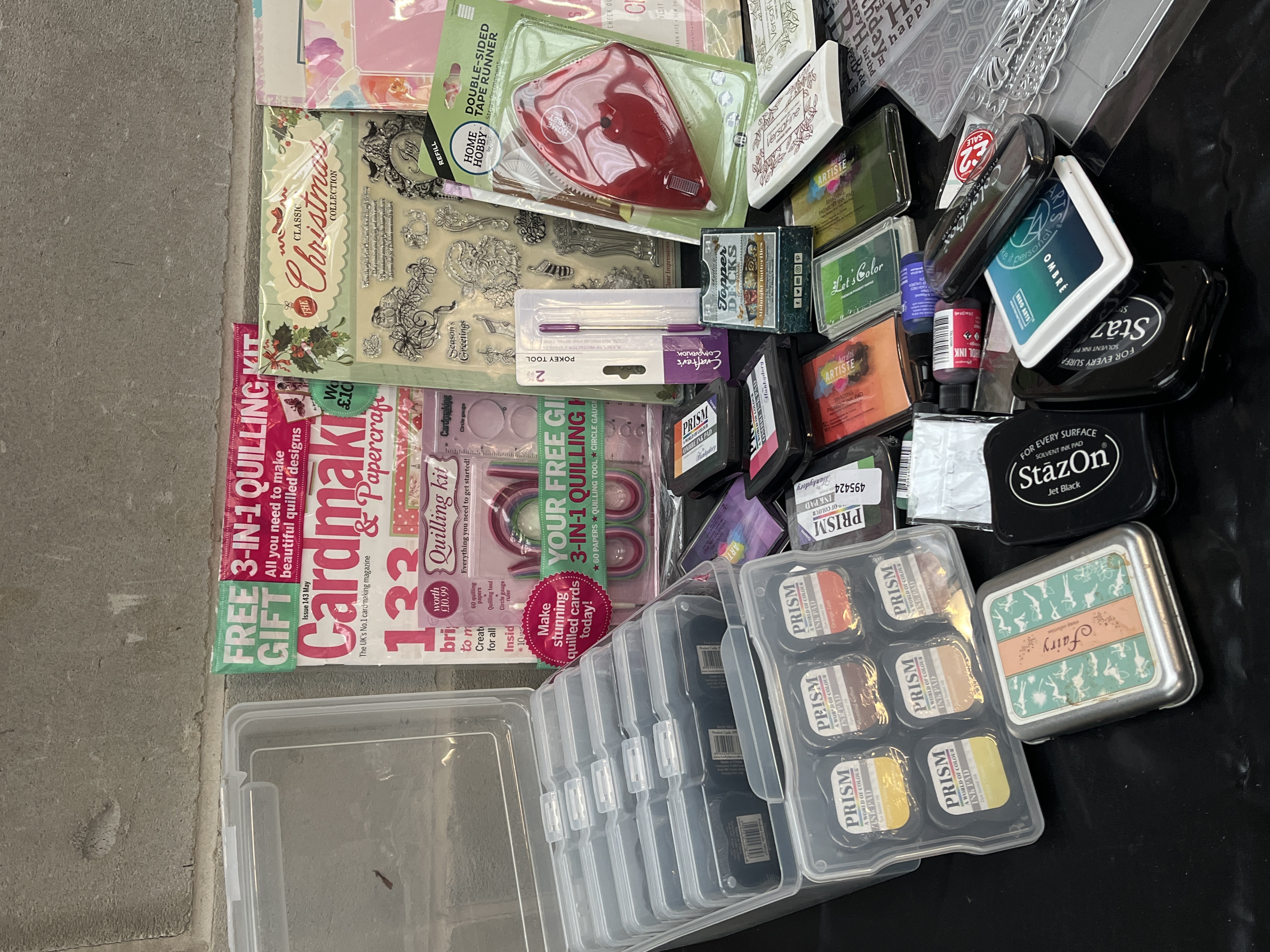 A large collection of items of modern papercrafting and cardmaking supplies, primarily focused on stamping, die-cutting, and ink application. The lot features a wide assortment of materials from recognized brands including PRISM, StazOn, Hero Arts, ColorBox, Artiste, and Sizzix. Key components include a clear plastic storage caddy containing nine individual PRISM metallic ink tins, along with approximately 14 loose ink pads from various brands such as StazOn, Hero Arts Ombre, ColorBox, and Artiste. The lot also contains two small ink refill bottles and a large PRISM ‘Fairy’ ink tin. Die-cutting and embossing elements include several packaged metal dies, including Sizzix branded sets, and plastic embossing folders. Stamping materials include several large clear acrylic stamp sets, such as a ‘Classic Christmas Collection’ and a ‘Happy Birthday’ set. Supplemental materials include packaged tools such as a double-sided tape runner and a pokey tool set, two rolls of metallic foil/tape, and crafting magazines/kits, including Cardmaker & Papercraft (featuring a free 3-in-1 quilling kit) and Crafts Beautiful.