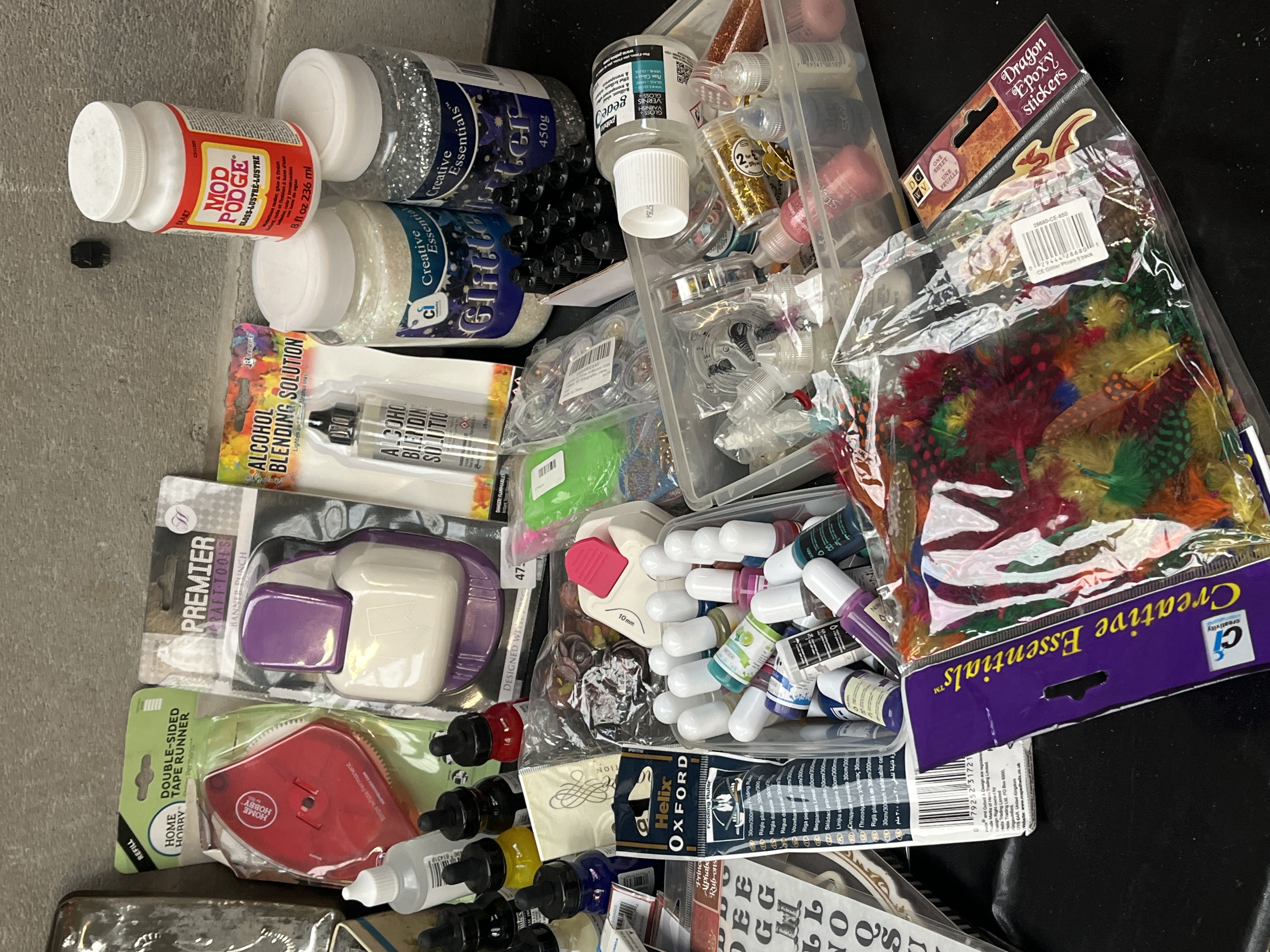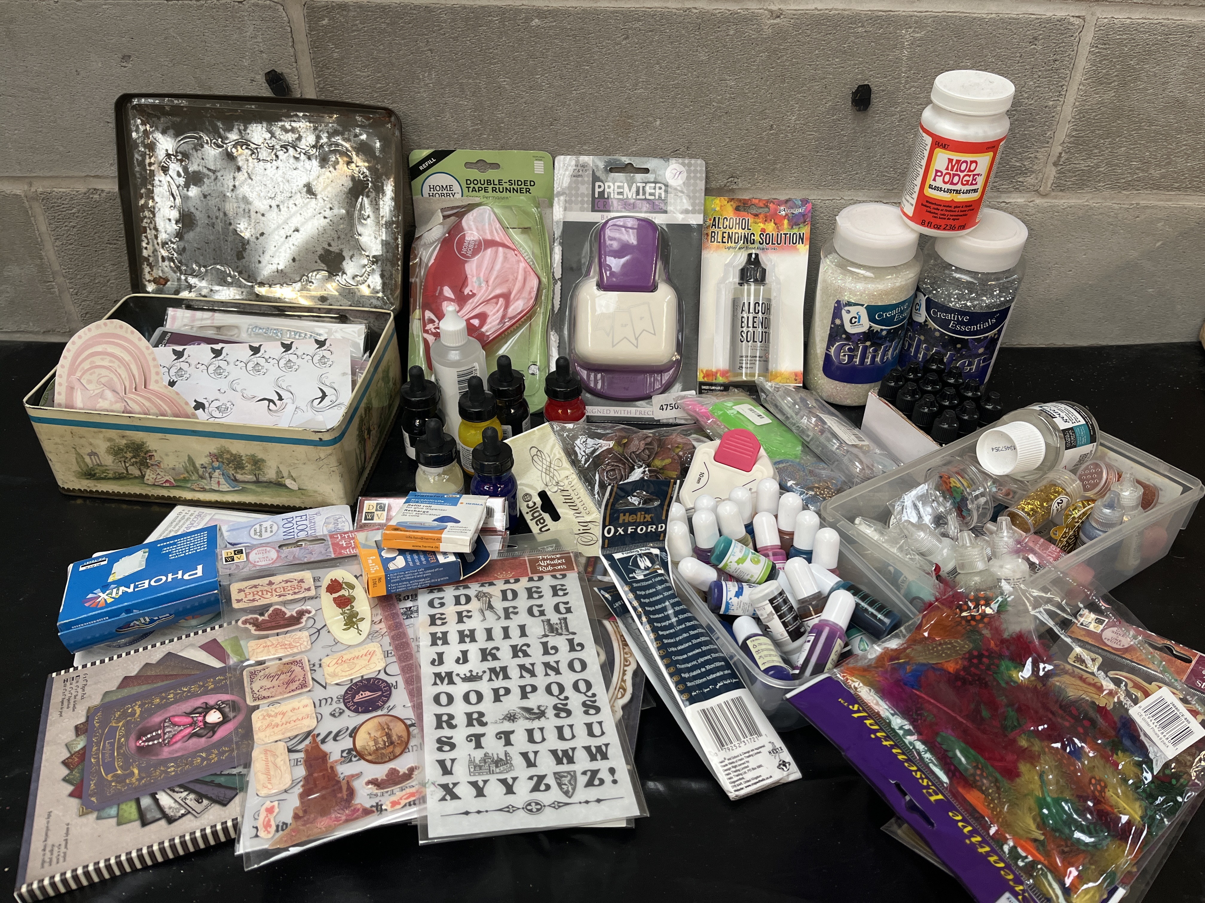 This is a large, mixed lot of contemporary crafting and mixed media supplies, consisting of materials primarily made of plastic, paper, metal, and glass. The collection includes a jar of Mod Podge adhesive, two large jars of Creative Essentials fine glitter (450g each), and various alcohol inks or dyes in dropper bottles, accompanied by a bottle of Alcohol Blending Solution. Tools include a packaged Premier hole punch and a Home Hobby double-sided tape runner. Embellishments feature several sheets of alphabet and decorative stickers/die-cuts, and a packaged assortment of Creative Essentials colored feathers. The lot also contains a clear plastic storage bin holding 23 small bottles of assorted colored polish, paint, or ink, ranging from light pinks to deep purples. Miscellaneous items include a Helix Oxford pencil lead pack, a Phoenix pencil lead box, and a lithographed metal storage tin.