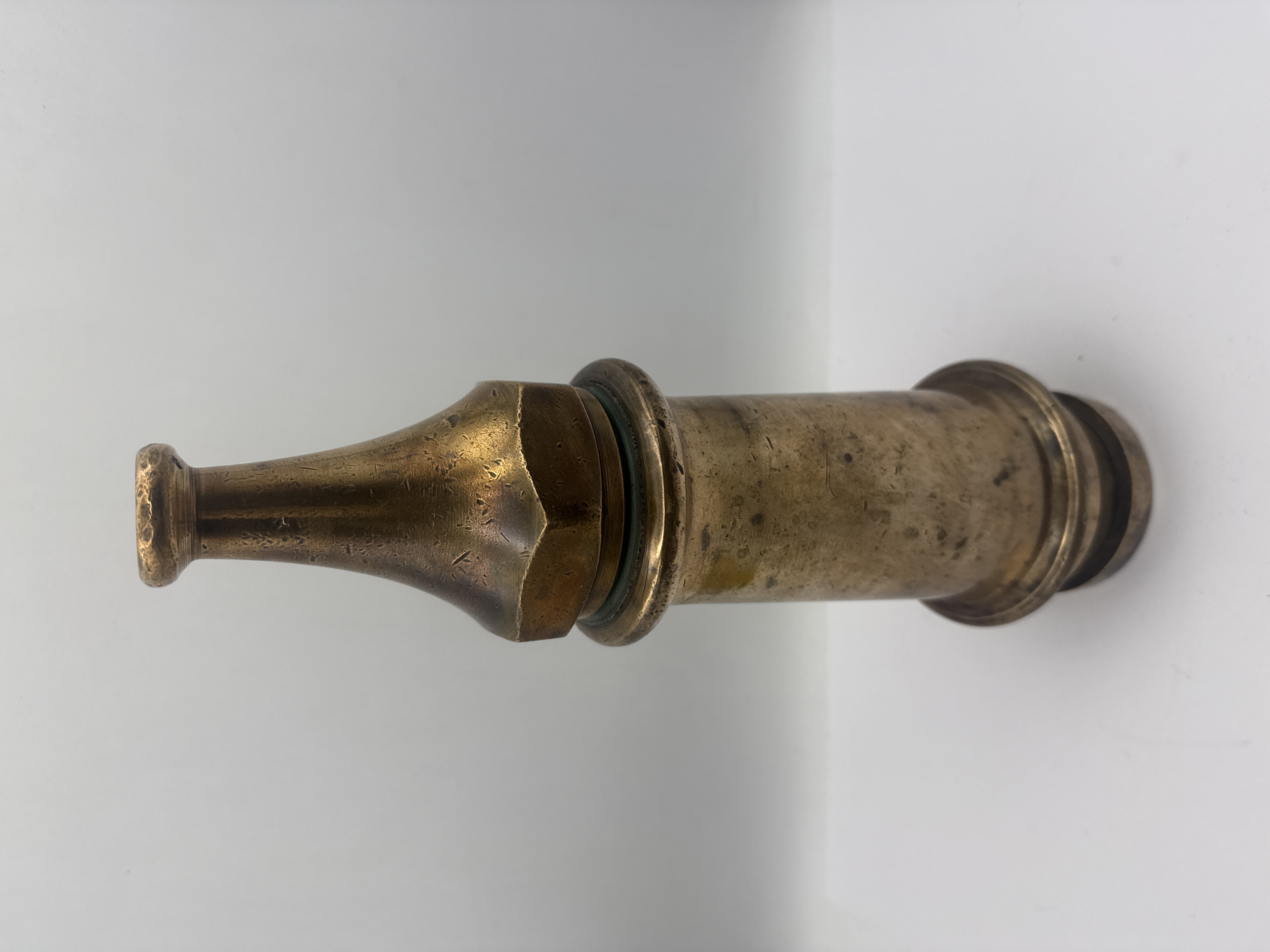 A single vintage or antique fire hose nozzle, constructed of brass or bronze, consistent with utilitarian designs often associated with British fire service equipment from the Interwar and World War II periods. The nozzle features a main cylindrical body segment that flares slightly at the base. The separate nozzle section is characterized by a hexagonal nut below a smooth-bore, tapering conical tip. The overall form is typical of pieces attributed to manufacturers like John Webb & Co Ltd. The item is approximately 11 inches in length.